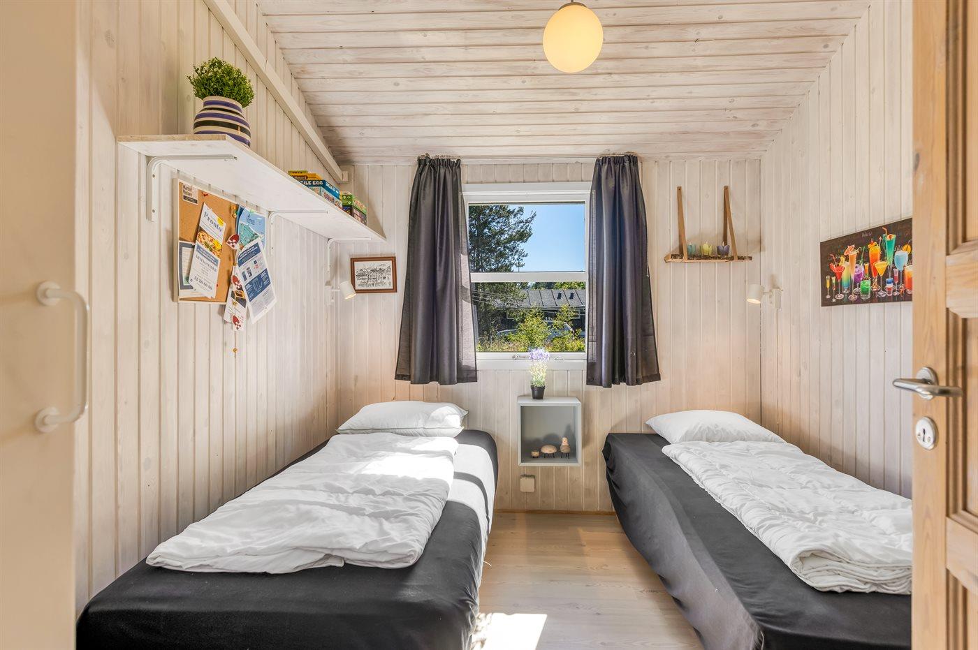 Der er i alt 4 soveværelser. Sovepladserne fordeler sig på: 6 sovepladser i dobbeltsenge. 2 sovepladser i enkeltsenge. Derudover er der 1 stk. barneseng.