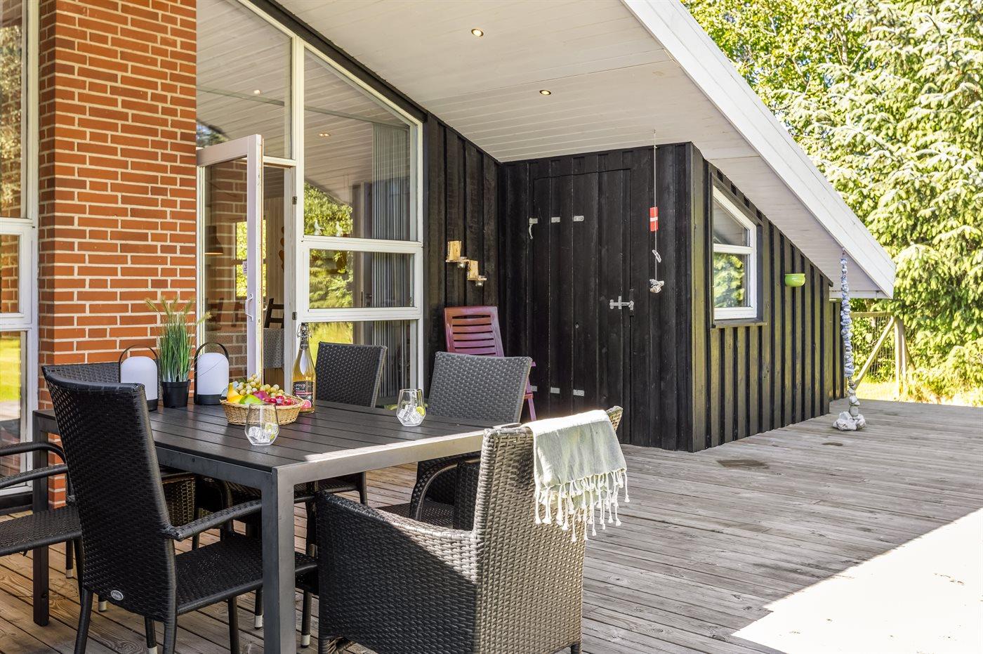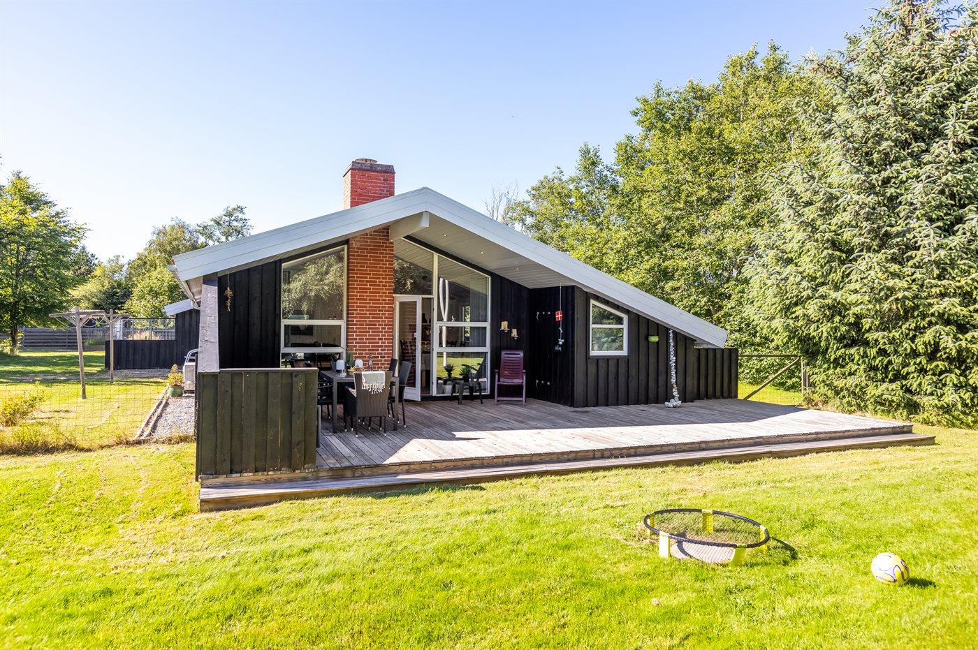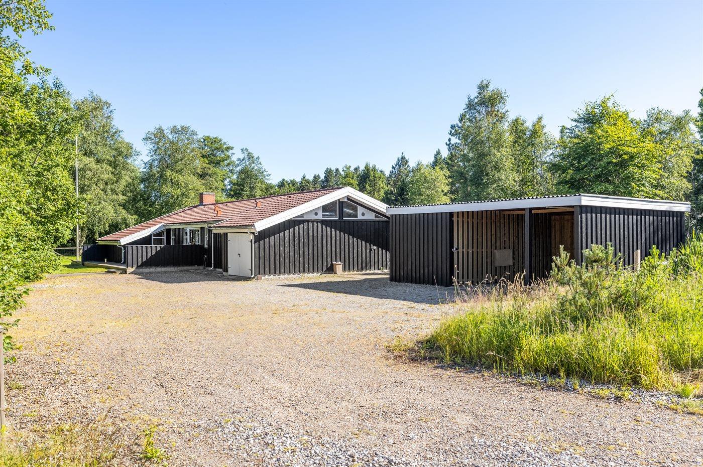 Ferieboligen er beliggende på en 2500 m² stor naturgrund. Der er 600 m til havet. Nærmeste forretning er beliggende i en afstand af 4000 m. Til ferieboligen hører åbent terrasseareal. Desuden er der overdækket terrasse. Der er redskabsrum. Gynge. Rutchebane. Bålsted. Grill til rådighed. Der er installeret stik til opladning af elbil. Med 11 kW ladeeffekt. Parkering ved ferieboligen.