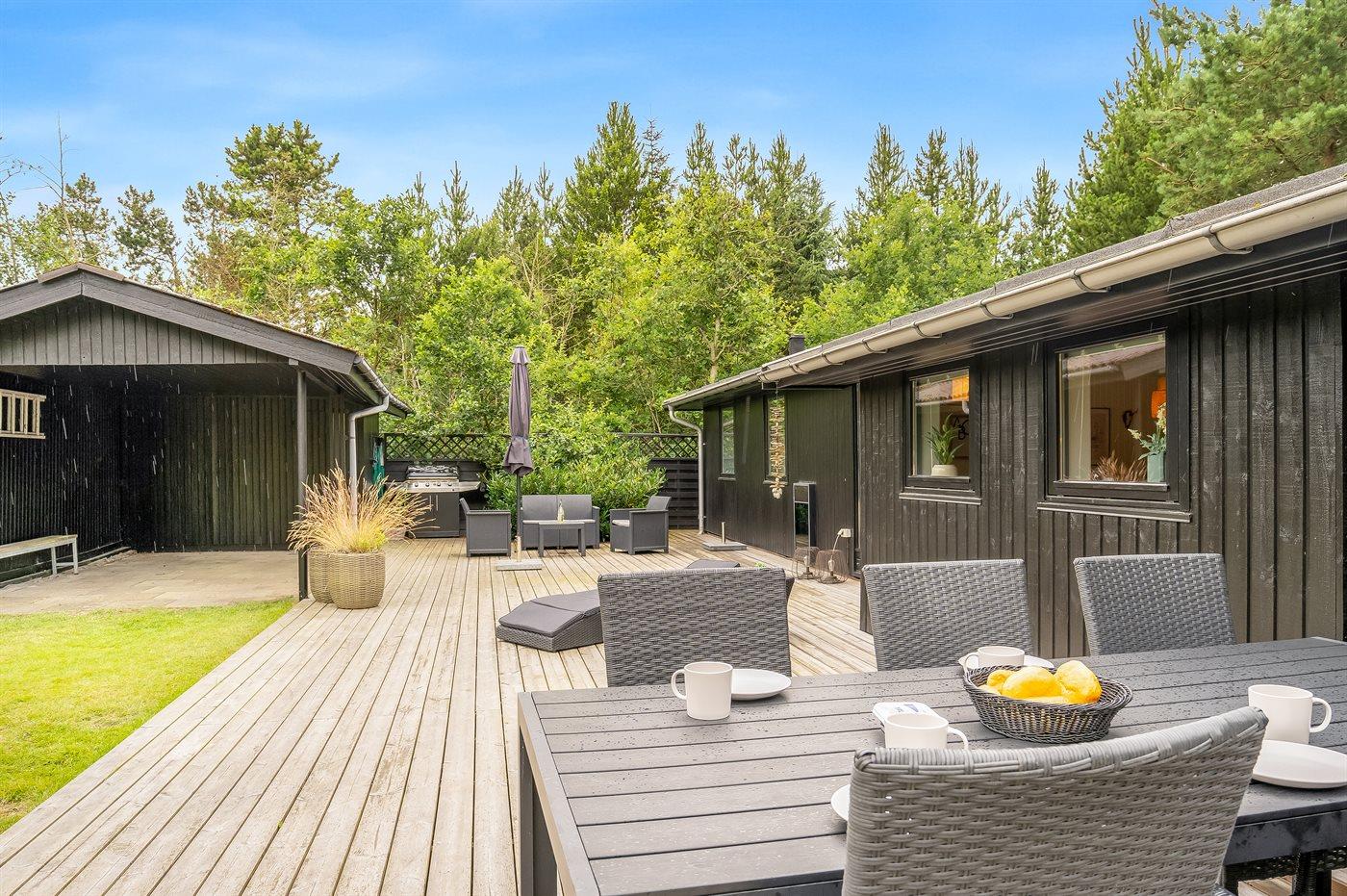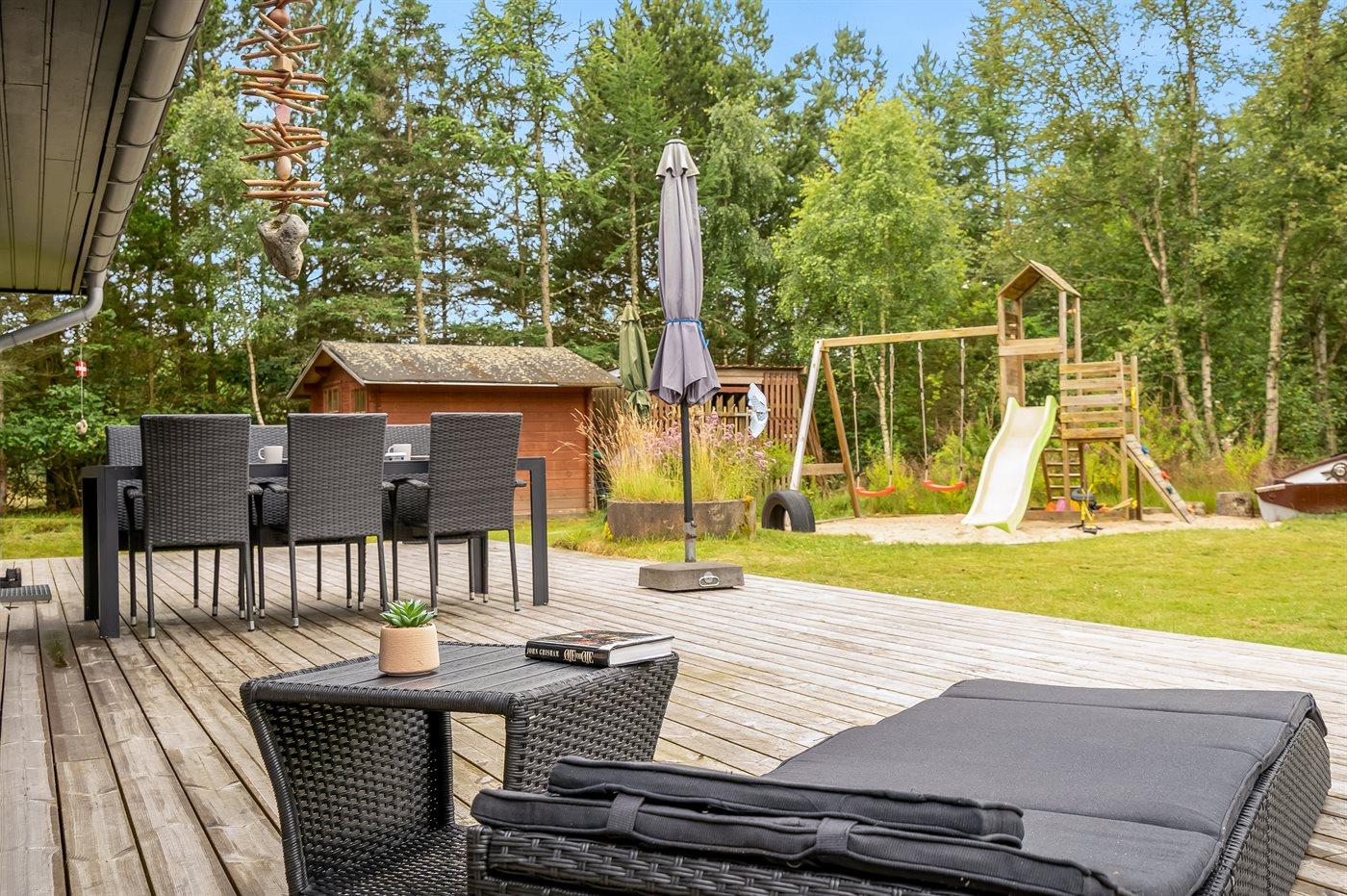 Ferieboligen er beliggende på en 3384 m² stor naturgrund. Der er 400 m til havet. Nærmeste forretning er beliggende i en afstand af 800 m. Til ferieboligen hører åbent terrasseareal. Desuden er der overdækket terrasse. Gynge. Sandkasse. Legetårn. Rutchebane. Grill til rådighed. Der er carport til rådighed. Parkering ved ferieboligen.