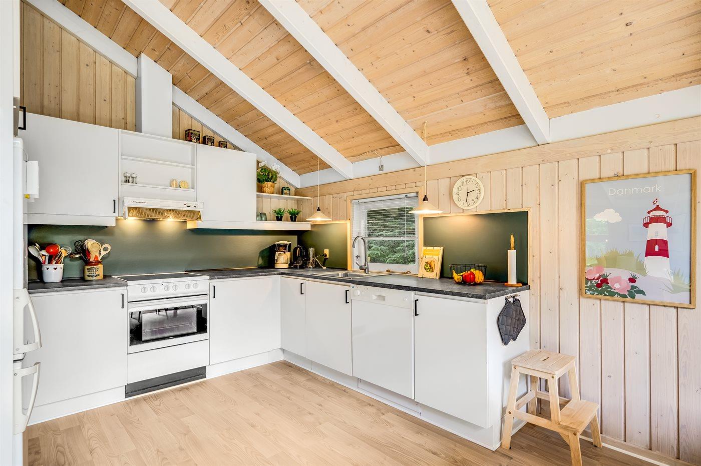 Køkkenet er udstyret med 1 køleskab. Der er 4 elkogeplader, varmluftovn, mikrobølgeovn samt opvaskemaskine.