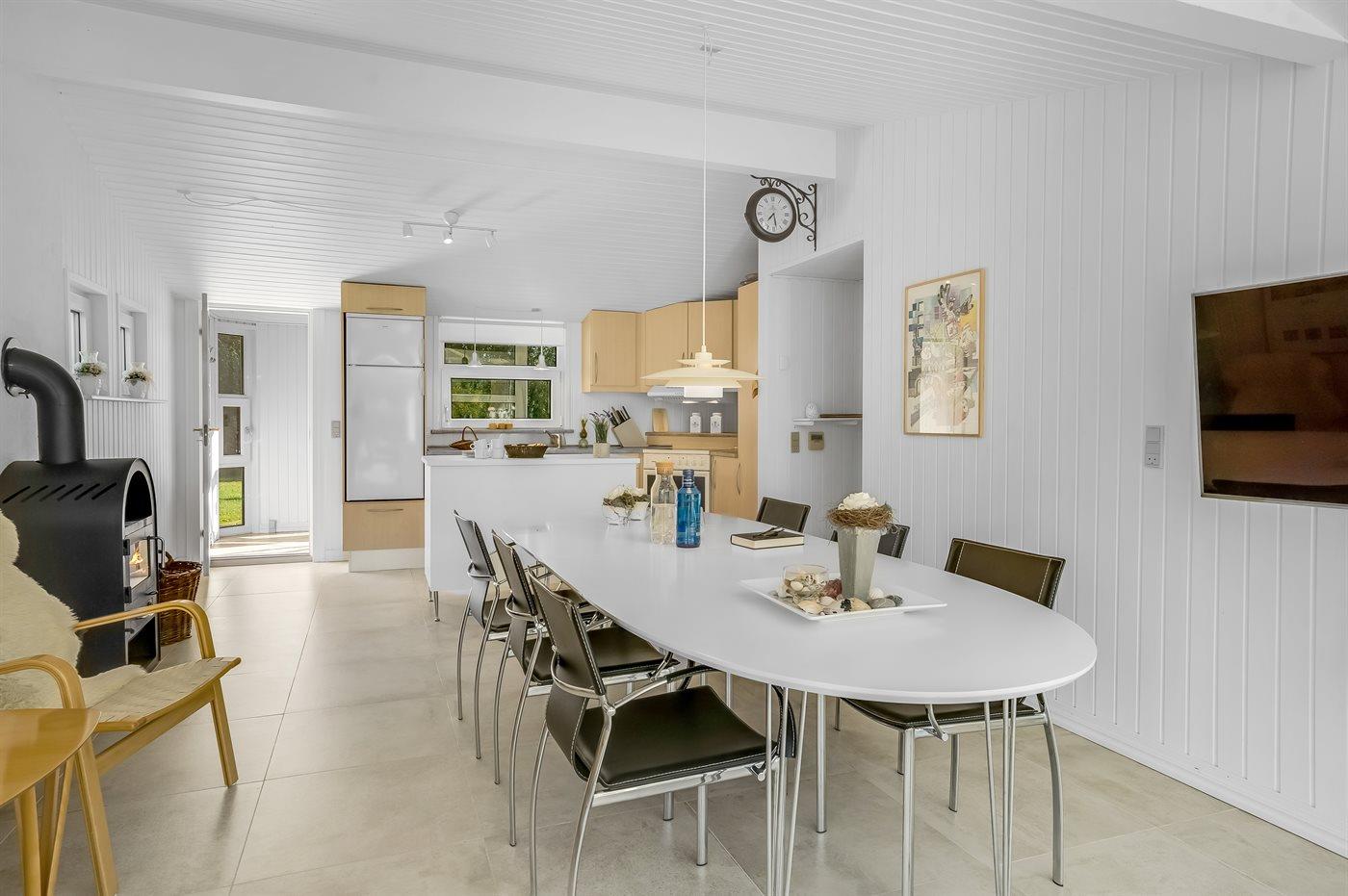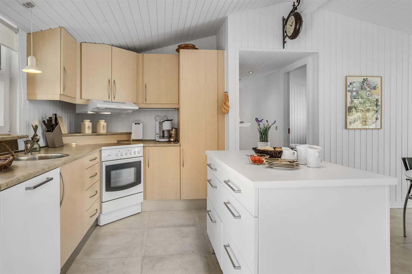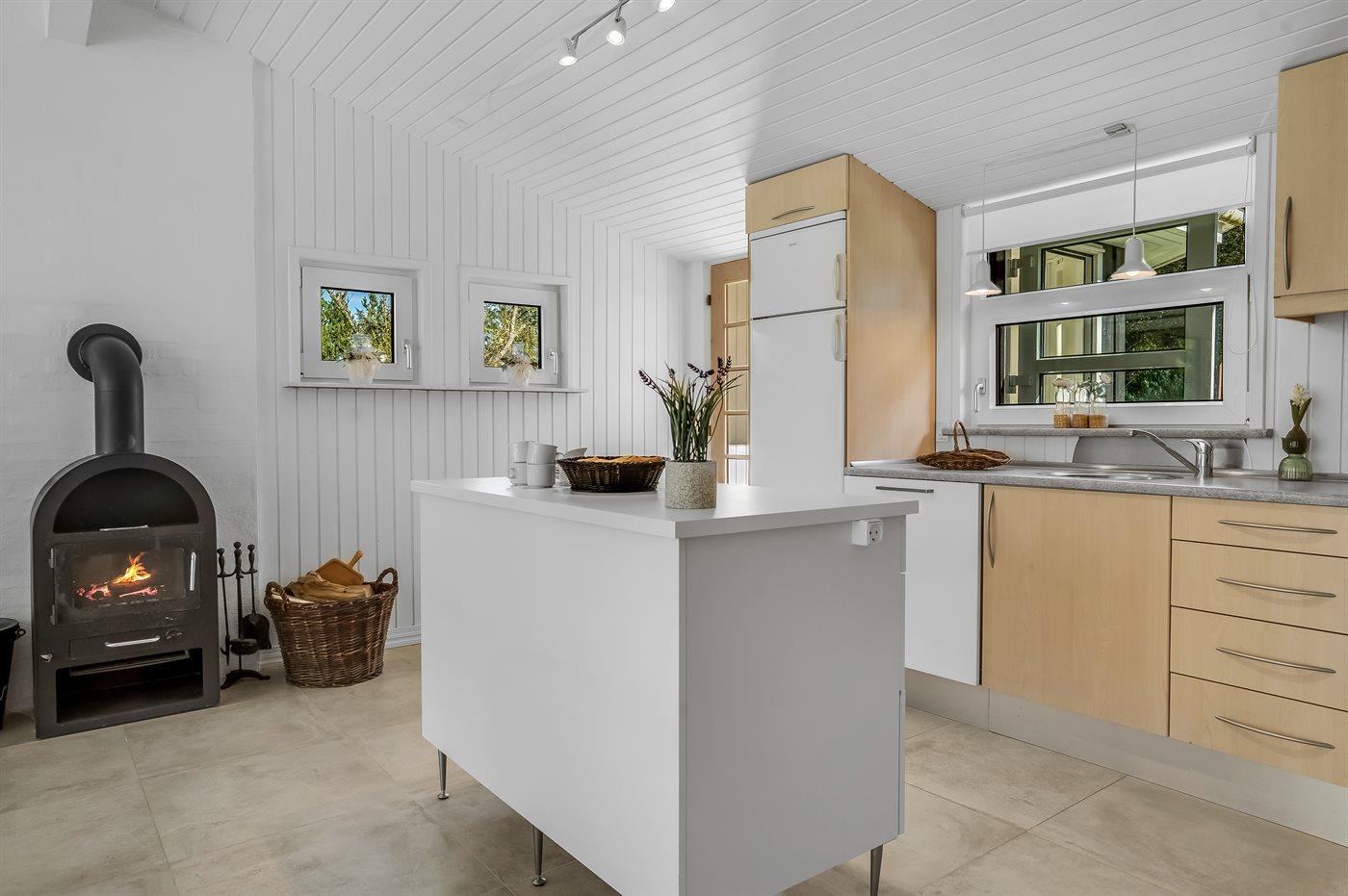Køkkenet er udstyret med 1 køleskab. Der er 4 keramiske kogeplader, varmluftovn, mikrobølgeovn samt opvaskemaskine.