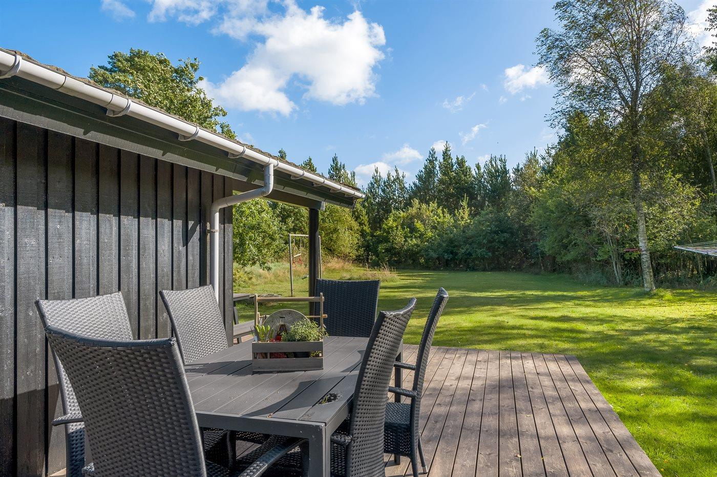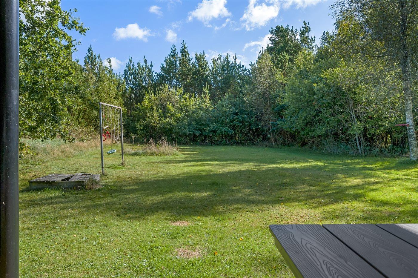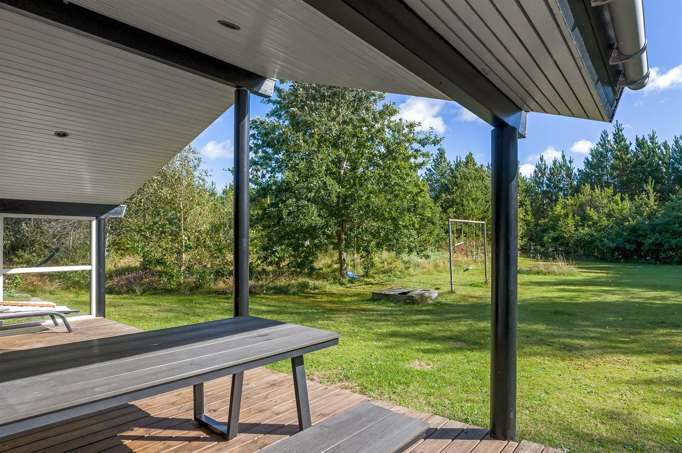Ferieboligen er beliggende på en 2600 m² stor naturgrund. Der er 300 m til havet. Nærmeste forretning er beliggende i en afstand af 775 m. Til ferieboligen hører åbent terrasseareal. Desuden er der overdækket terrasse. Gynge. Fodboldmål. Udendørs bruser. Grill til rådighed. Der er installeret stik til opladning af elbil. Parkering ved ferieboligen.