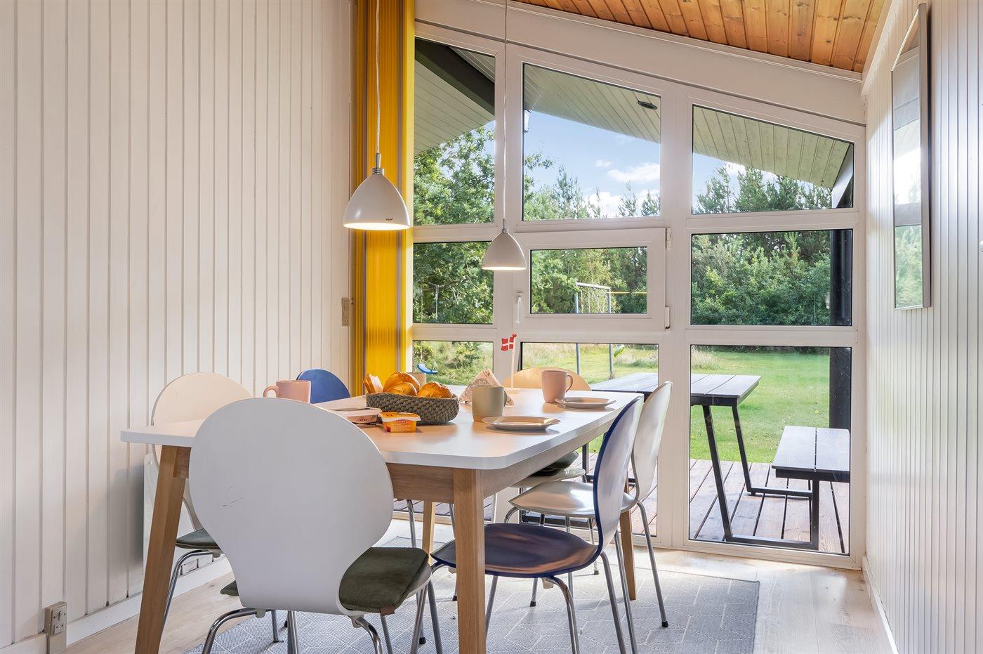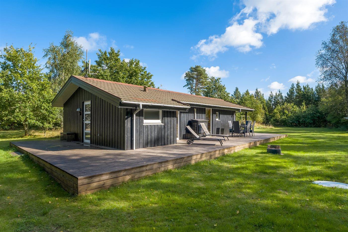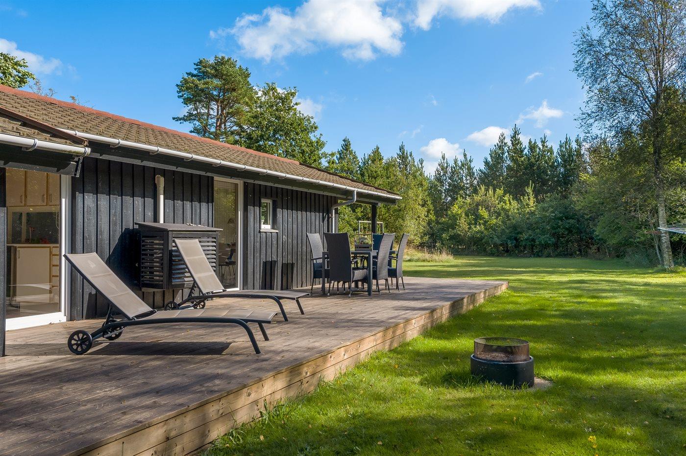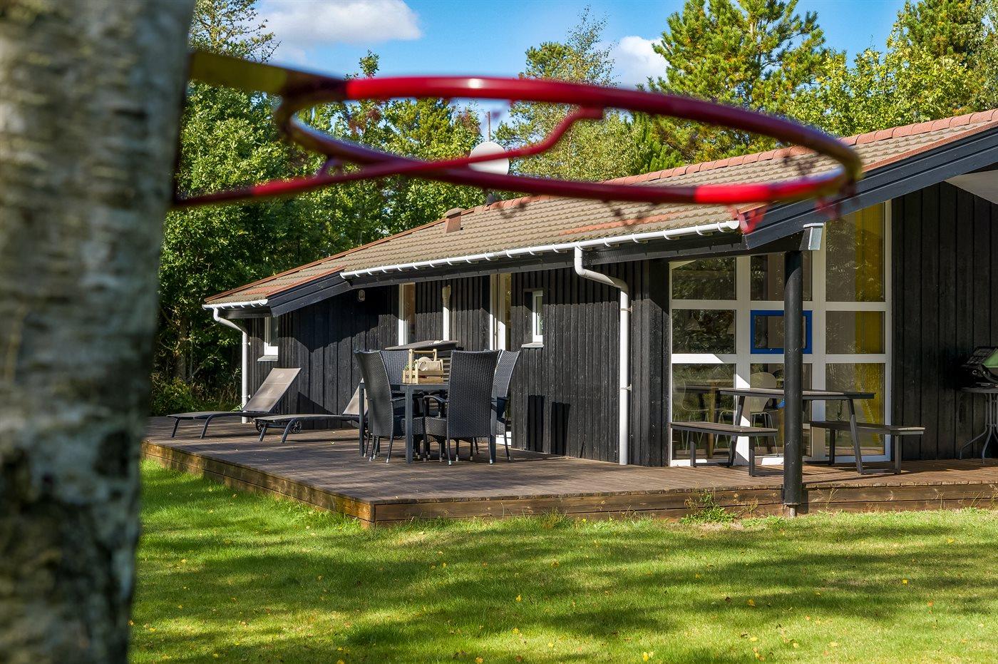 Ferieboligen er beliggende på en 2600 m² stor naturgrund. Der er 300 m til havet. Nærmeste forretning er beliggende i en afstand af 775 m. Til ferieboligen hører åbent terrasseareal. Desuden er der overdækket terrasse. Gynge. Fodboldmål. Udendørs bruser. Grill til rådighed. Der er installeret stik til opladning af elbil. Parkering ved ferieboligen.