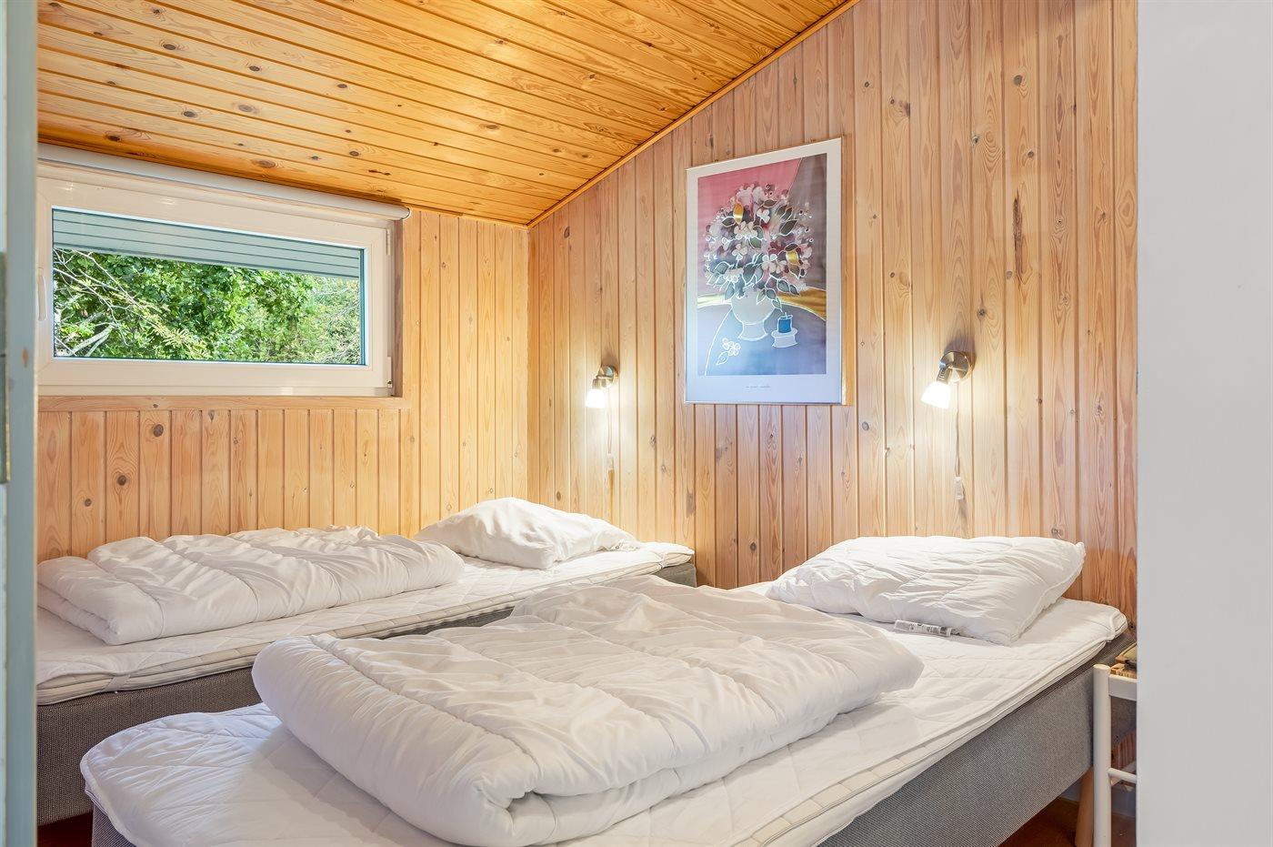 Der er i alt 3 soveværelser. Sovepladserne fordeler sig på: 2 sovepladser i dobbeltseng. 2 sovepladser i enkeltsenge. 2 sovepladser i køjeseng. Derudover er der 1 stk. barneseng.