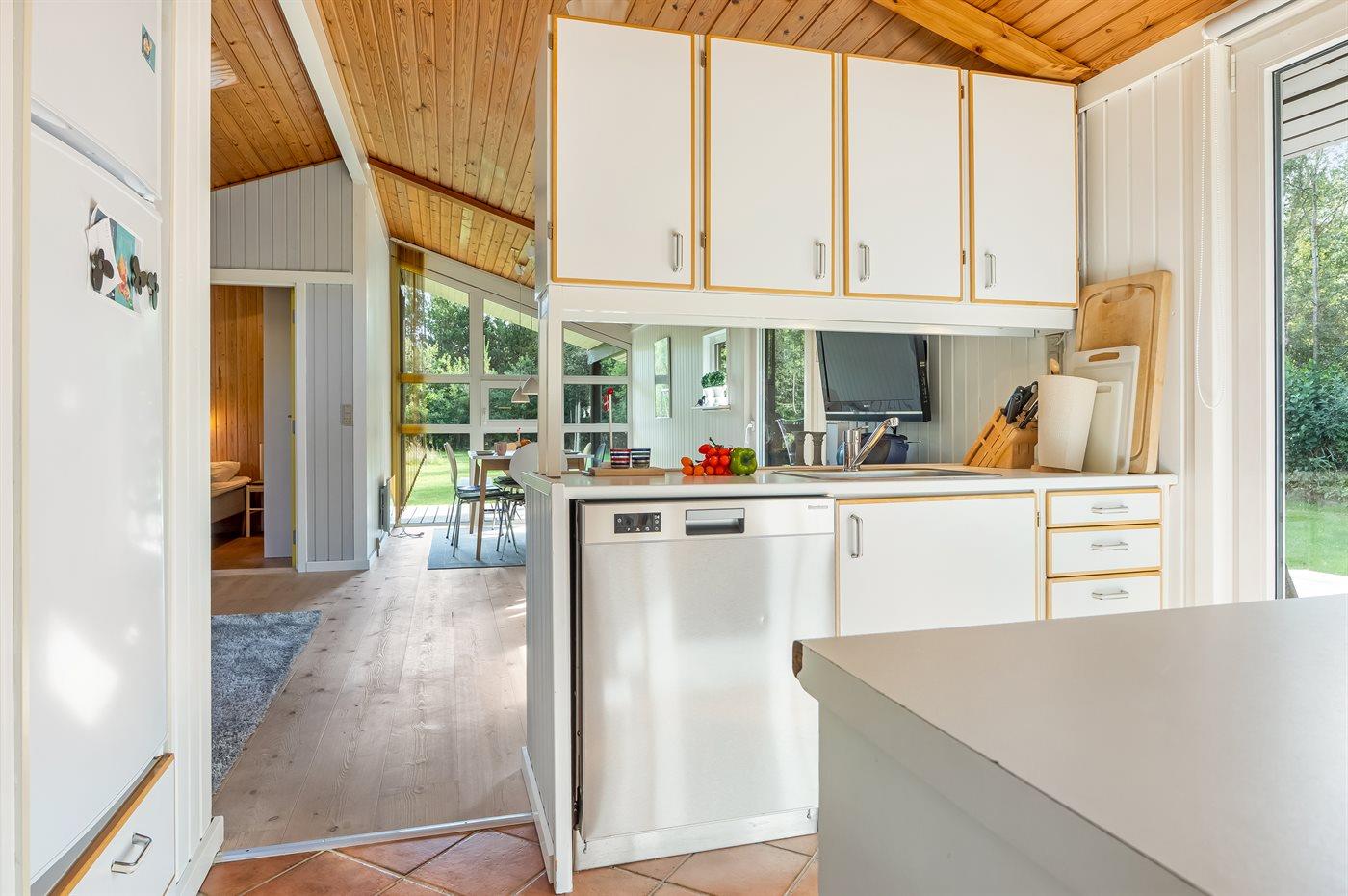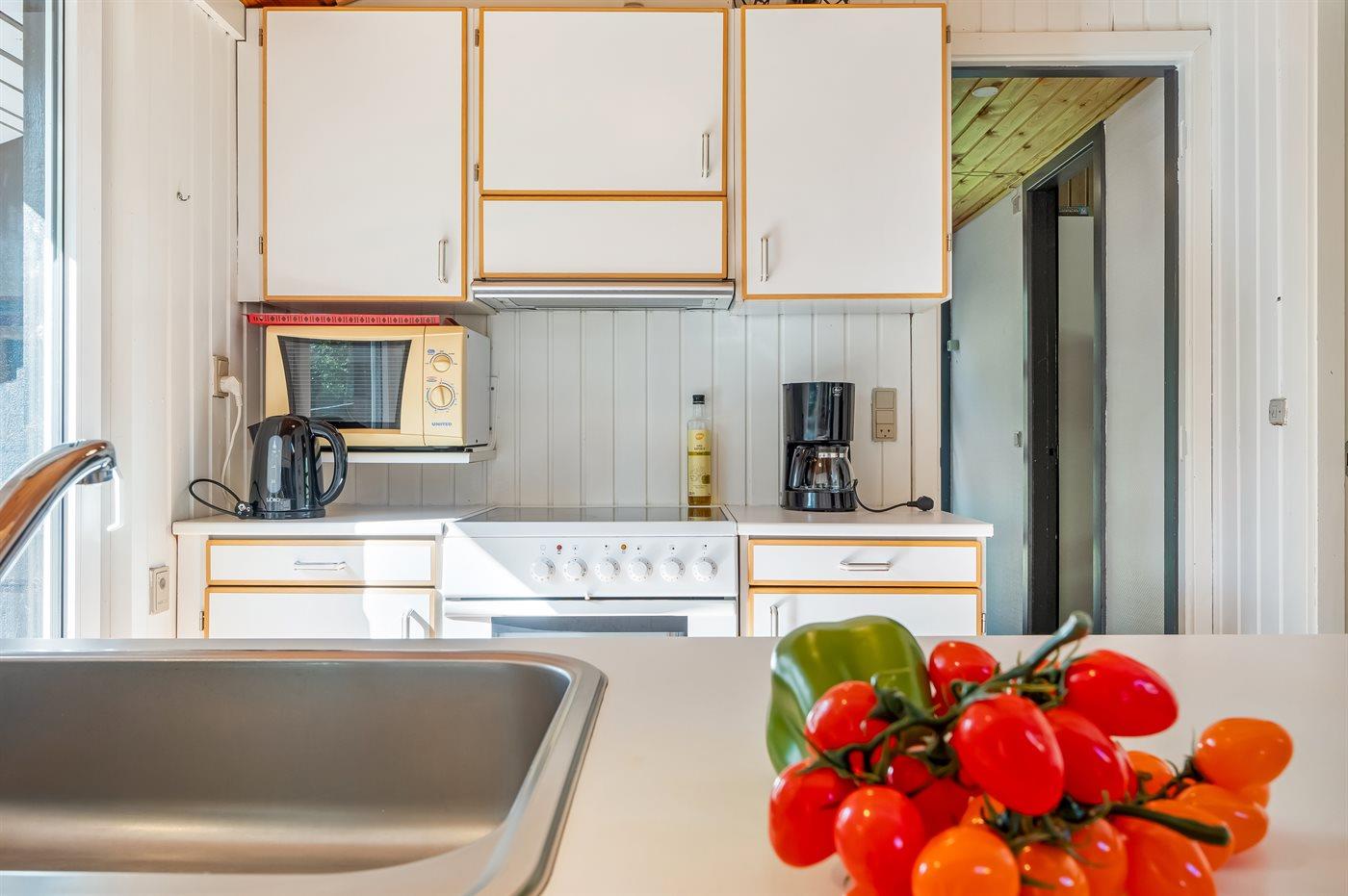 Køkkenet er udstyret med 1 køleskab. Der er 4 keramiske kogeplader, varmluftovn, mikrobølgeovn samt opvaskemaskine.