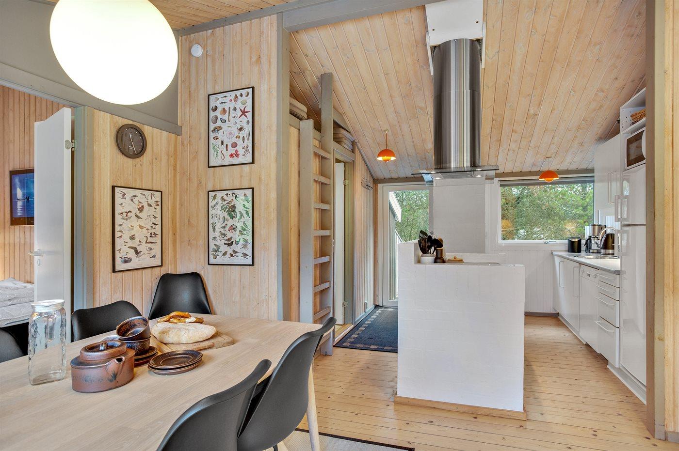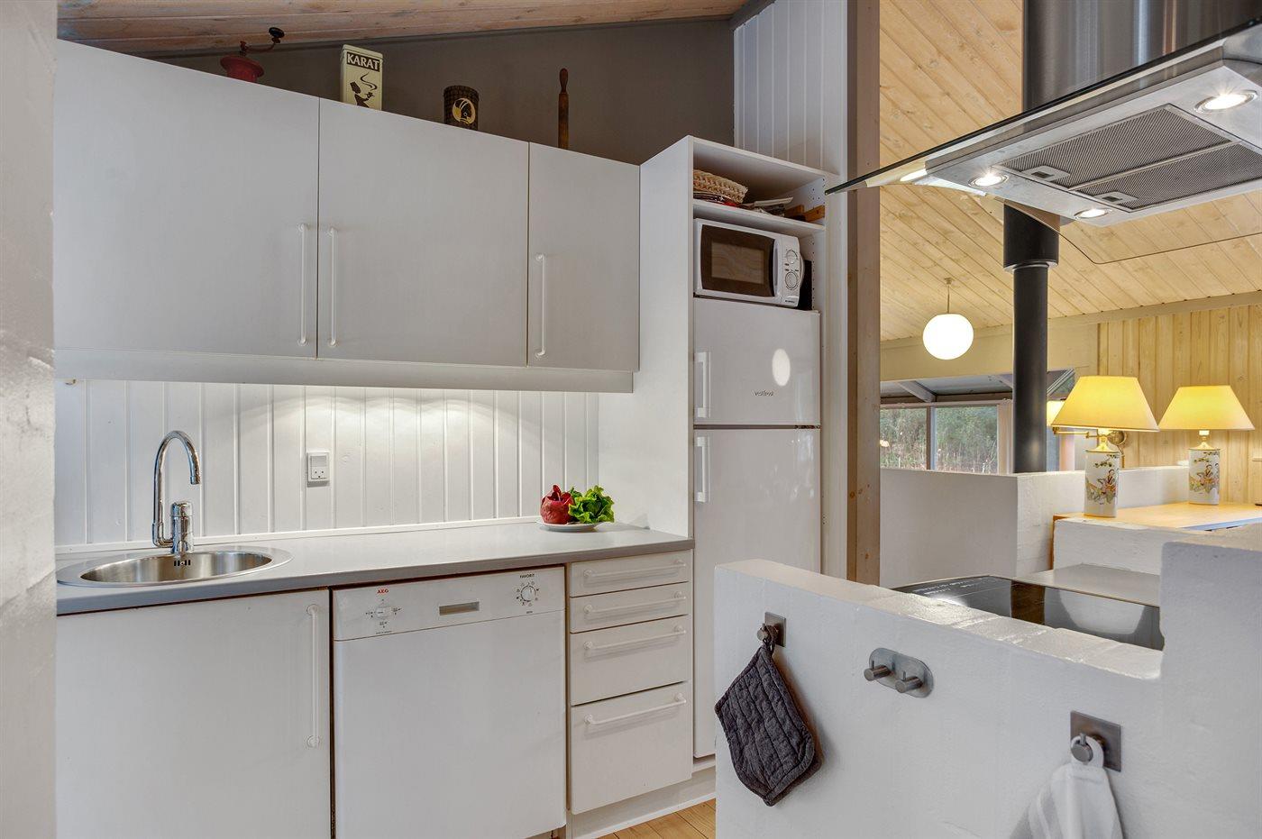 Køkkenet er udstyret med 1 køleskab. Der er 4 induktionskogeplader, varmluftovn, mikrobølgeovn samt opvaskemaskine.