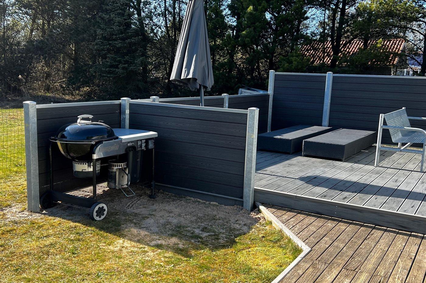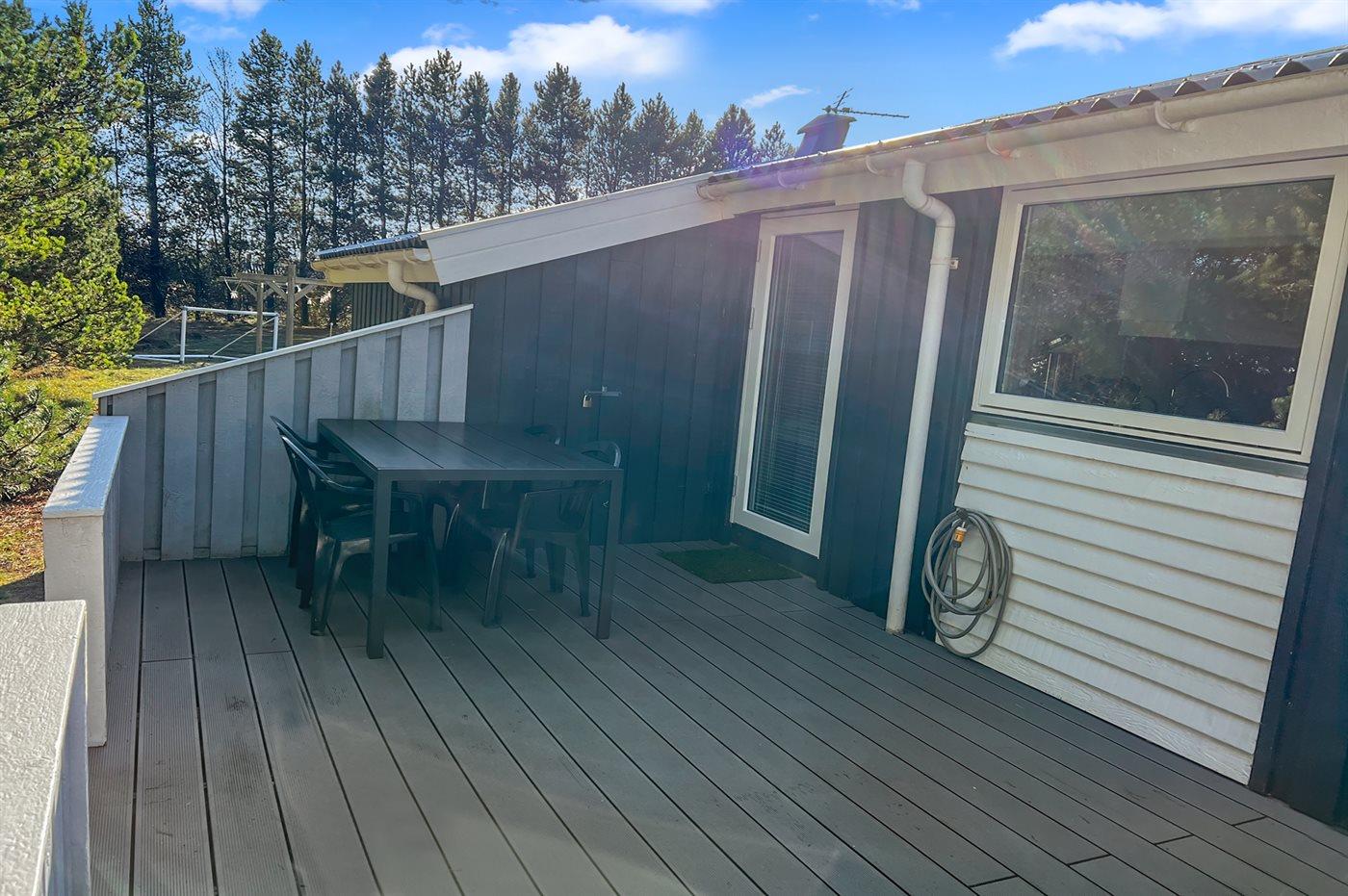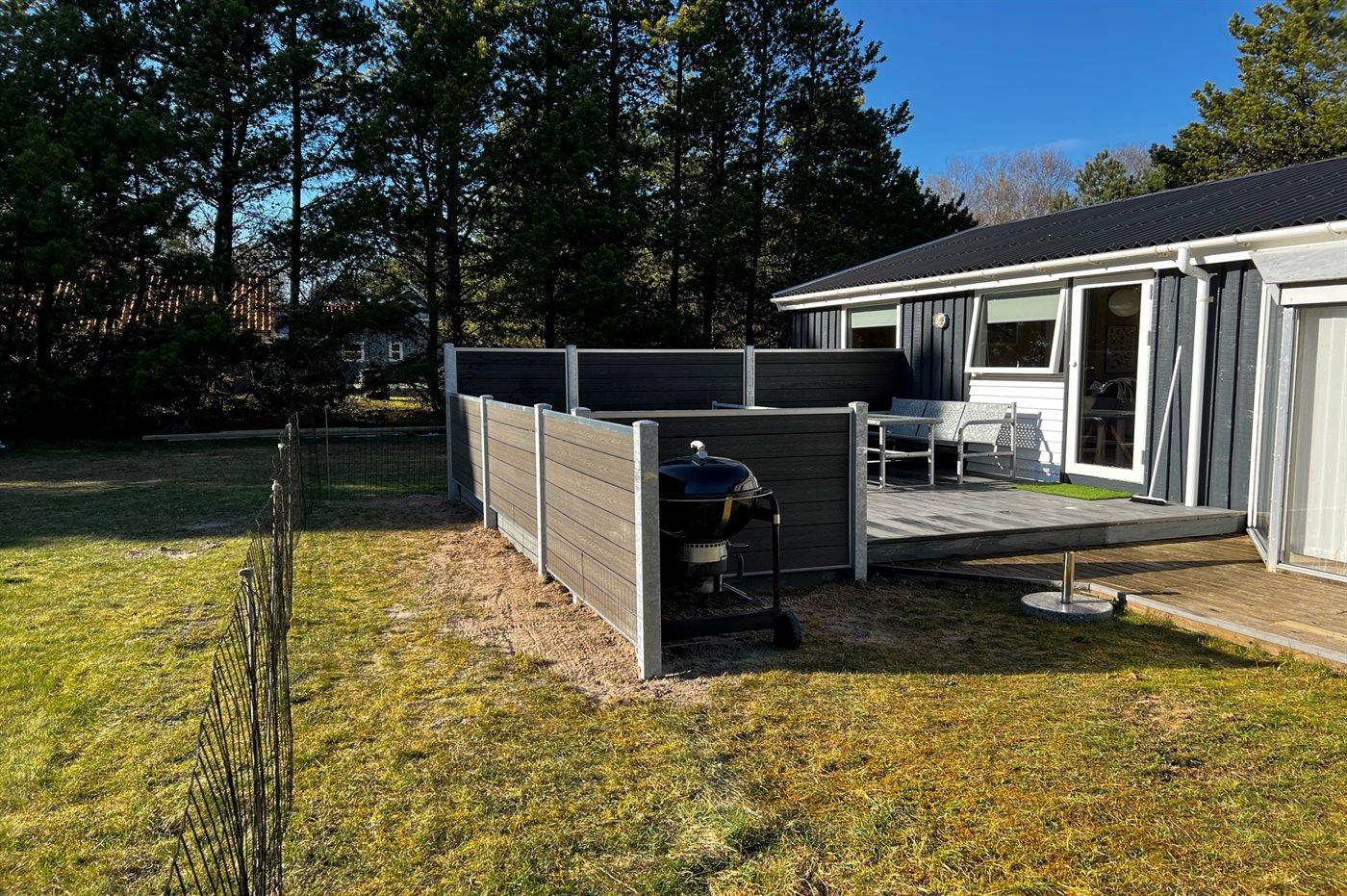 Ferieboligen er beliggende på en 2900 m² stor naturgrund. Der er 750 m til havet. Nærmeste forretning er beliggende i en afstand af 400 m. Til ferieboligen hører 12 m² terrasseareal. Desuden er der 10 m² overdækket terrasse. Der er redskabsrum. Fodboldmål. Grill til rådighed. Der er installeret stik til opladning af elbil. 3 meter ledning skal medbringes. Parkering ved ferieboligen.