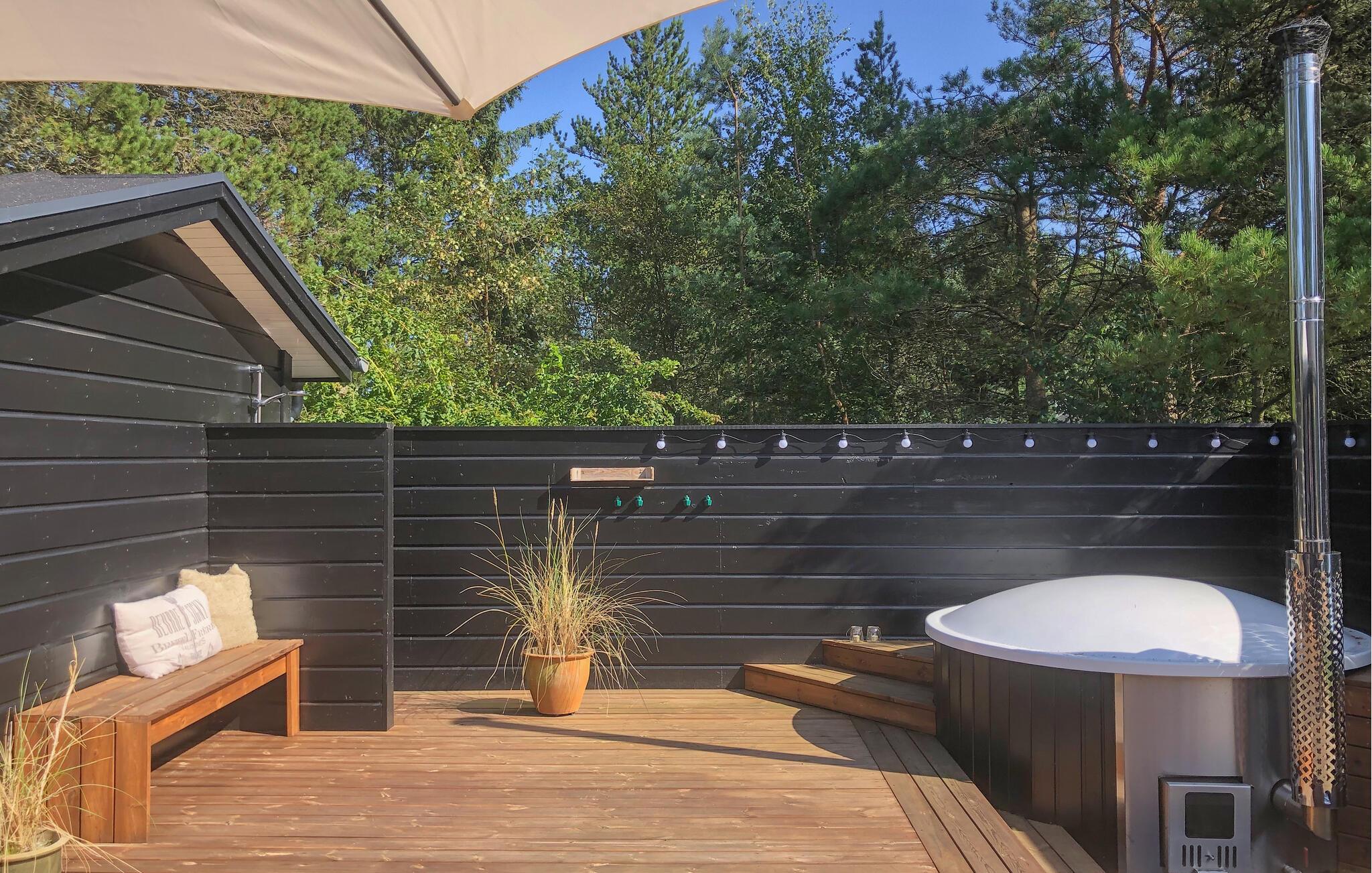 På den store lukkede terrasse er der mange lækroge, hvor I ugeneret kan nyde solen og slappe af i de komfortable solvogne, og hvis I hellere vil i skygge, kan I rykke ind på den overdækkede terrasse. På terrassen finder I også vildmarksbadet, hvor I kan ligge i det varme vand og beundre stjernehimlen.