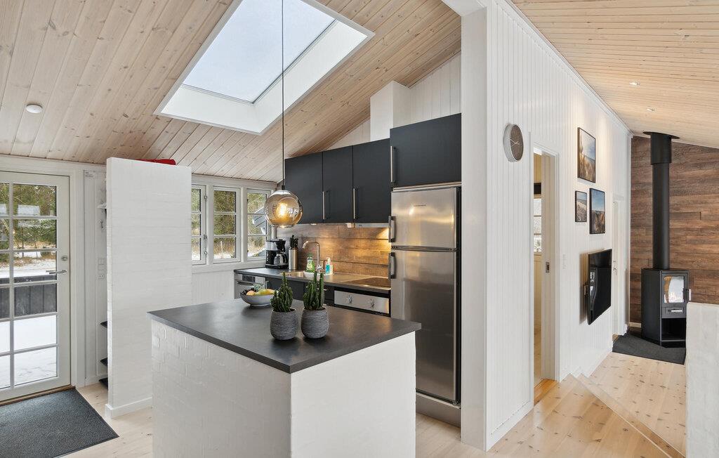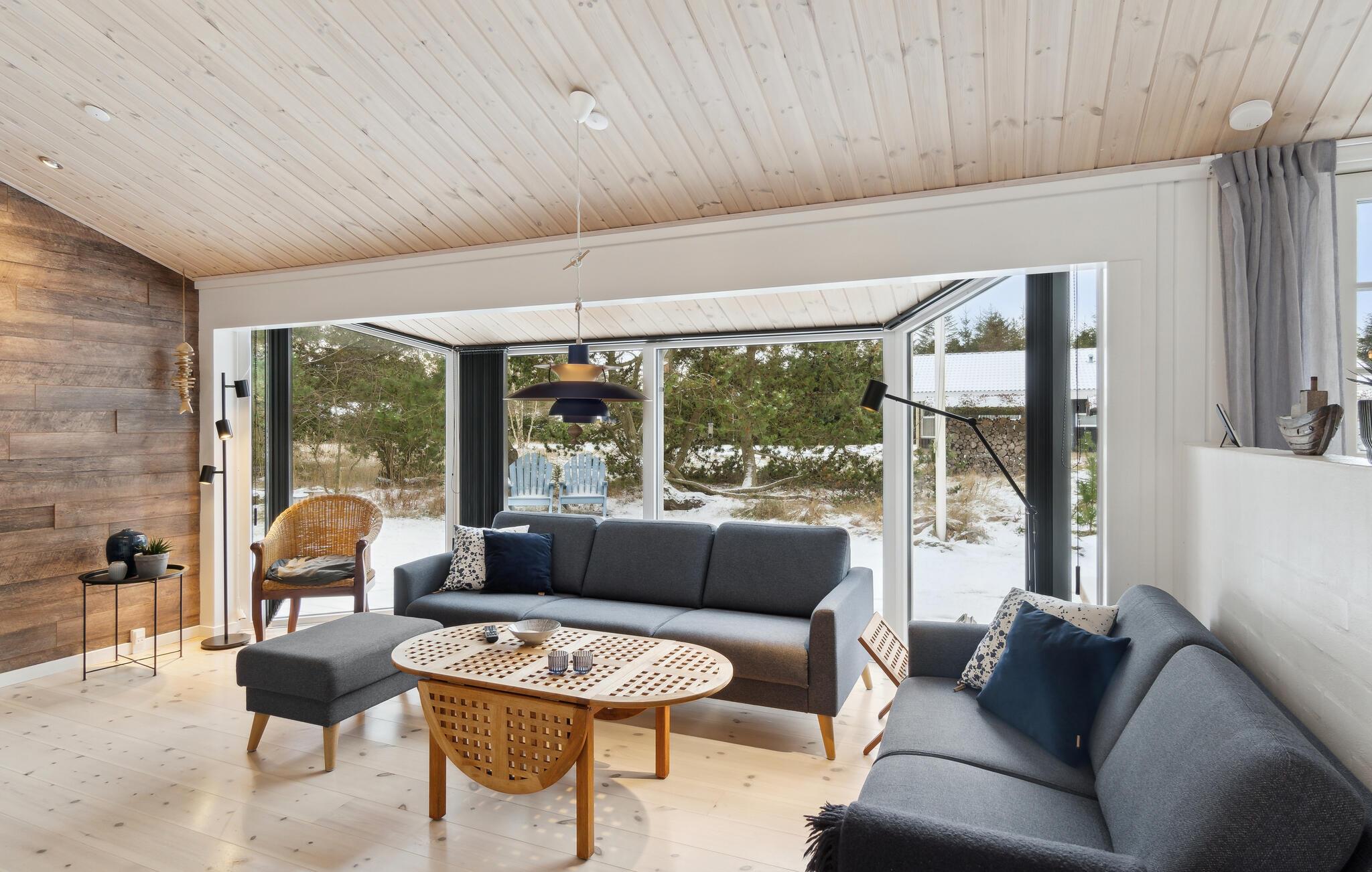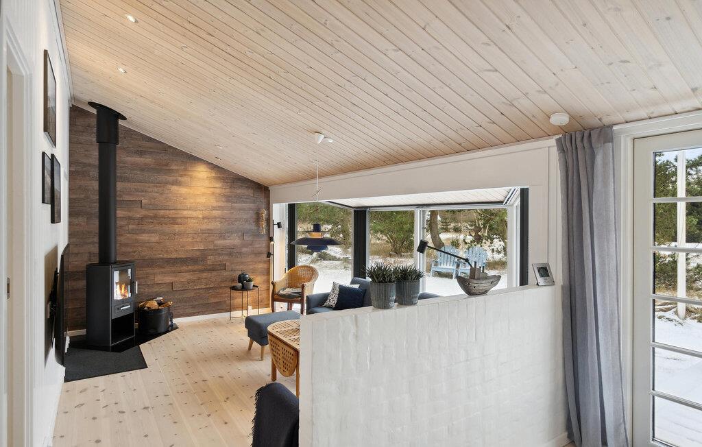 Dette skønne hus er i 2019 blevet totalt renoveret, så det indvendige i dag fremstår helt nyt og moderne. Huset har et flot og praktisk indrettet køkken og i forlængelse heraf en dejlig spiseafdeling samt nedsænket opholdstue. Nye møbler og lækkert udstyr præger dette indbydende feriehus, og det samme gør de store vinduespartier, der lader en masse naturligt lys sive ind og samtidig giver en flot udsigt til omgivelserne.