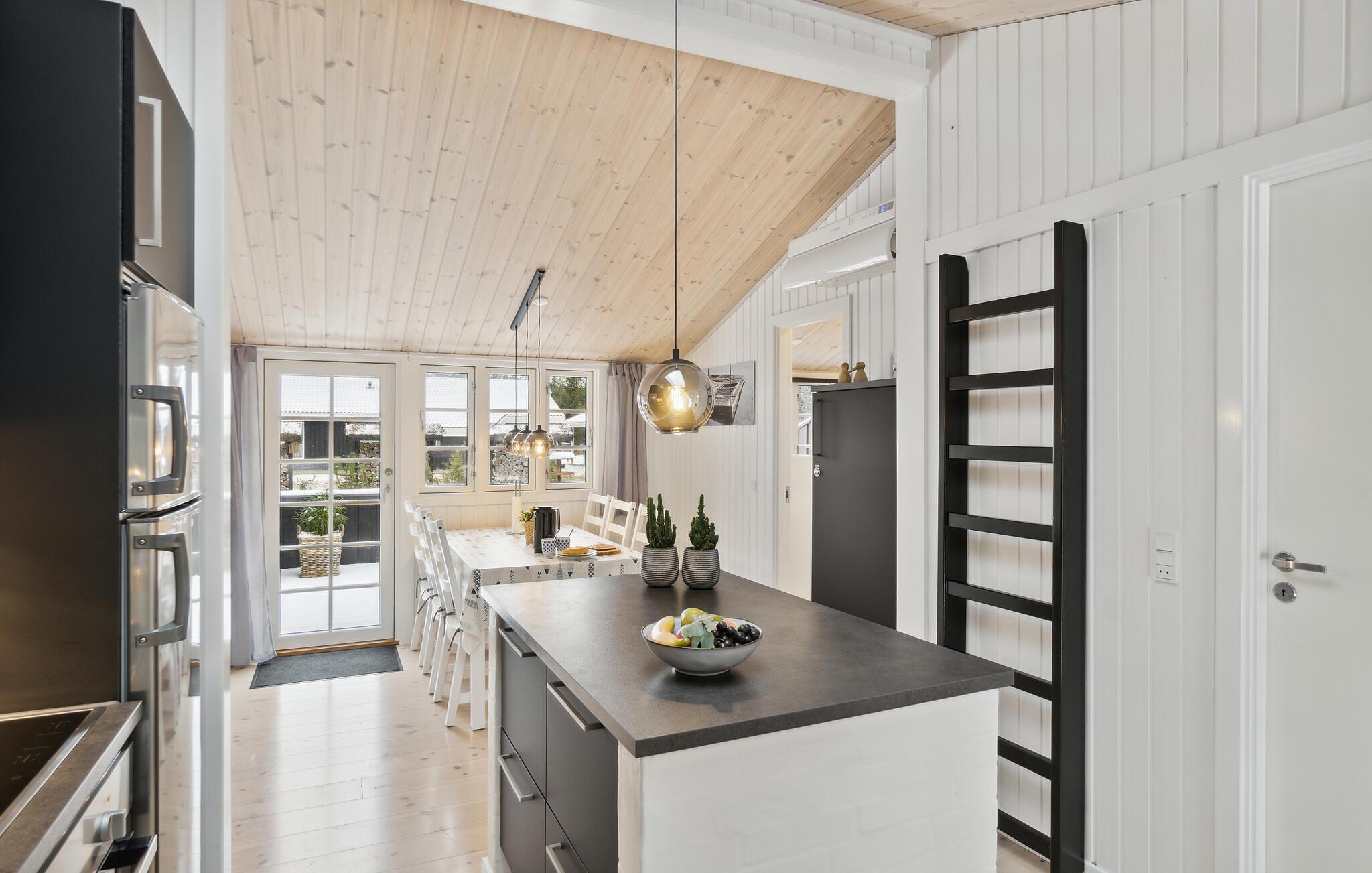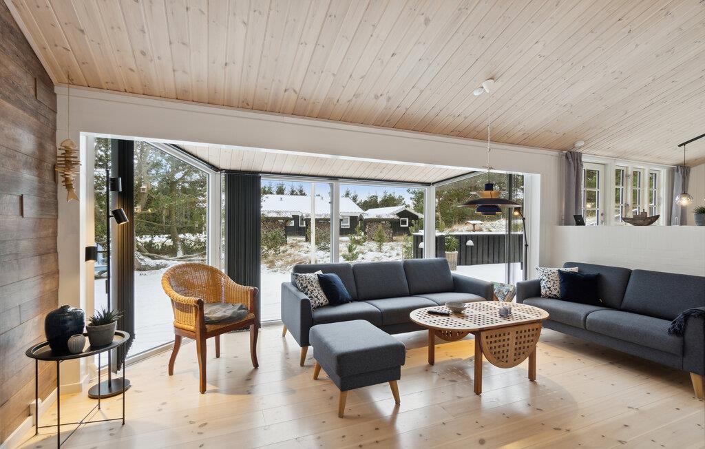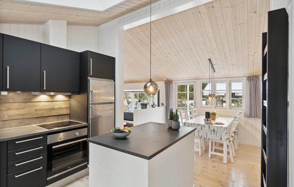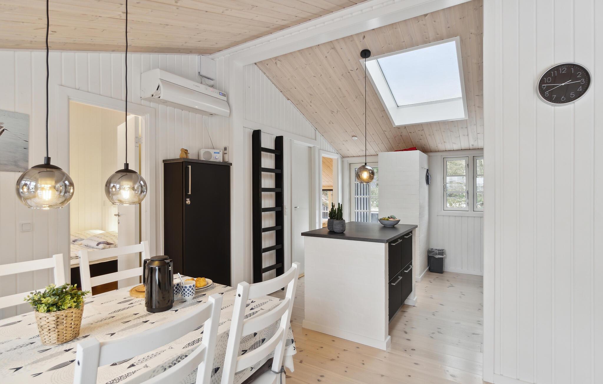 Dette skønne hus er i 2019 blevet totalt renoveret, så det indvendige i dag fremstår helt nyt og moderne. Huset har et flot og praktisk indrettet køkken og i forlængelse heraf en dejlig spiseafdeling samt nedsænket opholdstue. Nye møbler og lækkert udstyr præger dette indbydende feriehus, og det samme gør de store vinduespartier, der lader en masse naturligt lys sive ind og samtidig giver en flot udsigt til omgivelserne.