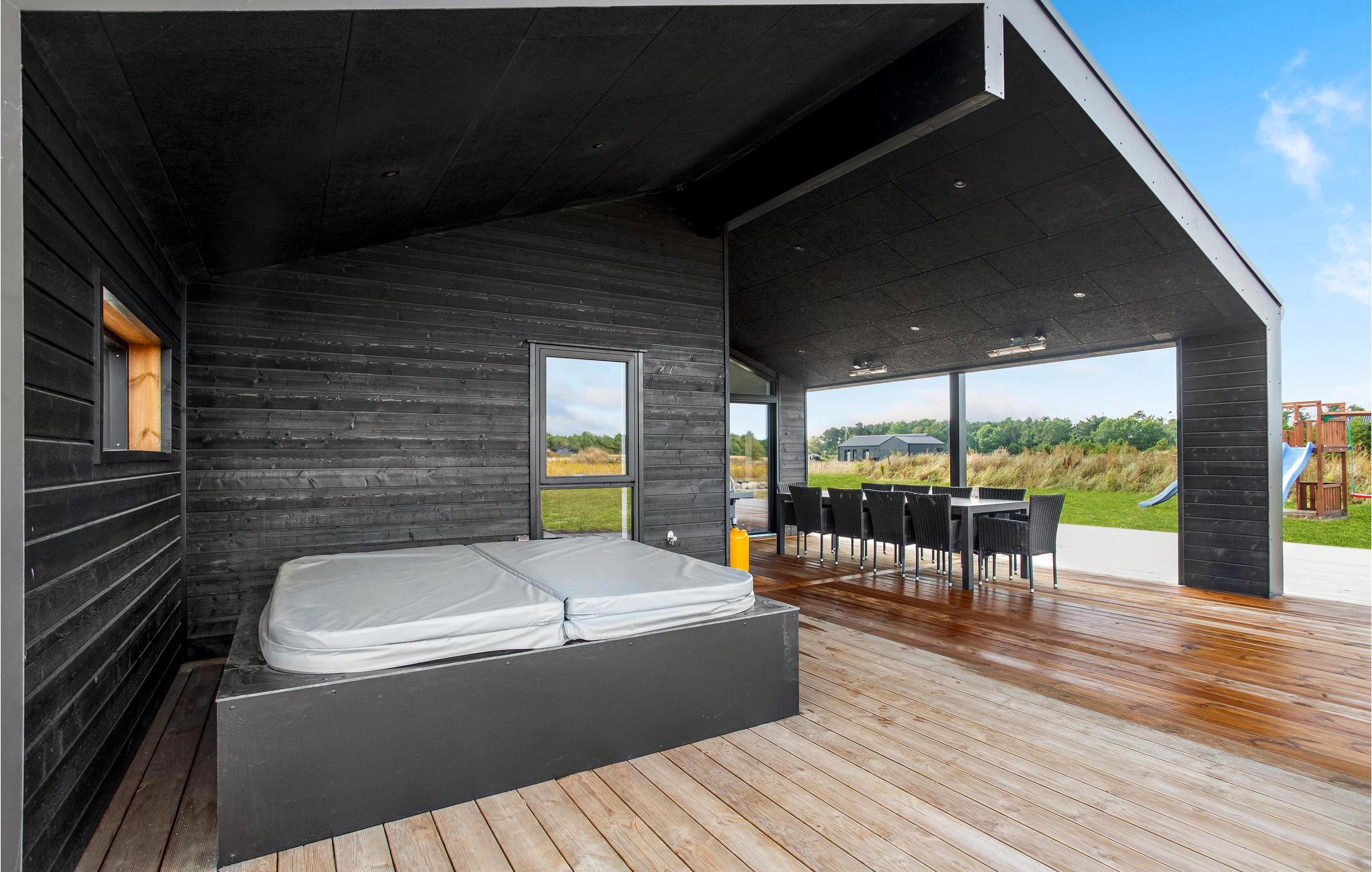 Topmoderne sommerhus med vildmarksbad, terrasse og hyggelig atmosfære nær stranden.