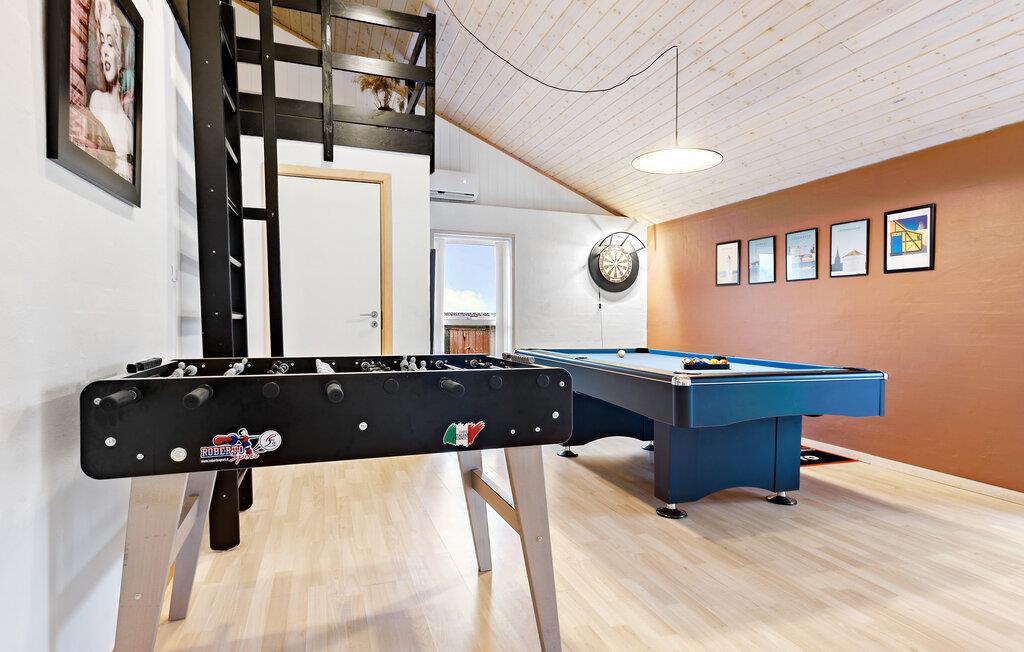 Velkommen til dette familievenlige feriehus, der lover jer og jeres venner eller udvidede familie en uforglemmelig tid i komfortable rammer. Find ro og komfort i de lyse soveværelser i skandinavisk stil, med lys og enkel æstetik. I det store og åbne opholdsrum kan I nyde tiden sammen, og aktivitetsrummet vil uden tvivl glæde både store og små. Spil billard, dart, bordfodbold og udfordr hinanden. De, der foretrækker det lidt mere stille, kan slappe af i saunaen eller i boblebadet.