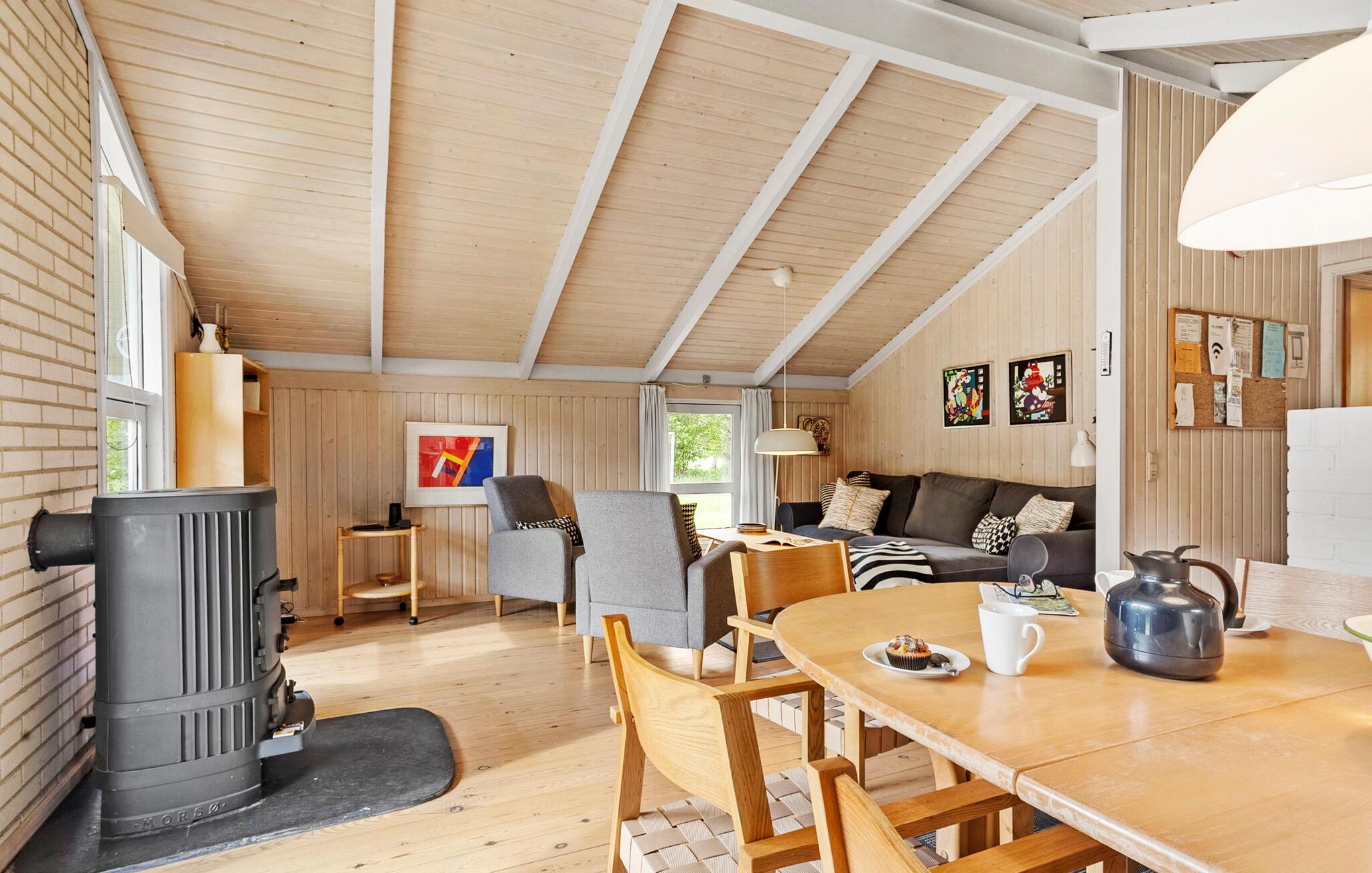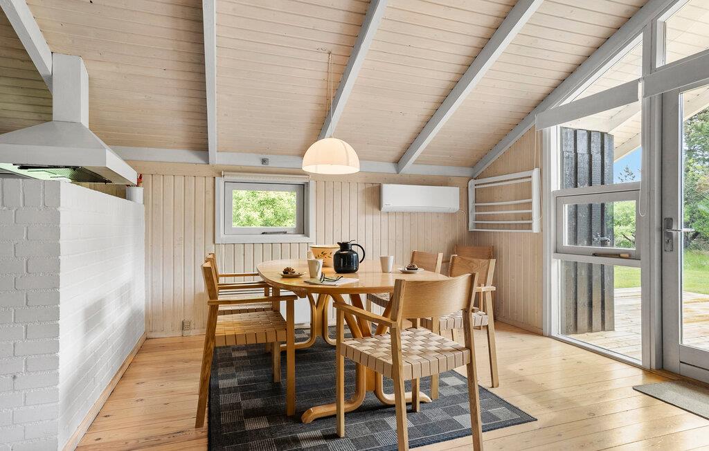De maleriske omgivelser på Bratten Strand og nærheden til børnevenlige, bilfri strande gør dette feriehus særligt attraktivt for familier med små børn. En veludstyret offentlig legeplads og handicapadgang med badebro giver ekstra komfort og nydelse. Inde i huset finder I en lys stue med komfortable siddepladser og et åbent køkken, ideelt til fælles madlavning og sociale aftener. De hyggelige træmøbler og det luftige rum skaber en behagelig atmosfære.