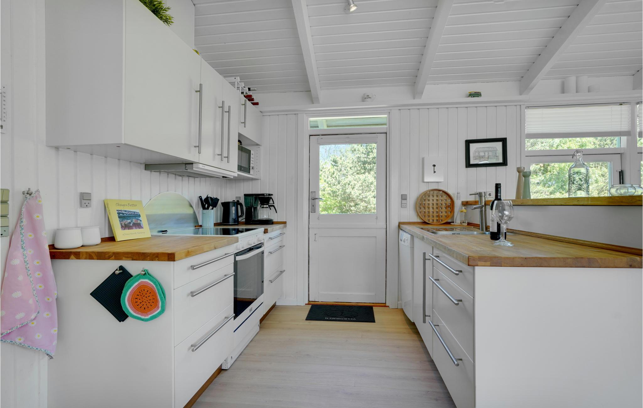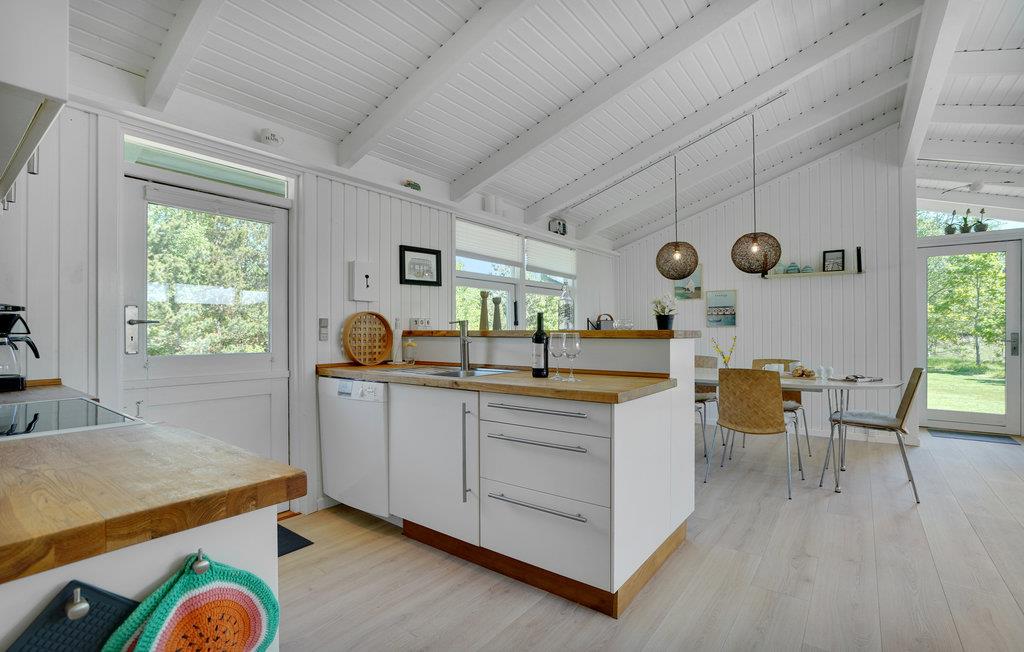 Køkken/alrummet har et lyst og luftigt udtryk takket være sit loft-til-kip og de store vinduespartier, der lyser lokalet dejligt op udefra. Ved brændeovnen finder I det perfekte sted at hygge sig med en god bog på en af de køligere aftener.