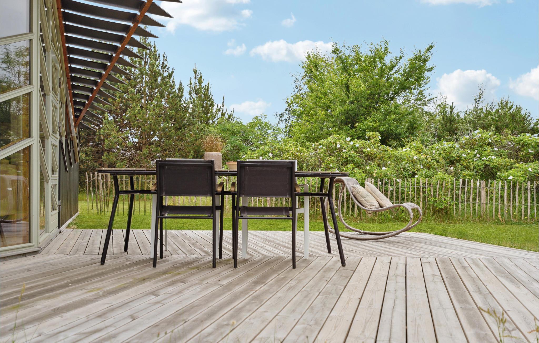 Udenfor finder I terrasser på begge sider af hyset, så I kan finde sol, skygge og læ efter behov i løbet af dagen, mens børnene kan spæne rundt og spille bold på den store græsplæne.