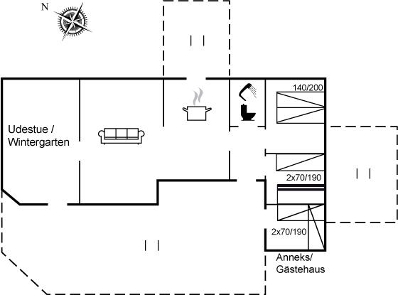 Der er i alt 3 soveværelser. Sovepladserne fordeler sig på: 2 sovepladser i dobbeltseng. 1 soveplads i enkeltseng. 4 sovepladser i køjesenge. 2 af disse sovepladser befinder sig i et anneks. Derudover er der 1 stk. barneseng.