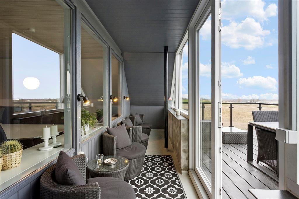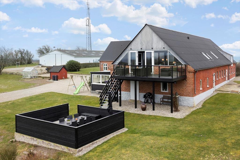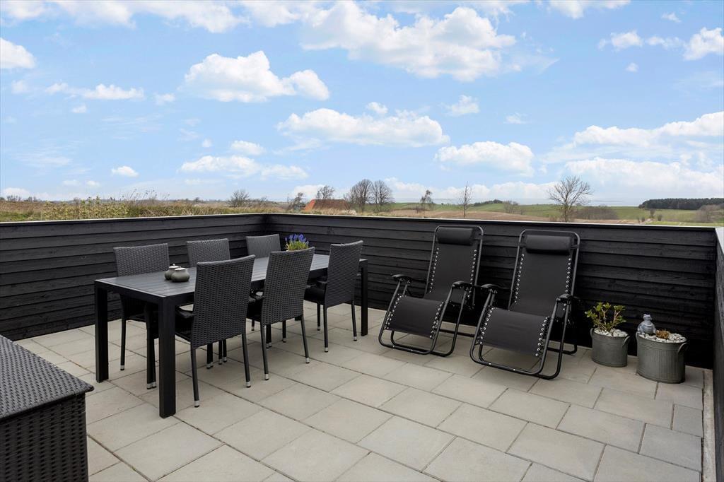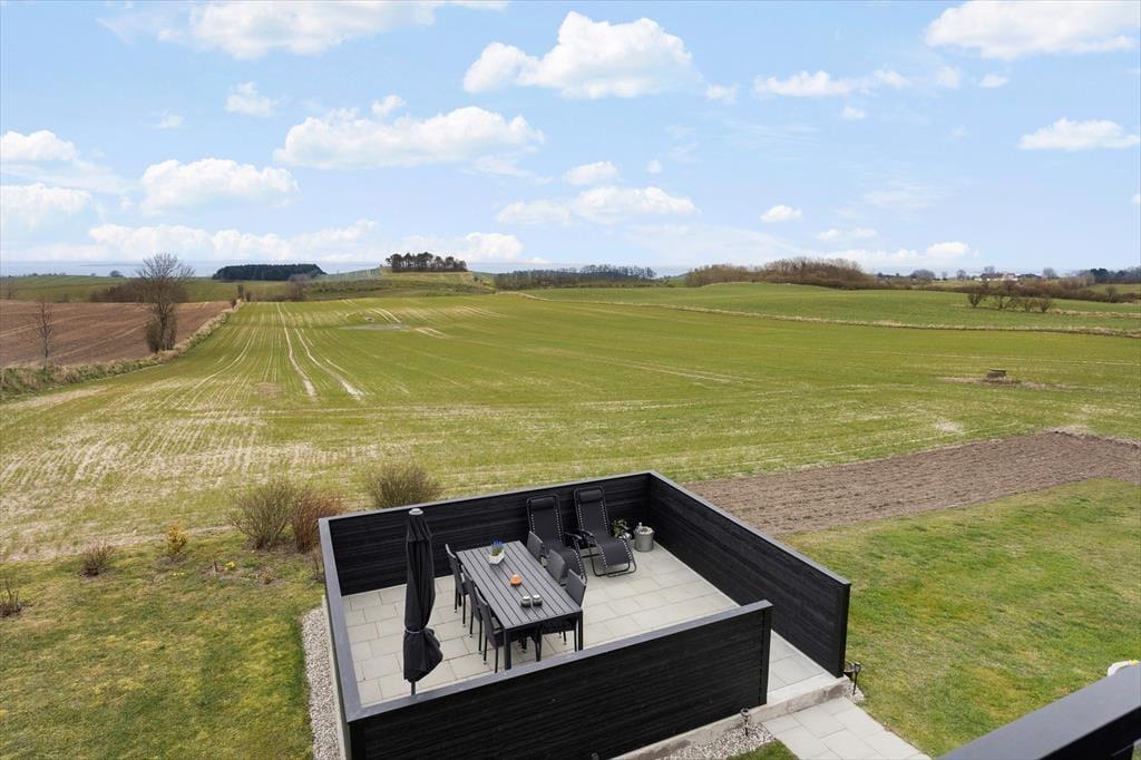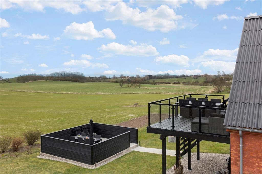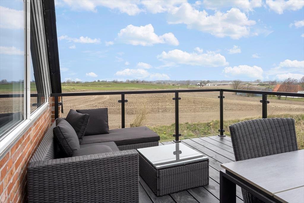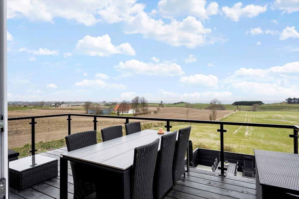 En af ferielejlighedens helt store fordele er den store balkon med spiseplads, hvor du kan nyde din morgenkaffe med udsigt til havet og de frodige marker. Herfra fører en trappe ned til en afskærmet terrasse i haven, hvor der også er et gyngestativ til børnene. Terrassen er det perfekte sted at slappe af, grille og nyde lange sommeraftener i godt selskab. Haven byder på masser af plads til leg og afslapning, så hele familien kan nyde livet udendørs.