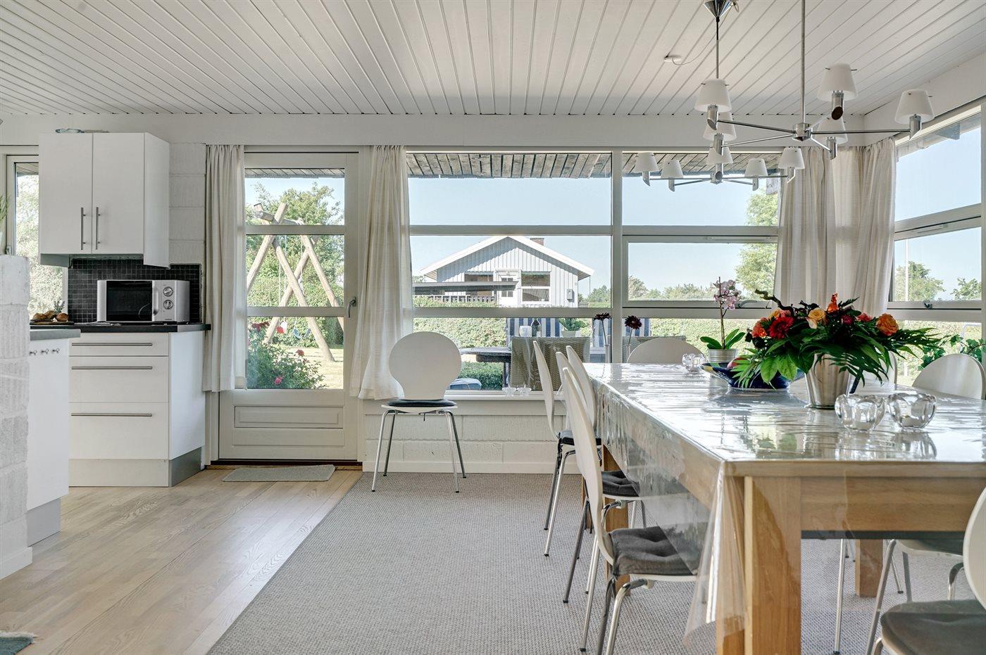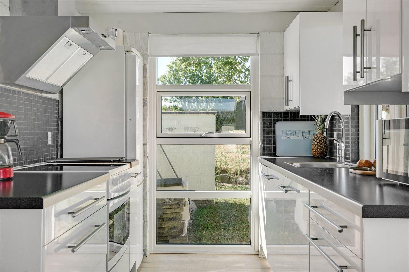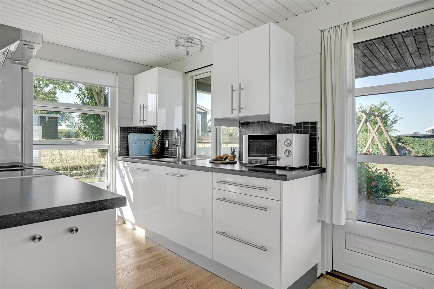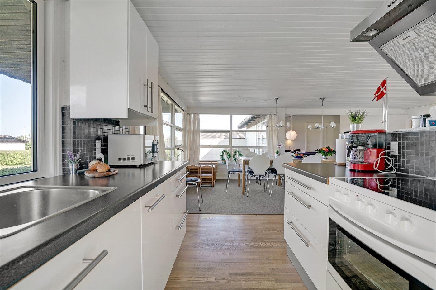 Køkkenet er udstyret med 1 køleskab. Der er 4 keramiske kogeplader, varmluftovn, mikrobølgeovn samt opvaskemaskine.