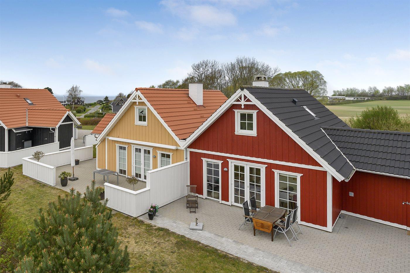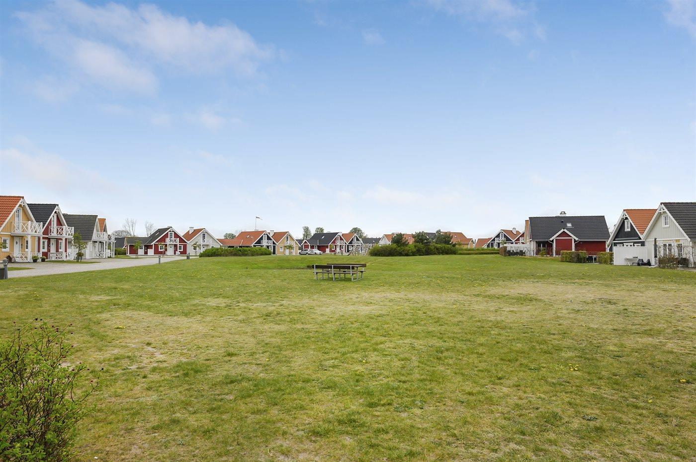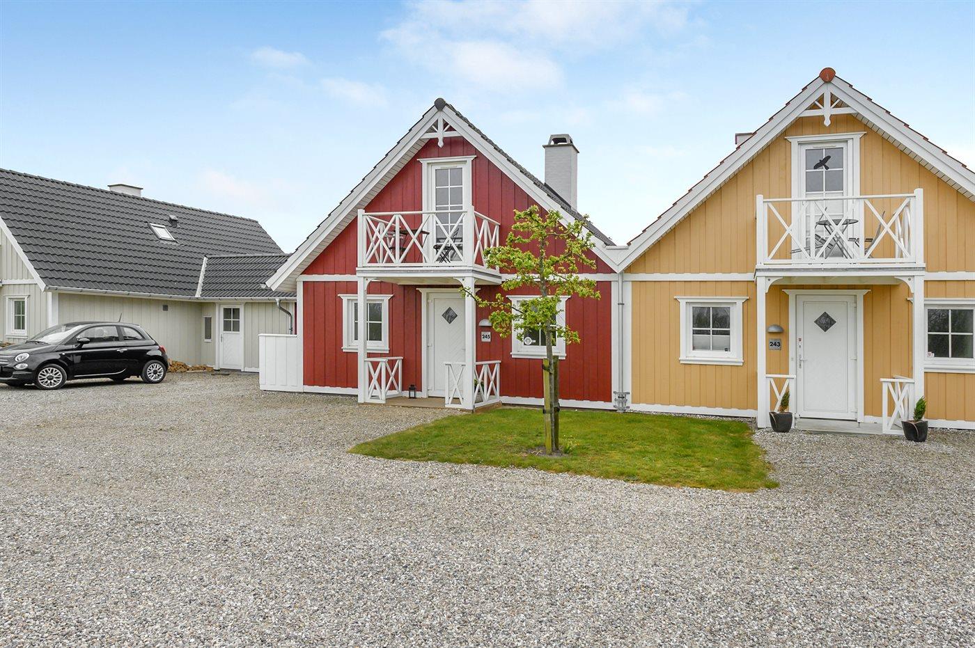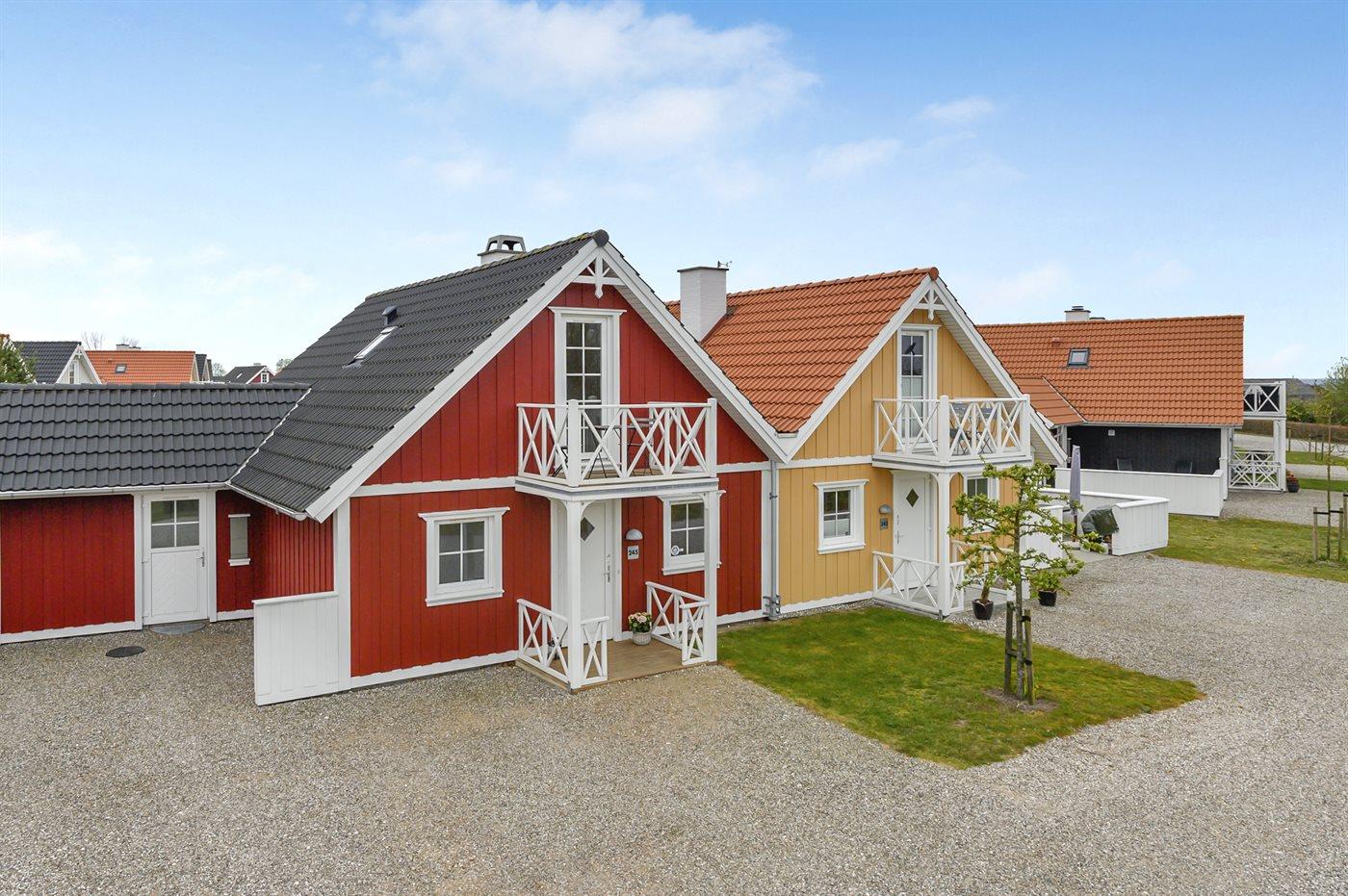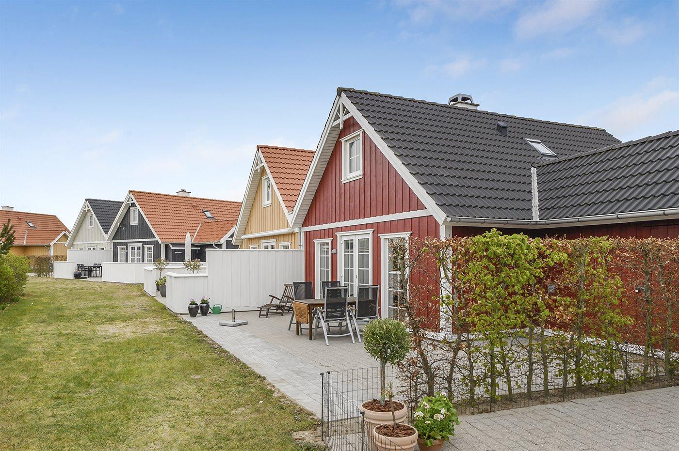 Arkitekttegnet rækkehus i træ i 2 etager. Til huset hører en åben terrasse med havemøbler samt balkon på 1. sal med udsigt over vandet og markerne. Klinkegulve i stueetagen, gulvtæpper på 1. sal. Huset ligger i et spændende sommerhusområde med gode aktivitetsmuligheder, bl.a. fælles legepladser, petanquebane, tennisbane samt beach-volleybane.