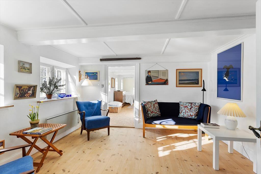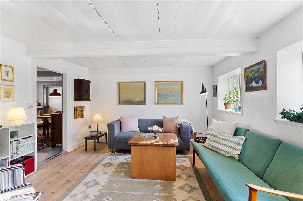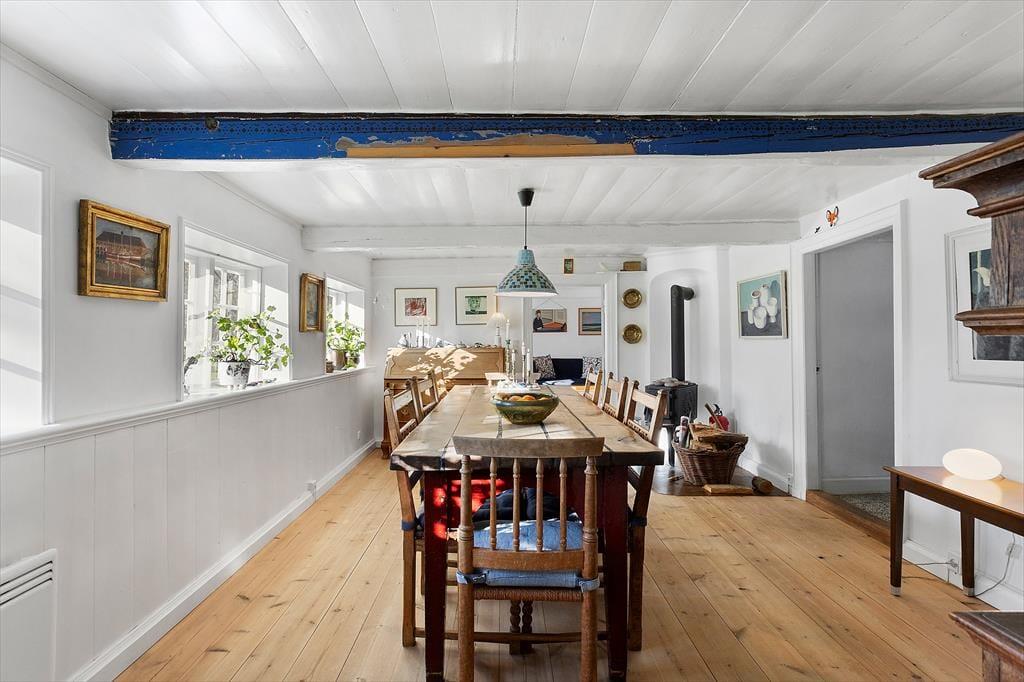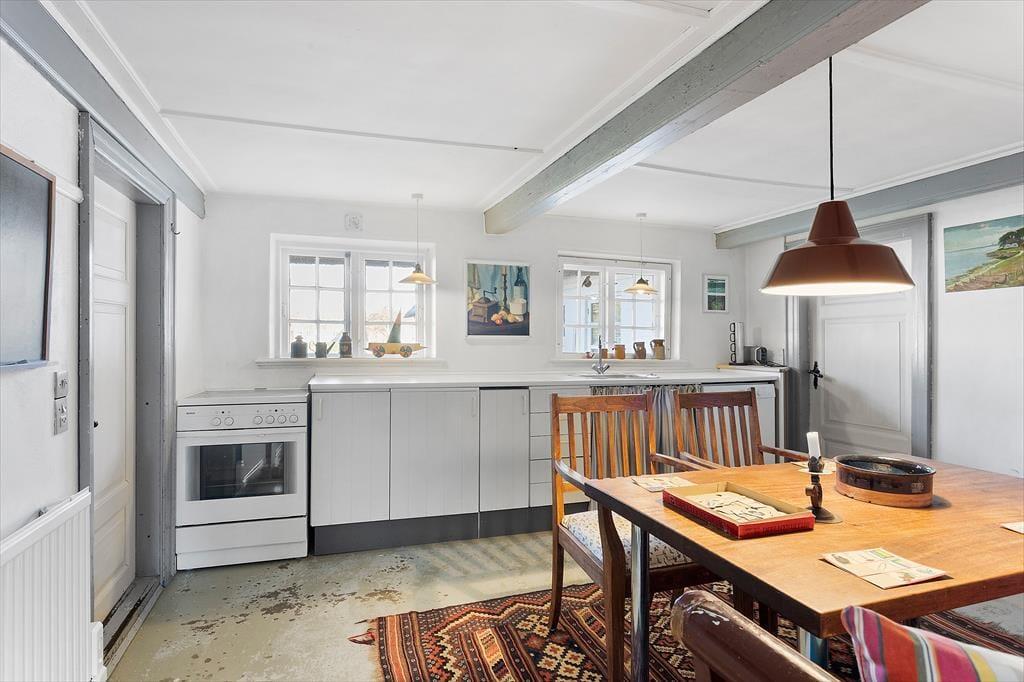 Træd ind i dette charmerende landkøkken, hvor synlige bjælker og rustikke detaljer skaber en varm atmosfære. Her er der god plads til at lave lækre måltider, måske med råvarer fra de lokale markeder. Spiseafdelingen med brændeovnen inviterer til lange middage og hygge foran flammerne, mens tv-stuen er det perfekte sted til afslapning efter en dag fyldt med oplevelser på Ærø.