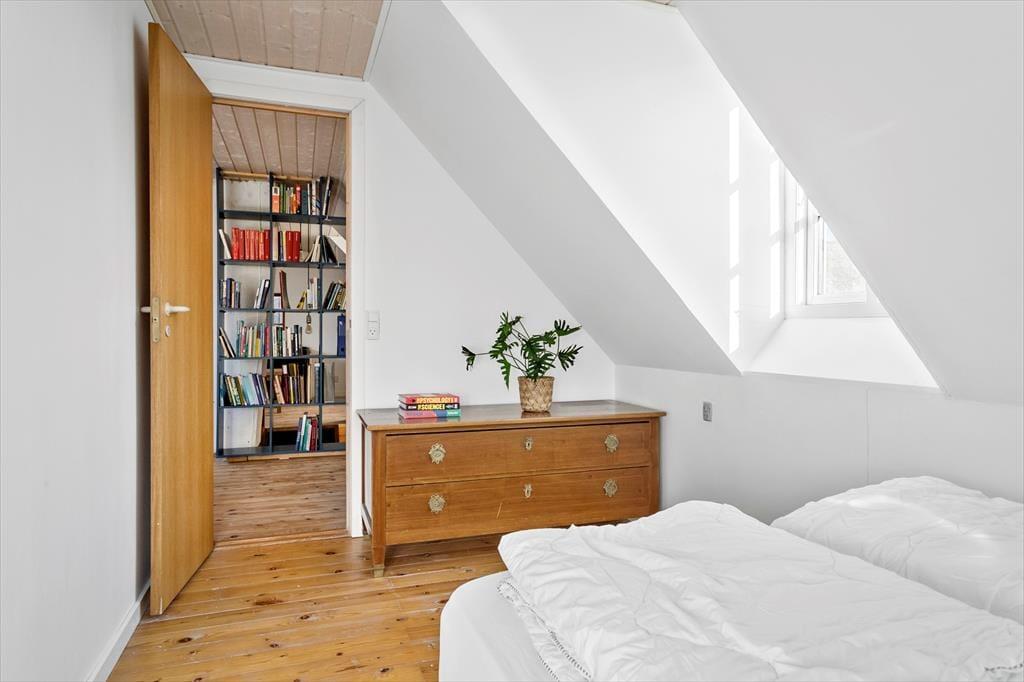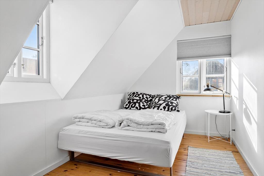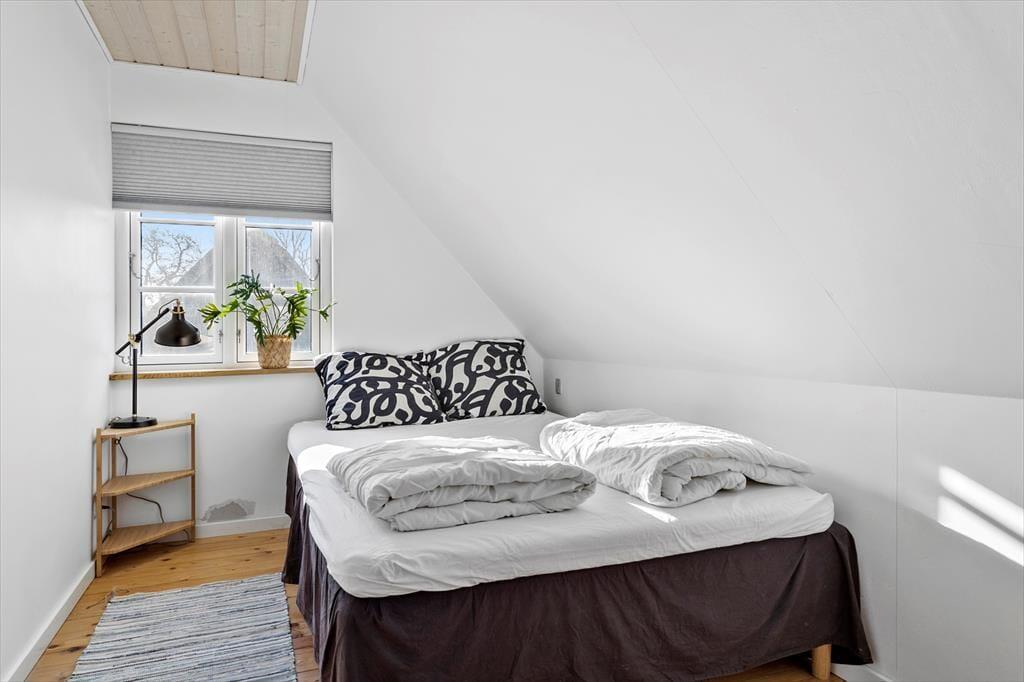 De to soveværelser på 1. sal har dobbeltseng i målene 140x200 cm. På værelserne er der er skråvægge og gode vinduer, så man kan kigge ud i haven og mod vejen.