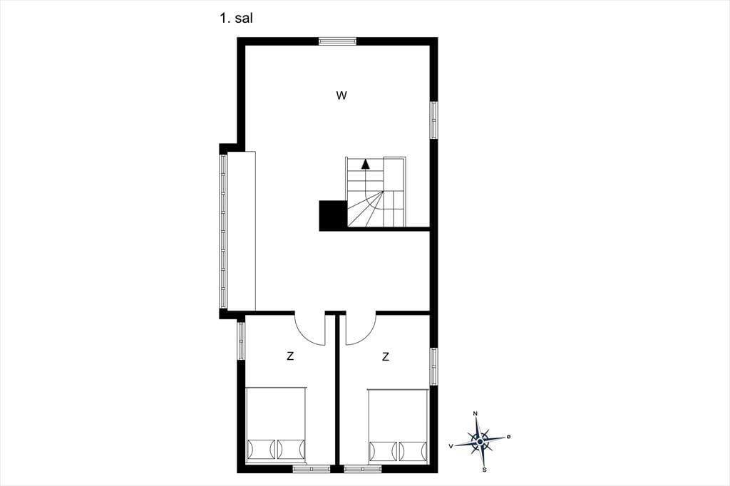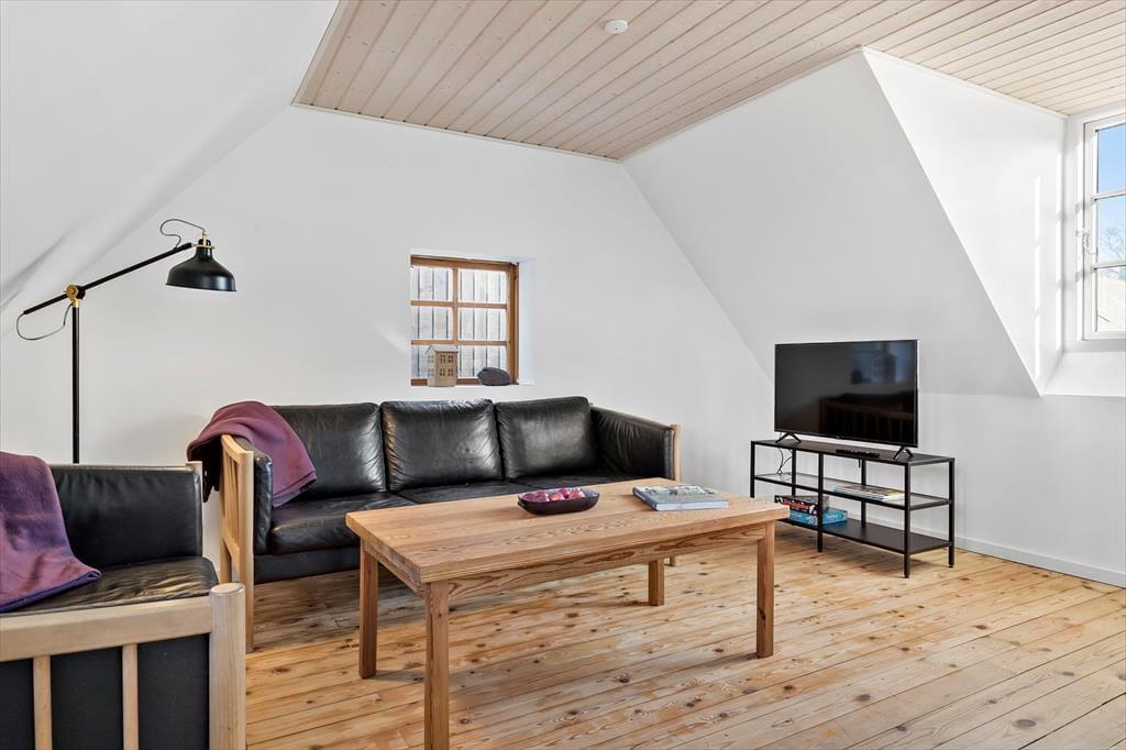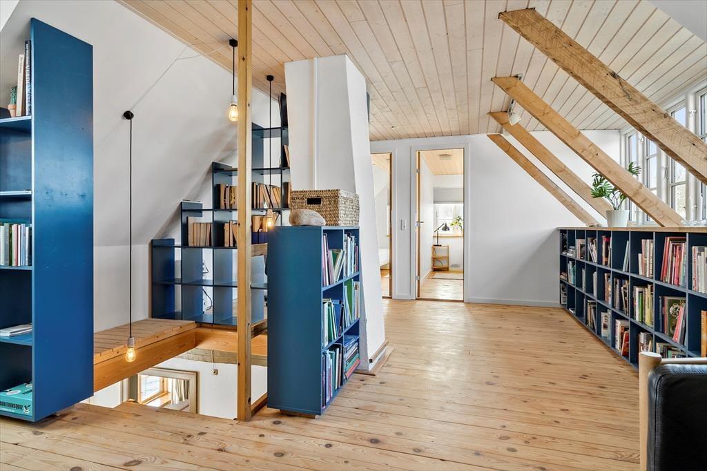 Op til 1. sal er en lidt stejl trappe. Heroppe er yderligere to soverum samt et hyggeligt repos, hvor man kan slappe af i sofaen og tænde for fjernsynet eller finde en bog i bogreolen. Reposen er et hyggeligt samlingsrum, og er fint indrettet med bogreoler og et dejligt vindue ud mod haven.