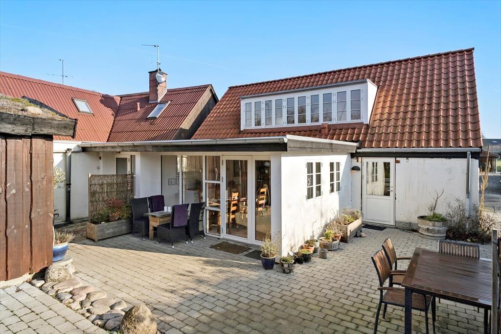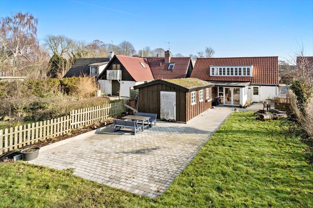 Landsbyhuset ligger midt i Brundby med en dejlig grund og have bag huset. Haven er omkranset af en hæk og er indhegnet, så under opsyn kan du lade børn eller hund løbe frit. I kan nyde solen hele dagen på græsplænen, lege eller lave snobrød ved bålstedet. Huset har en dejlig vestvendt fliseterrasse, hvor der er mulighed at nyde maden udenfor ved havemøblerne i træ, da her er direkte udgang fra køkken/alrummet. På terrassen bag huset er der helt fred og ro, selvom huset ligger midt i Brundby.