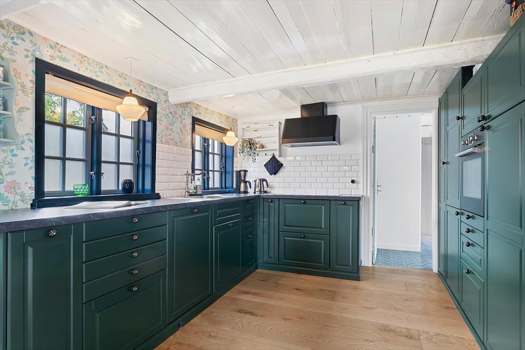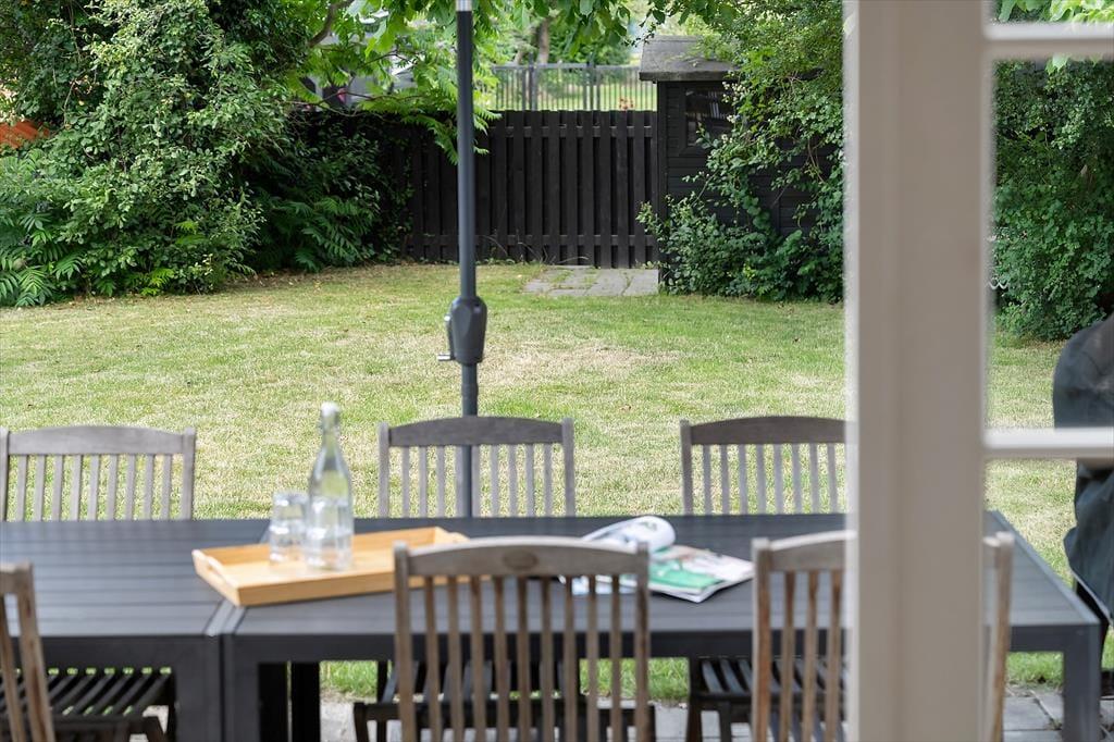 Det store, åbne køkken ligger i direkte forbindelse med den hyggelige spiseplads, så madlavning og samvær smelter naturligt sammen. Her kan I nyde lange middage, hyggelige brætspilsaftener og gode samtaler – alt sammen med et skønt lysindfald fra vinduerne og havedøren. Fra spiseområdet træder I ud på en dejlig vestvendt terrasse, perfekt til solrige eftermiddage og lune sommeraftener.