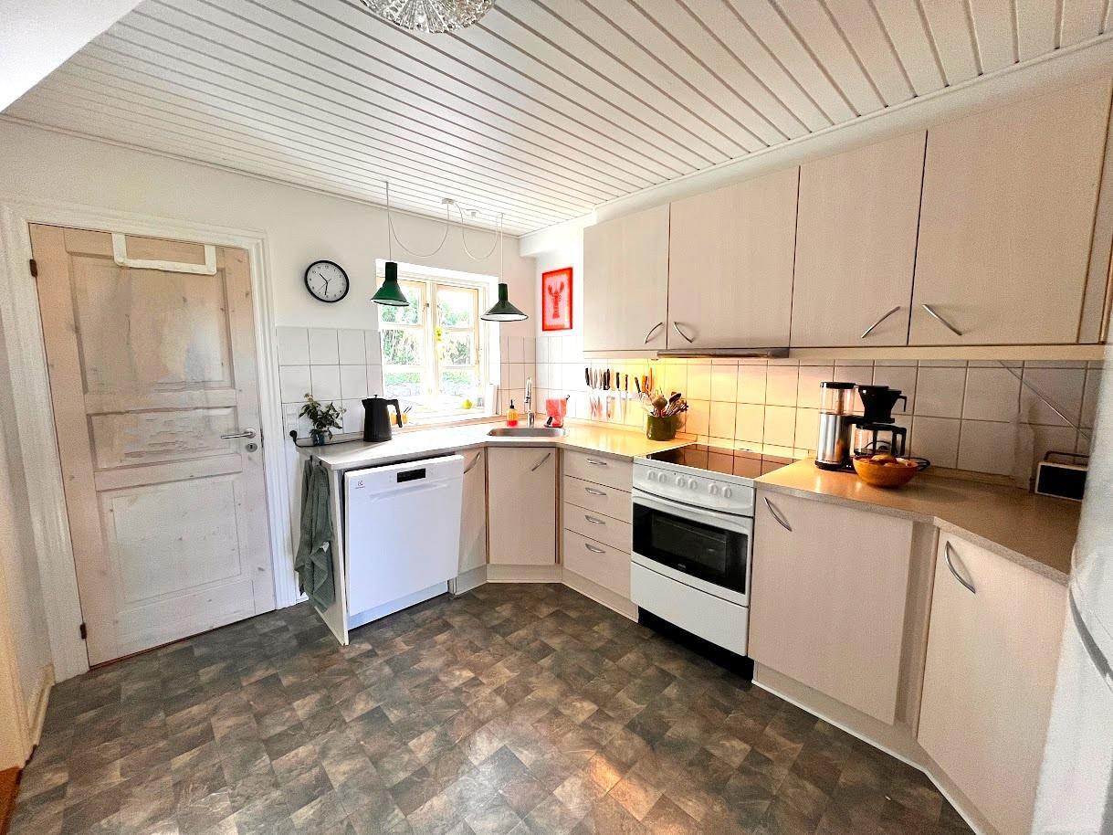 I stueetagen finder du et dejligt køkken med god bordplads, som gør det nemt at tilberede feriens måltider. Den lyse stue byder på både spiseplads og et hyggeligt sofahjørne med TV til streaming – perfekt til afslapning efter en oplevelsesrig dag. Her er også brændeovn, badeværelse samt vaskerum med både vaskemaskine og tørretumbler.