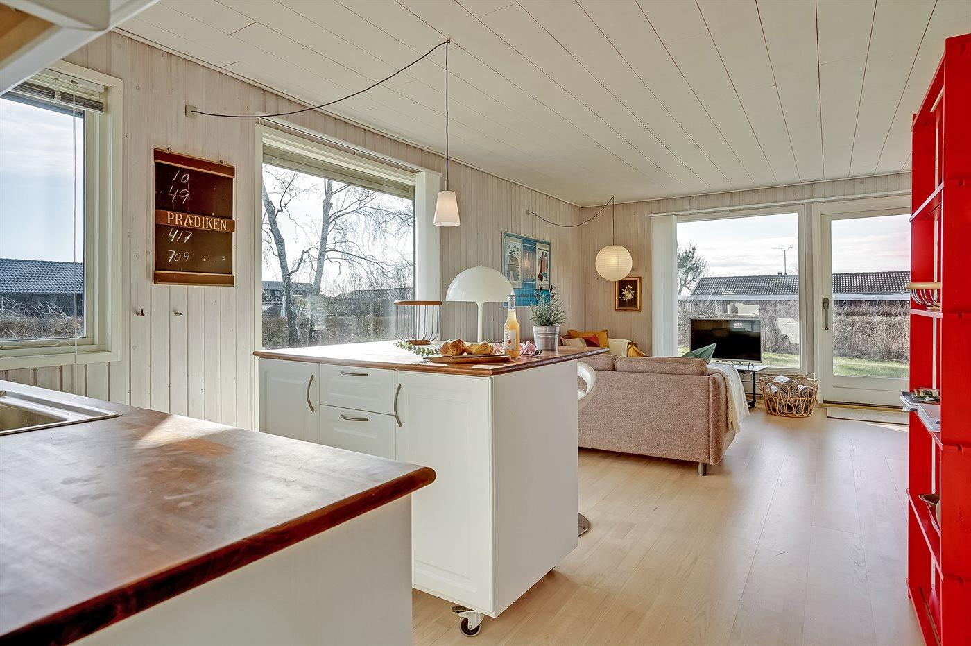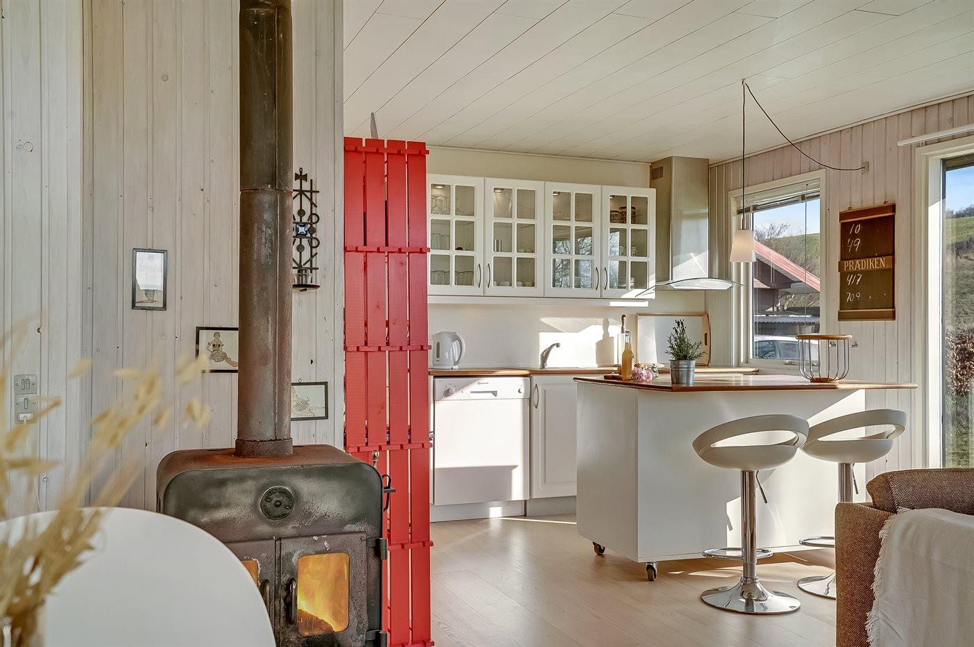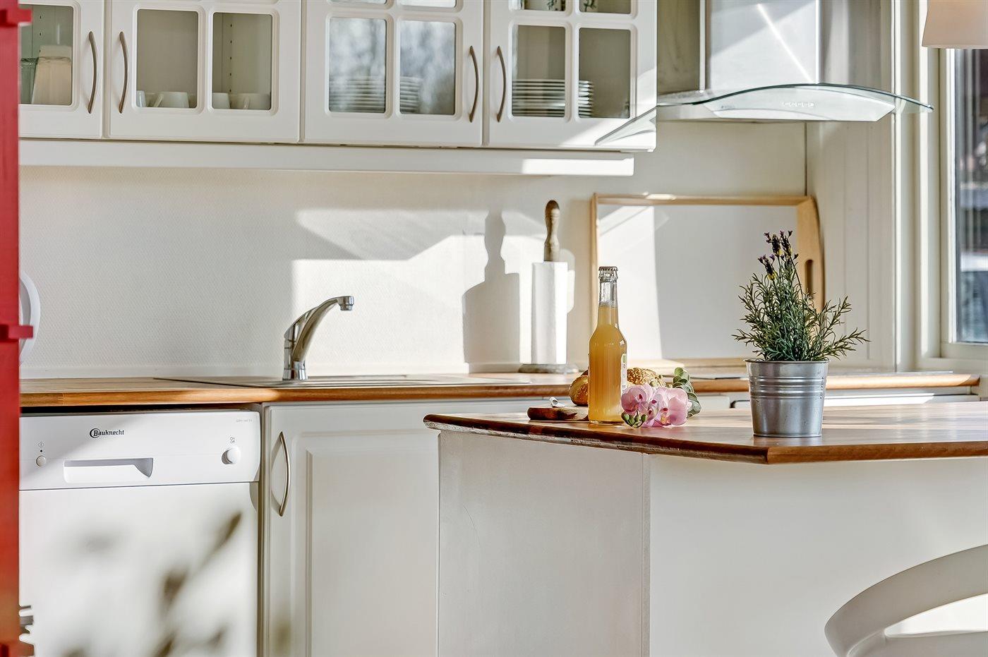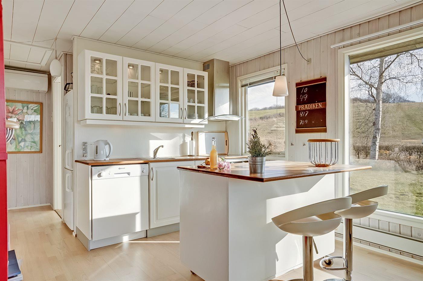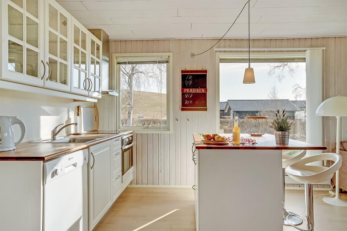 Køkkenet er udstyret med 1 køleskab. Der er 4 keramiske kogeplader, varmluftovn samt opvaskemaskine.