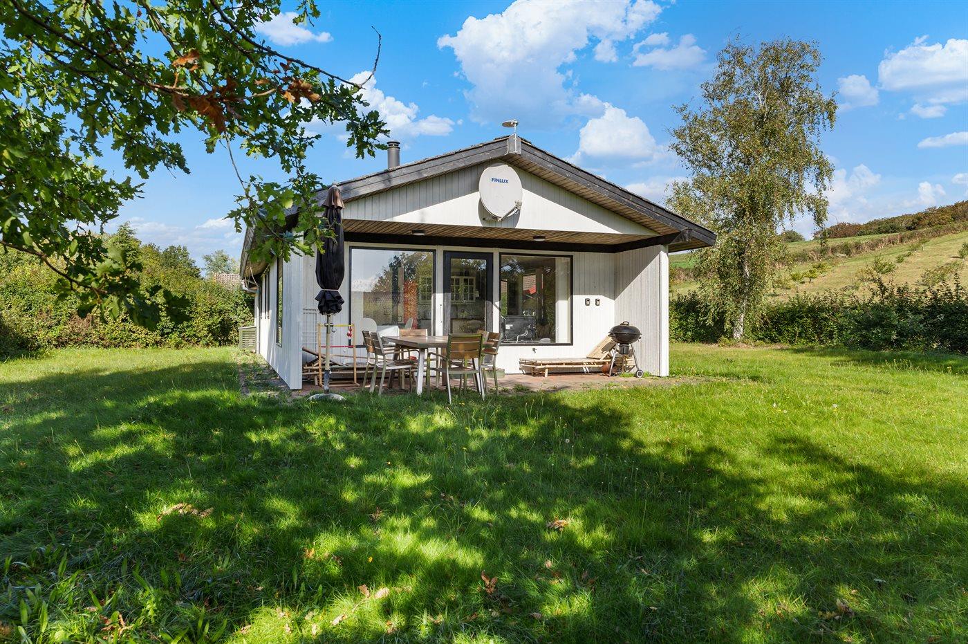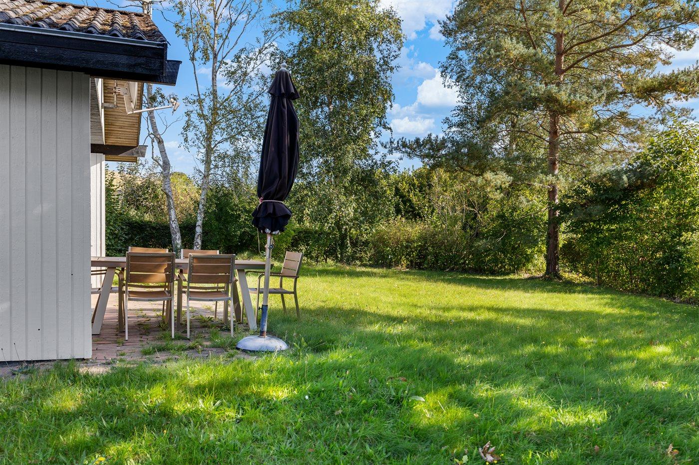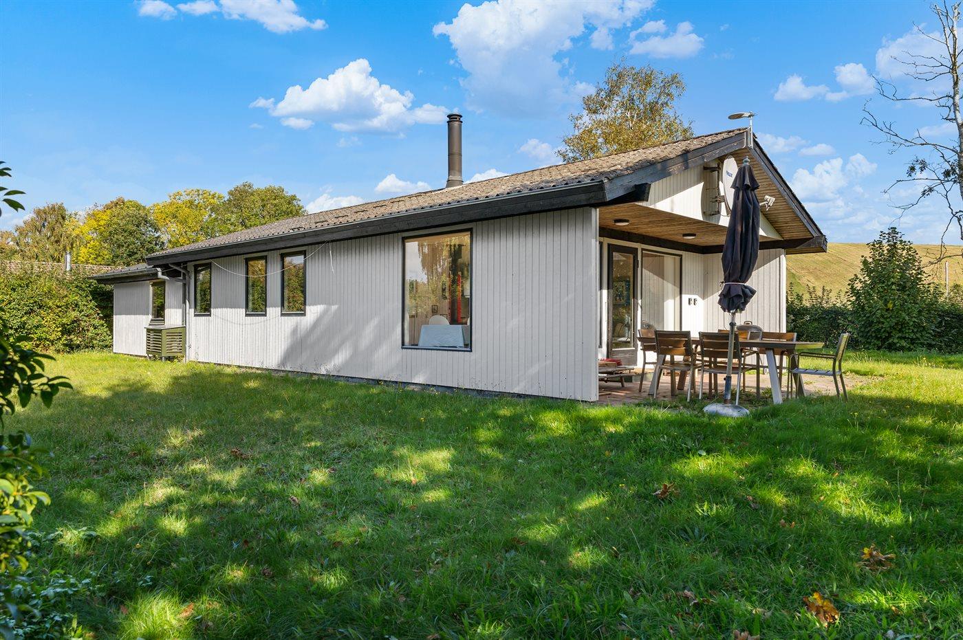 Hyggeligt sommerhus i Brunshuse med sydvendt terrasse og ugenert have tæt på havet.