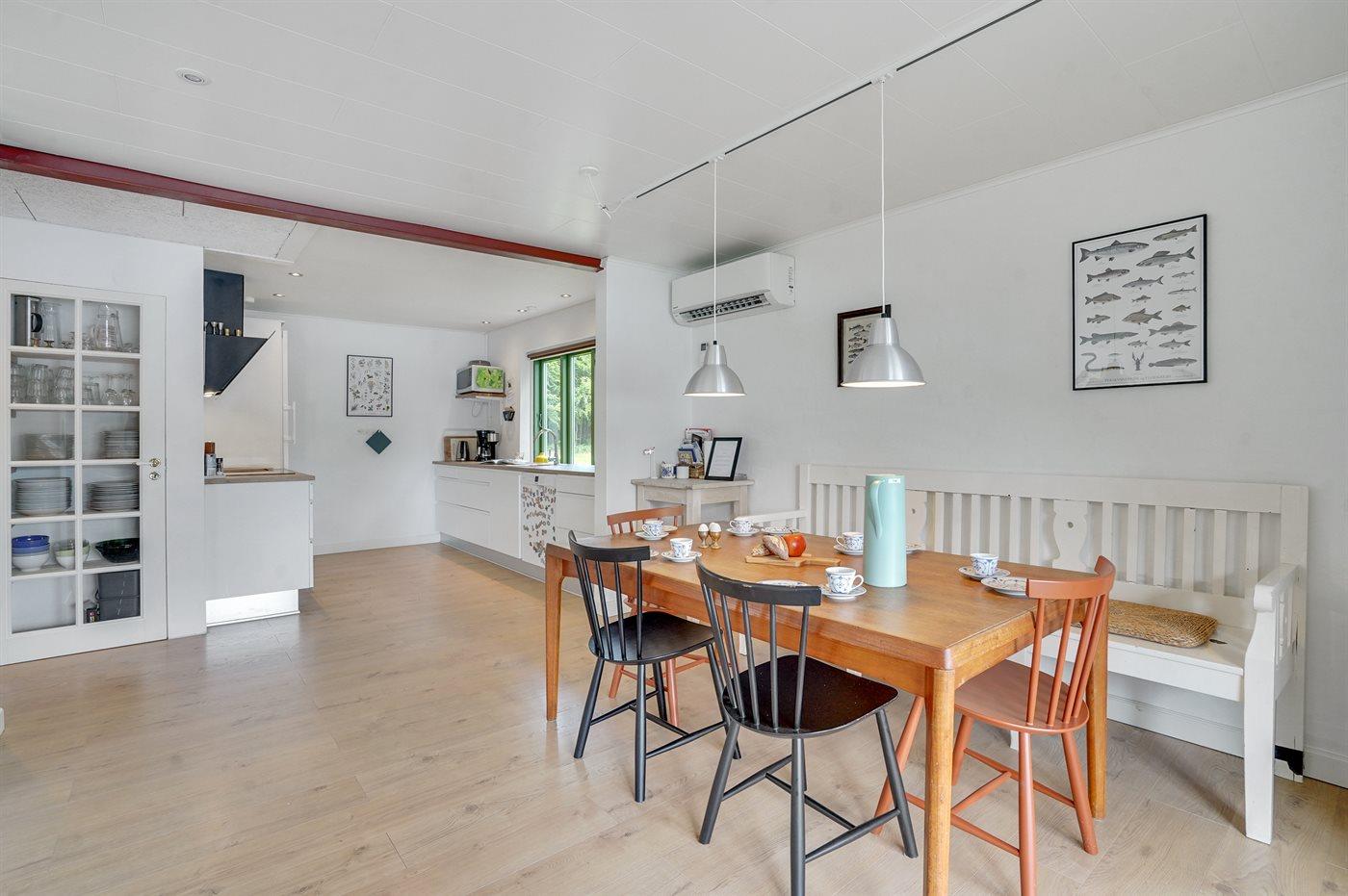 Indvendig fremstår huset lyst og moderne efter en større renovering i 2021 med bl.a. nyt køkken, bad m.m.