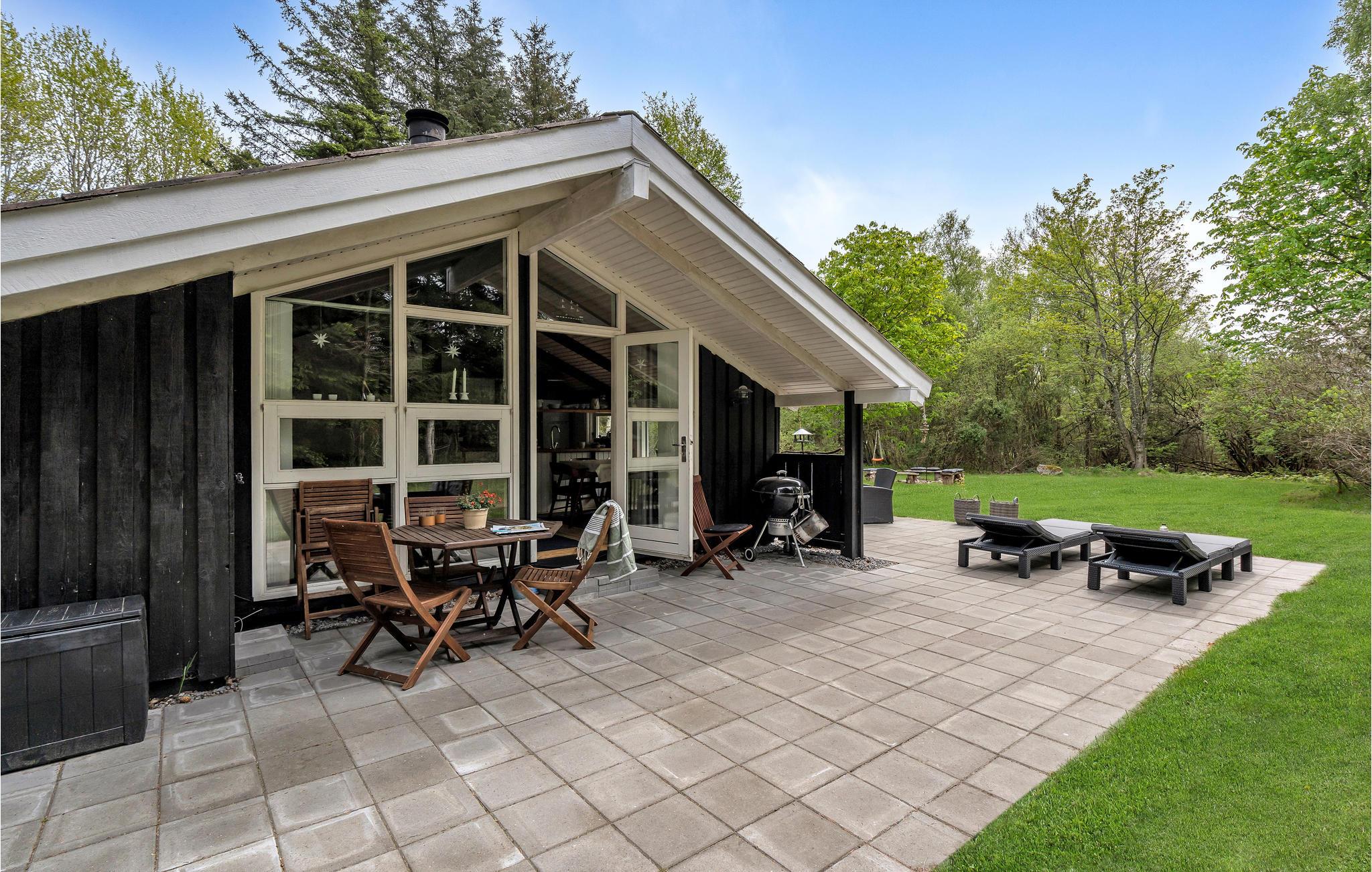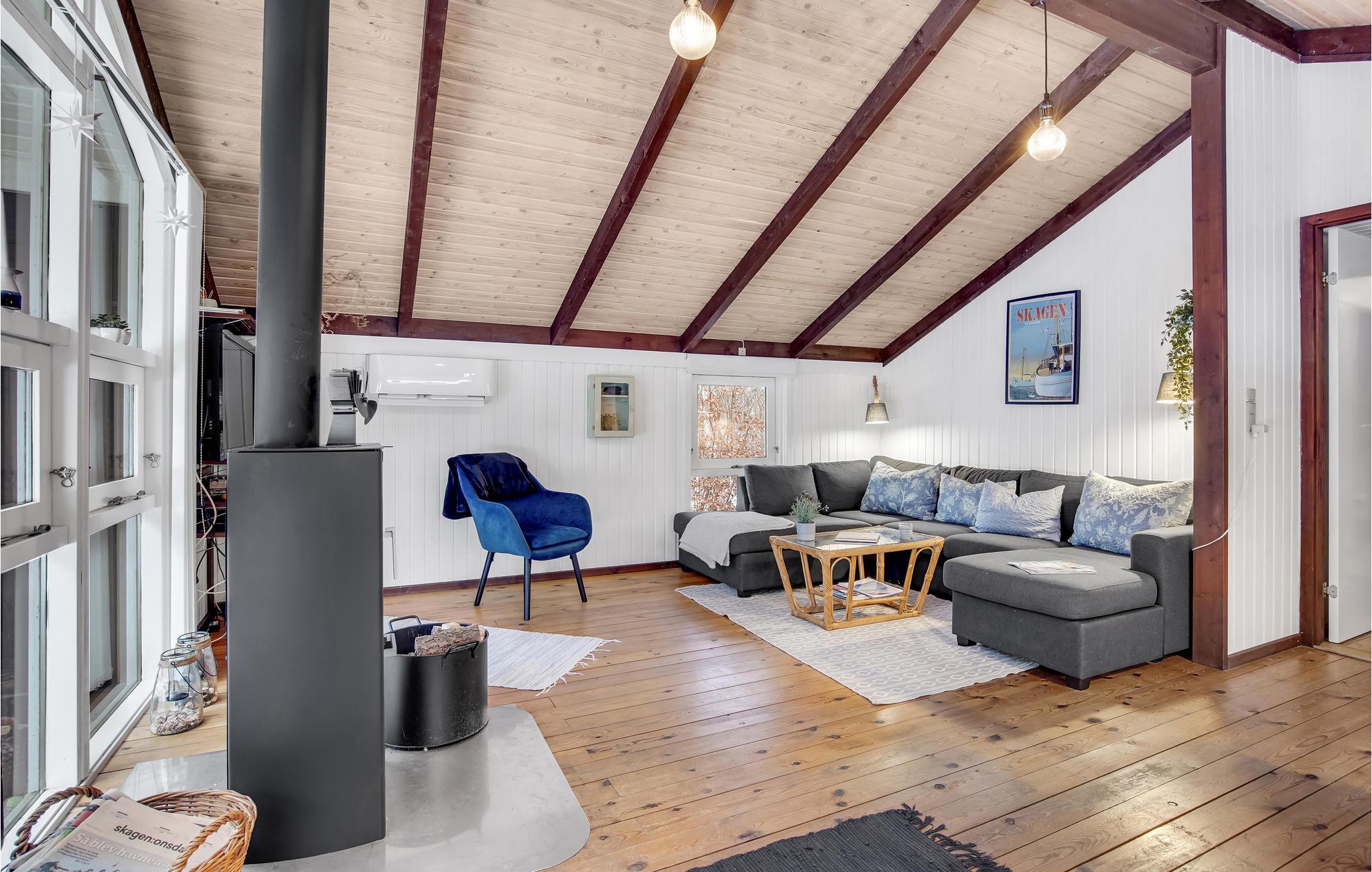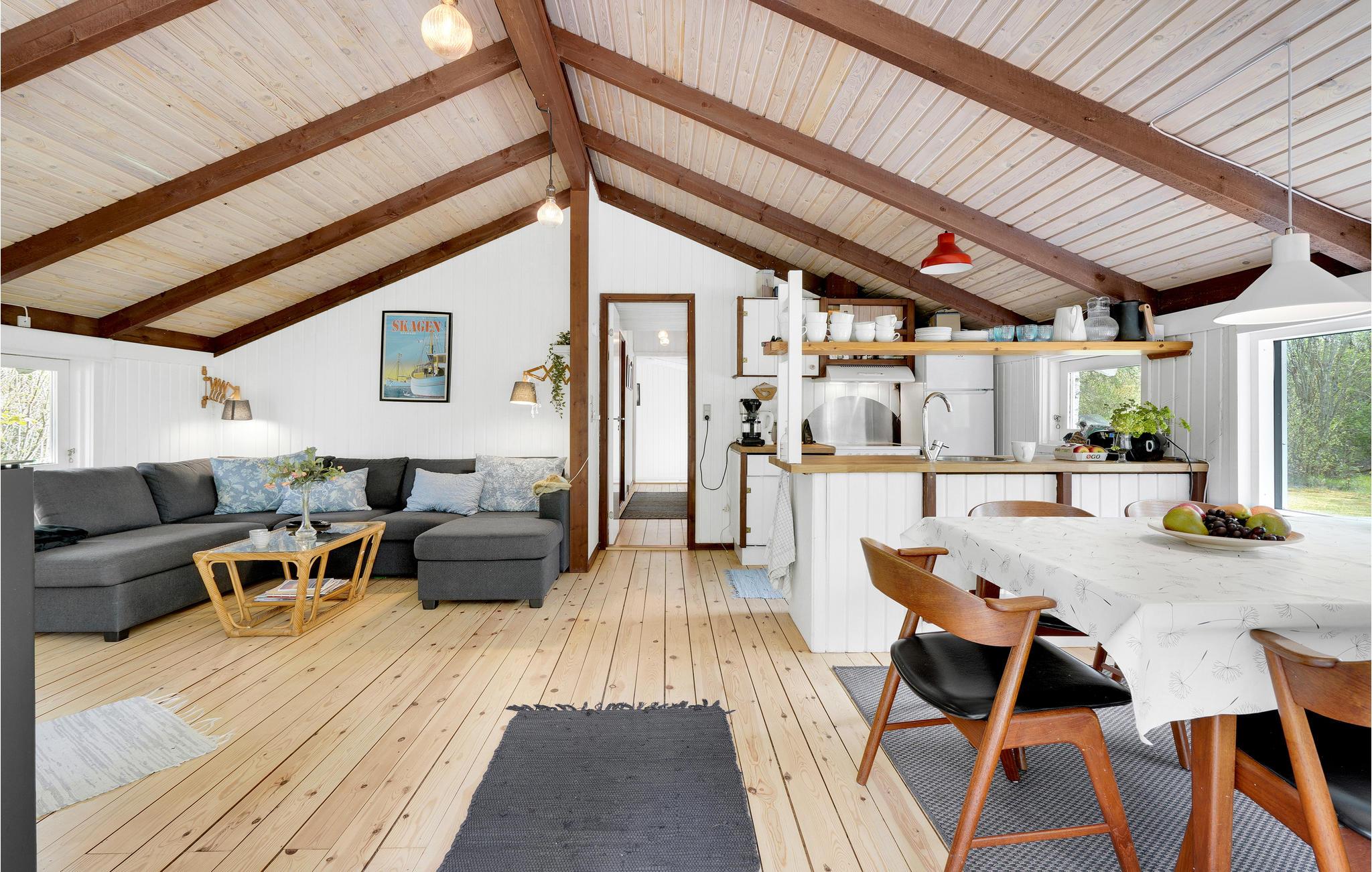 Velkommen til dette fine hus, der tilbyder jer en unik og hyggelig feriestemning. I får en særlig hyggelig og rummelig fornemmelse takket være åbent til kip. Helårsisolation og brændeovn sikrer behagelige vinterophold. Huset har trægulve, vægge- og lofter og fremstår lige moderne og rustikt. På den velplejede ejendom omkring huset er der en fliseterrasse, hvor I kan nyde solen og holde hyggelige grillaftener, samt god plads til boldspil og socialt samvær omkring bålpladsen.