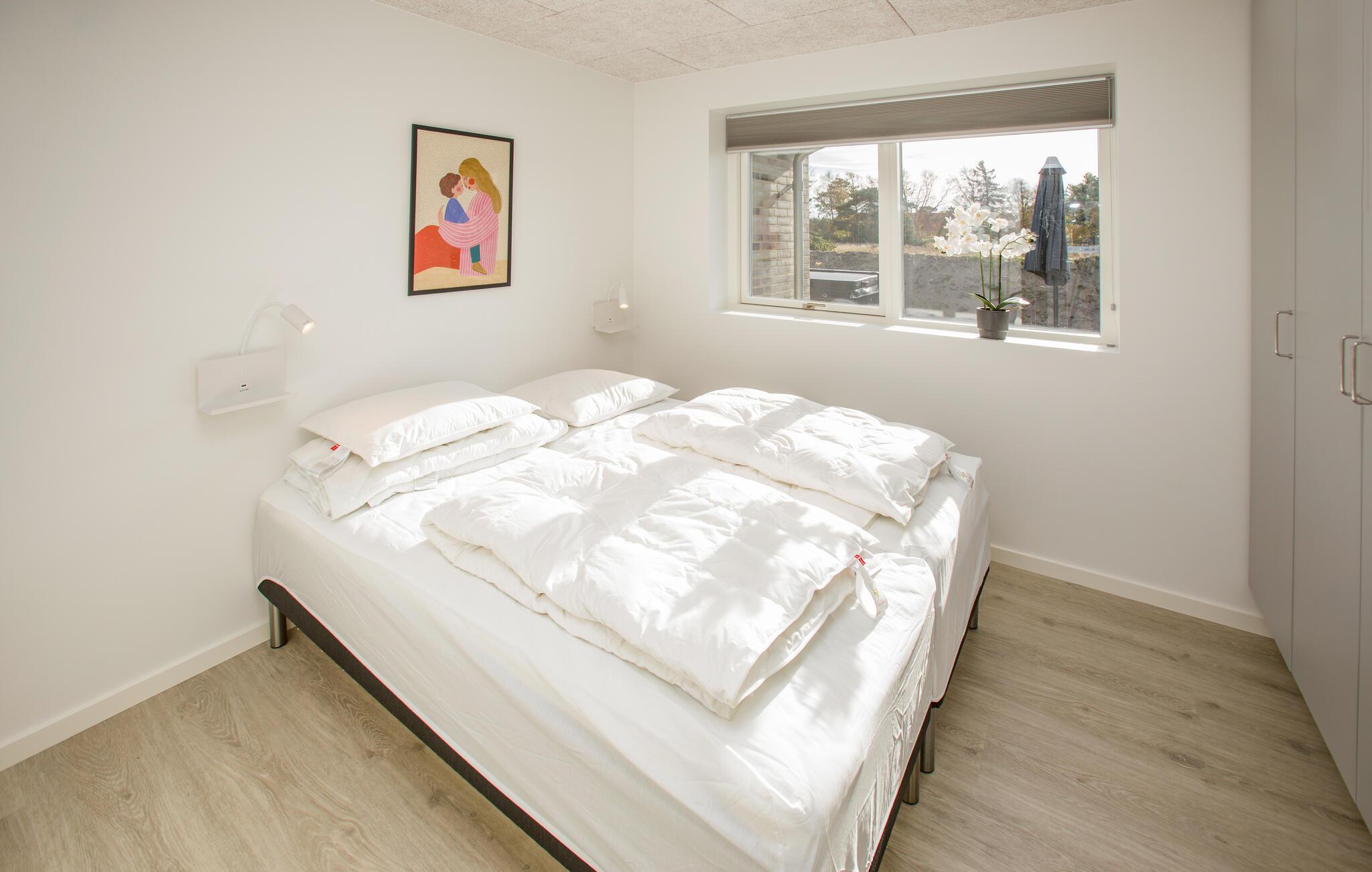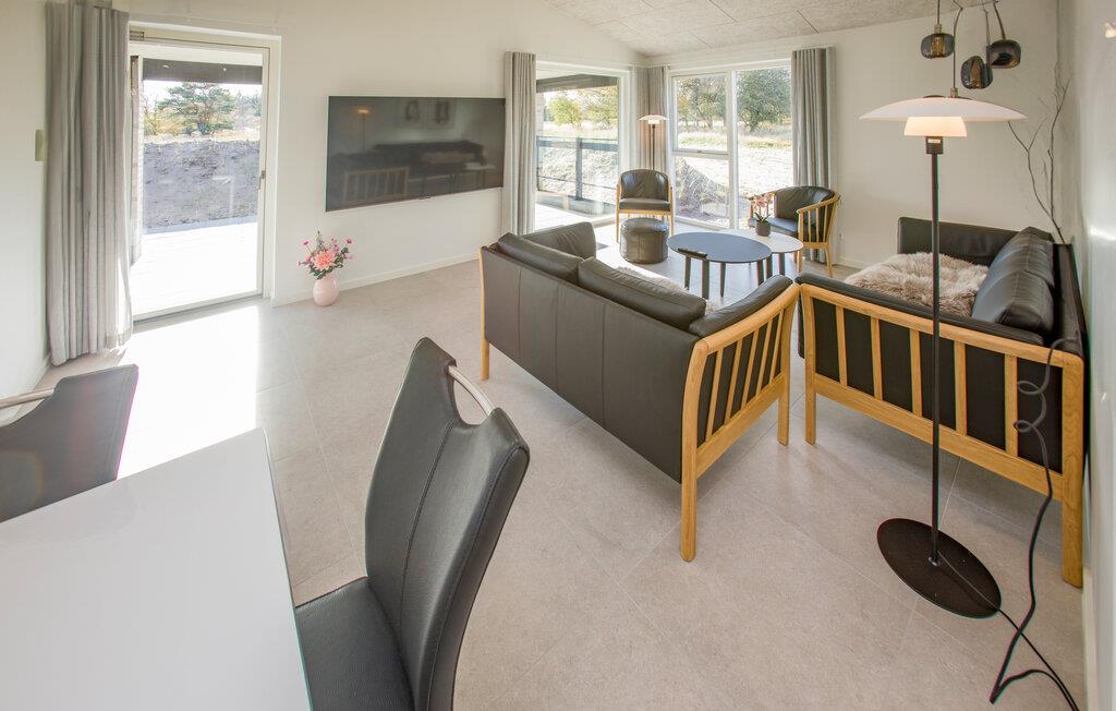 Der er lagt op til en række fredfyldte dage i dette stilfulde feriehus, der ligger lige ved siden af ??den attraktive Hvide Klit golfbane. Glæd jer til den lyse, åbne stue med elegante indretningsløsninger, store vinduer og komfortable siddeområder. Tilbered jeres måltider i det moderne, fuldt udstyrede køkken med kogeø og lækre apparater og nyd retterne ved det lange spisebord med udsigt over landskabet. Slap af i stuen foran det store smart-tv eller snup et spil billard eller bordtennis i det private aktivitetsrum.