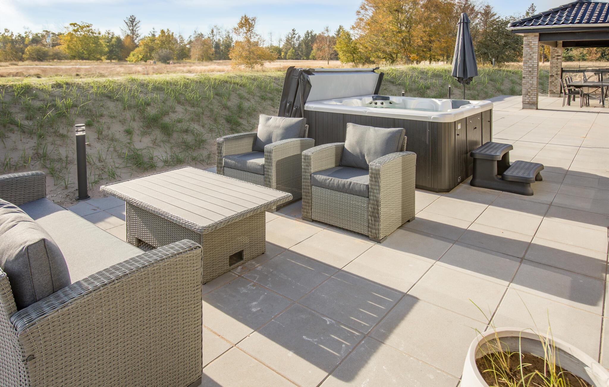 Træd ud på den rummelige sydvendte terrasse og afslut dagen i spabadet. Nyd de komfortable havemøbler og liggestole til en hvilestund eller spis morgenmad i det overdækkede område. Det velholdte udendørsområde lægger op til afslappende timer udendørs, mens børnene har masser af plads til at lege.