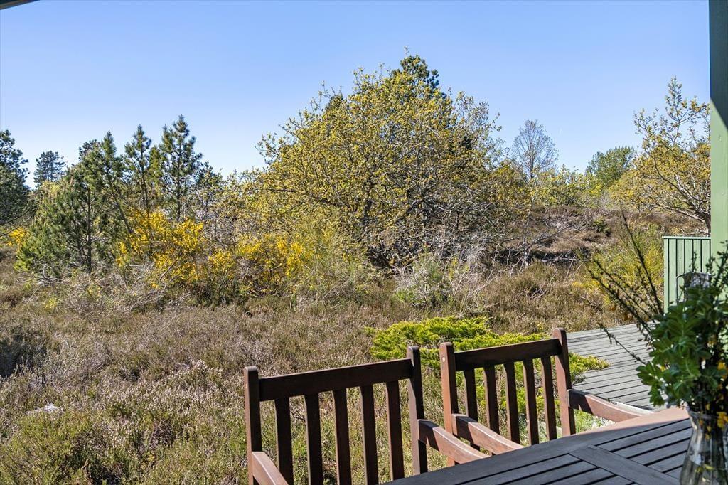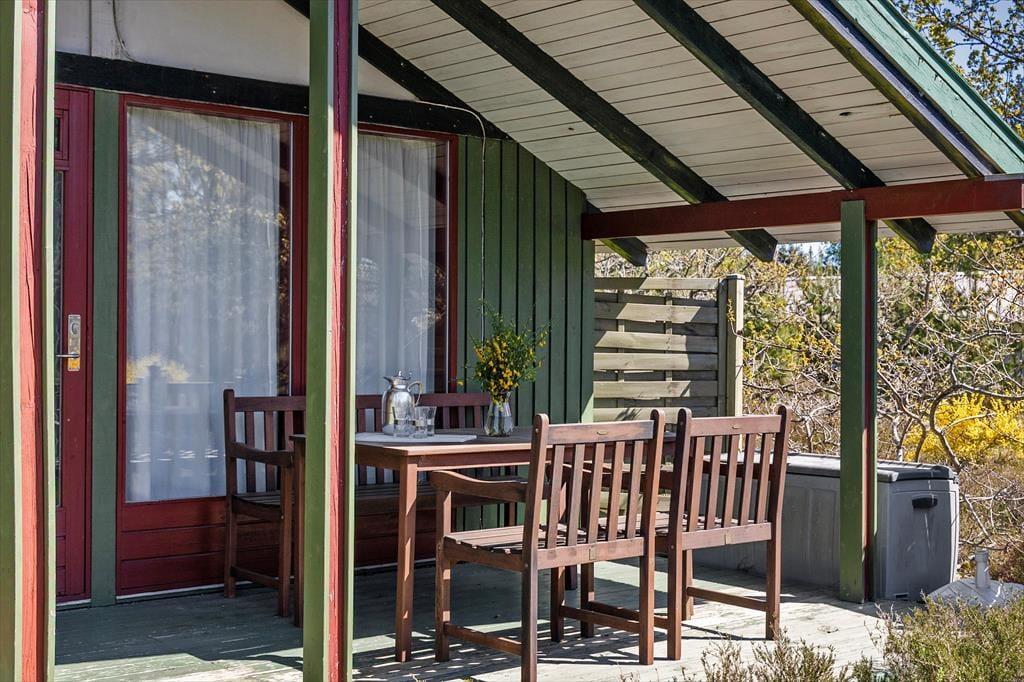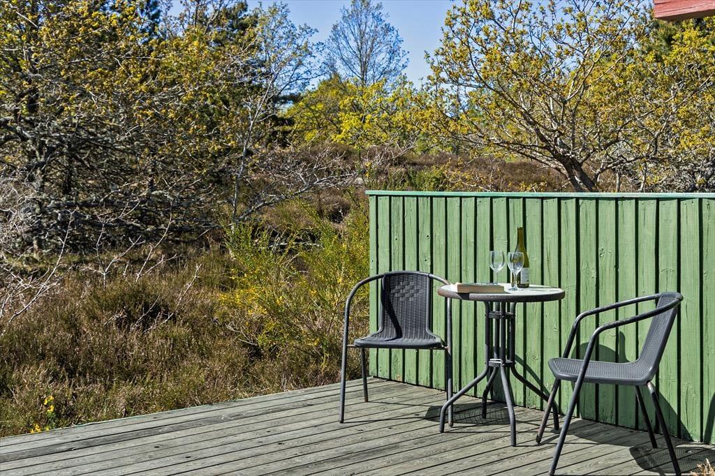 Når vejret viser sig fra sin bedste side, er sommerhusets store træterrasse det naturlige samlingspunkt. Her kan du nyde morgenkaffen i solen, dække op til frokost i skyggen eller tilberede aftensmaden på grillen, mens lydene fra naturen omkring dig skaber den perfekte baggrundsmusik. Naturgrunden, der omkranser huset, indbyder til leg og opdagelse, og de voksne kan finde fred og ro med udsigt til den vilde bevoksning. Her er plads til både leg og afslapning, og husets beliggenhed midt i naturen gør det let at koble helt af fra hverdagens travlhed.
