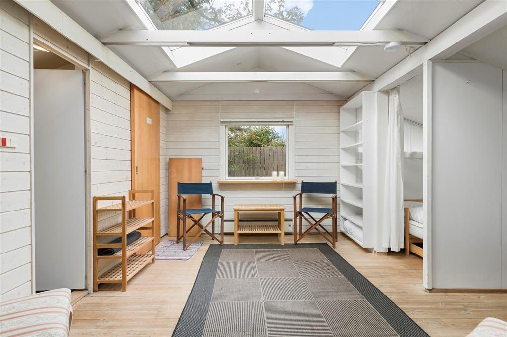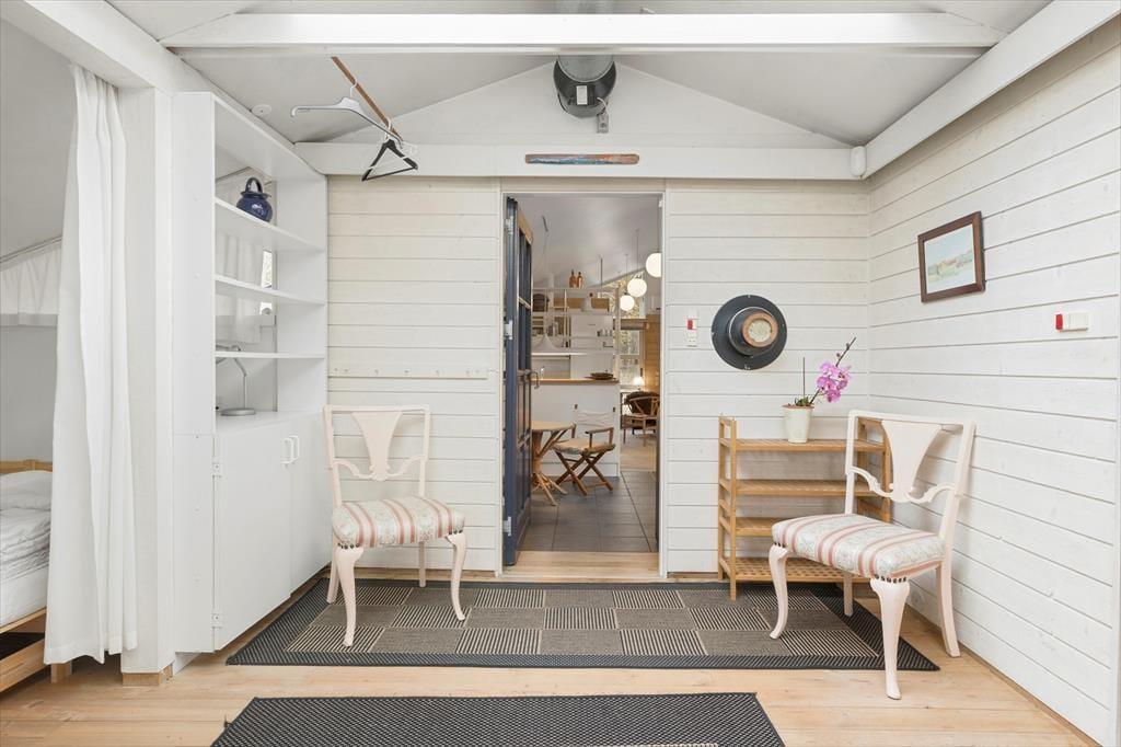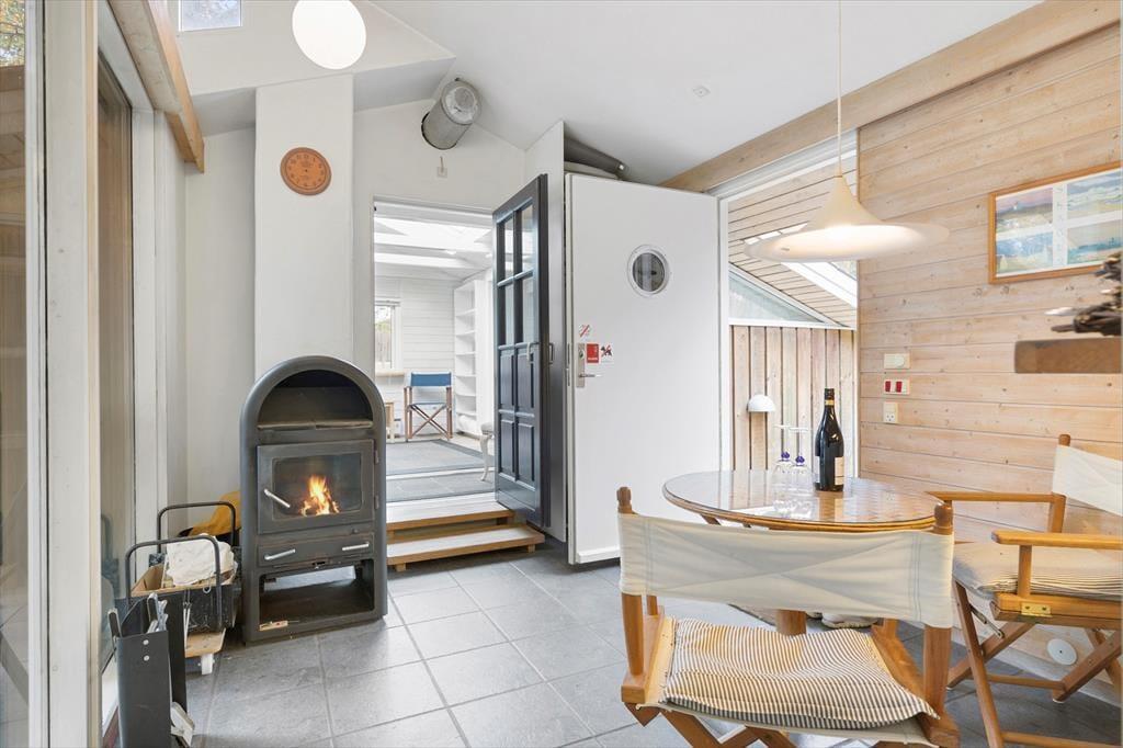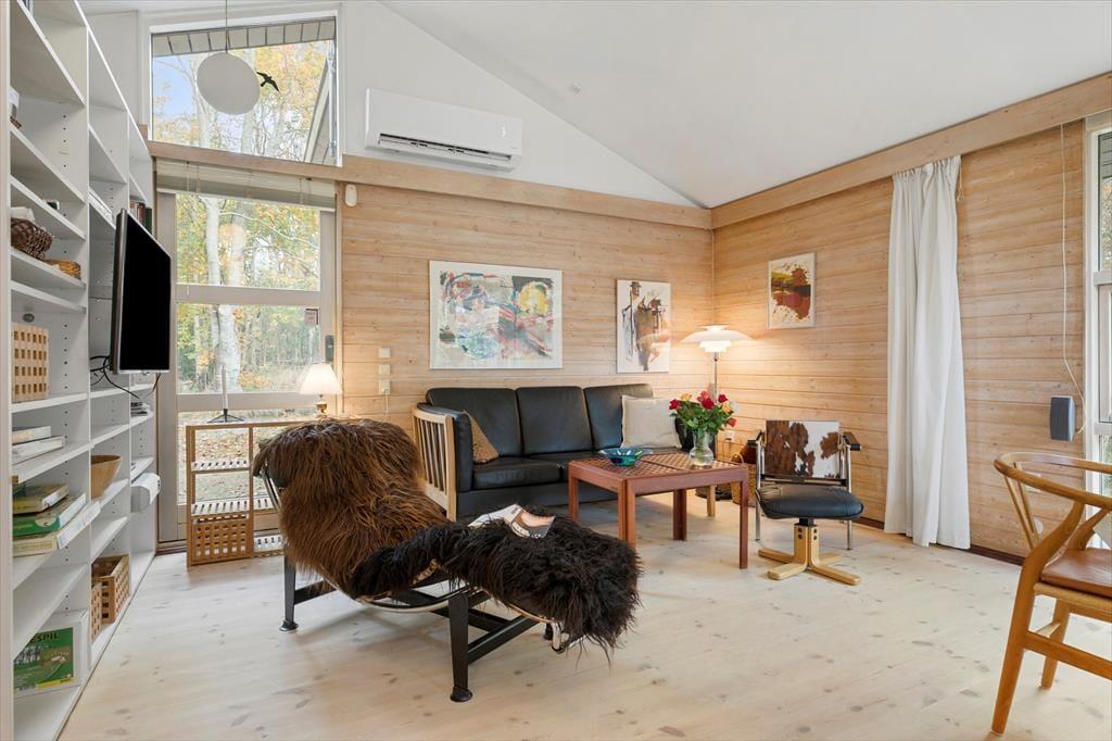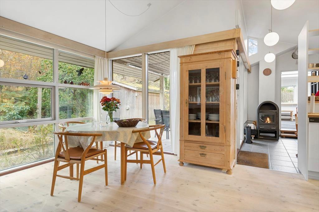 Sommerhuset byder dig velkommen med en varm og indbydende atmosfære. Det hyggelige køkkenområde med brændeovn bliver hurtigt et naturligt samlingspunkt, hvor du kan nyde både feriemåltider og gode samtaler, mens varmen fra brændeovnen skaber en afslappende stemning. Opholdsstuen, indrettet med komfortable møbler og store vinduespartier, giver et smukt kig ud til de grønne omgivelser, så naturen føles tæt på, selv når du er indenfor. Her er masser af plads til at slappe af, og sommerhuset emmer af en afslappet charme, der giver dig lyst til at blive.