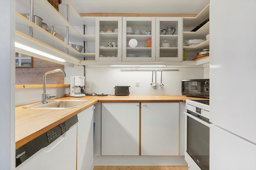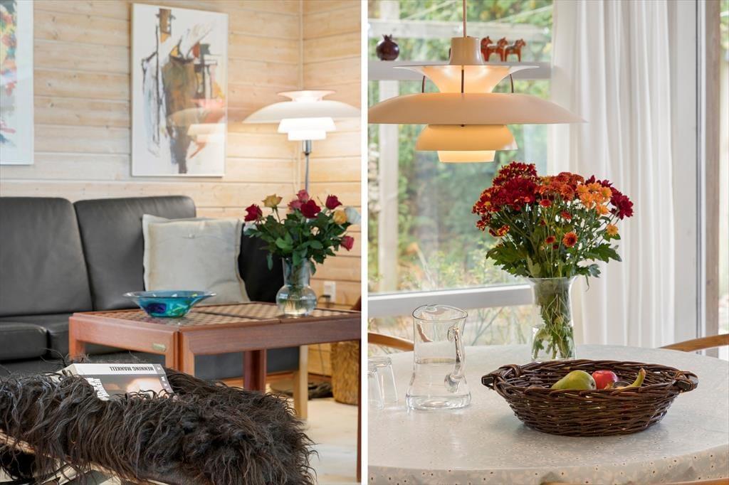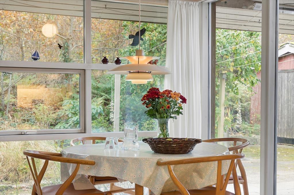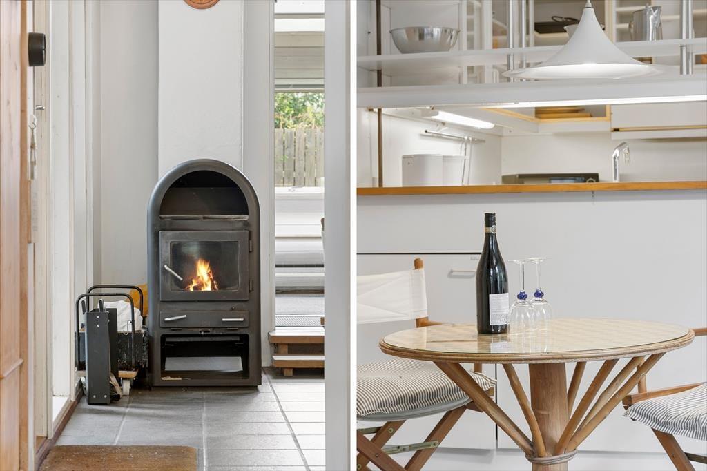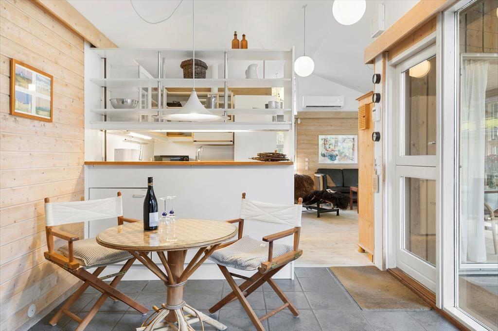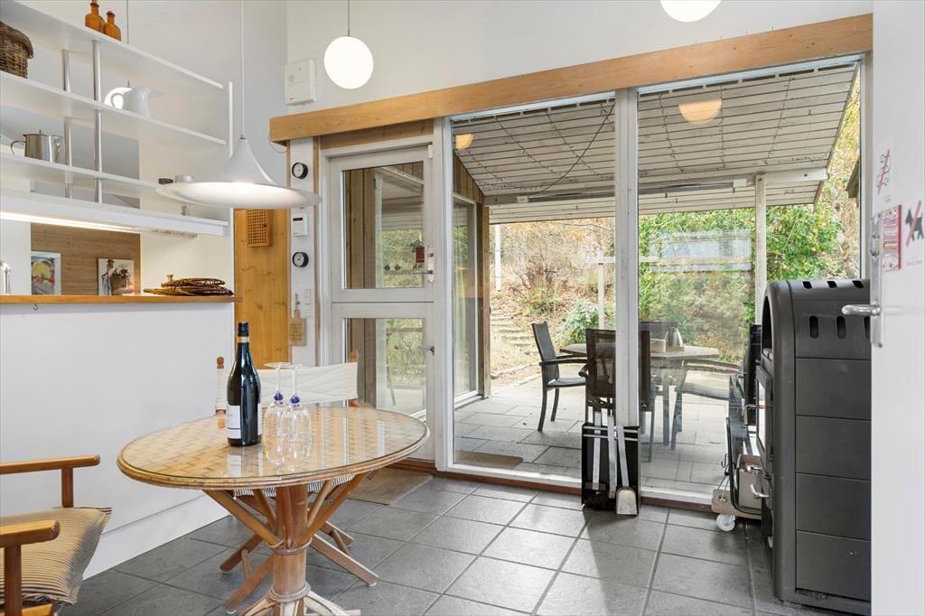 Sommerhuset byder dig velkommen med en varm og indbydende atmosfære. Det hyggelige køkkenområde med brændeovn bliver hurtigt et naturligt samlingspunkt, hvor du kan nyde både feriemåltider og gode samtaler, mens varmen fra brændeovnen skaber en afslappende stemning. Opholdsstuen, indrettet med komfortable møbler og store vinduespartier, giver et smukt kig ud til de grønne omgivelser, så naturen føles tæt på, selv når du er indenfor. Her er masser af plads til at slappe af, og sommerhuset emmer af en afslappet charme, der giver dig lyst til at blive.