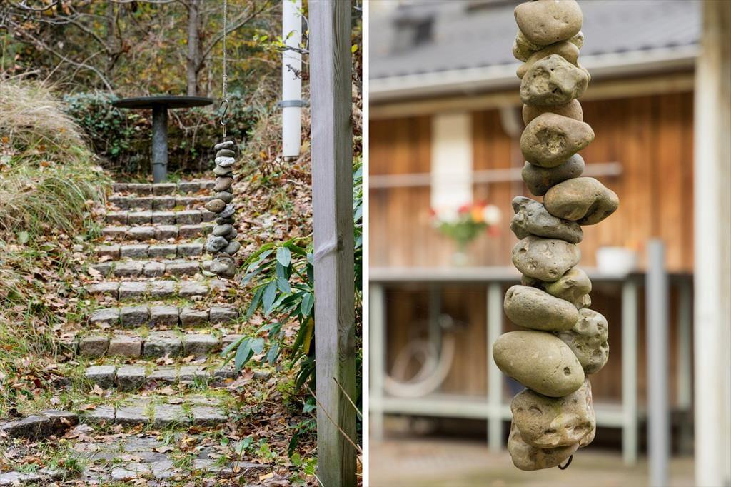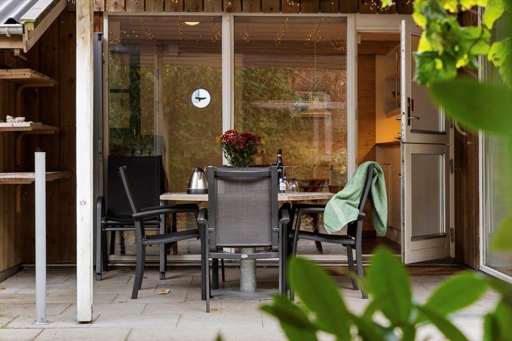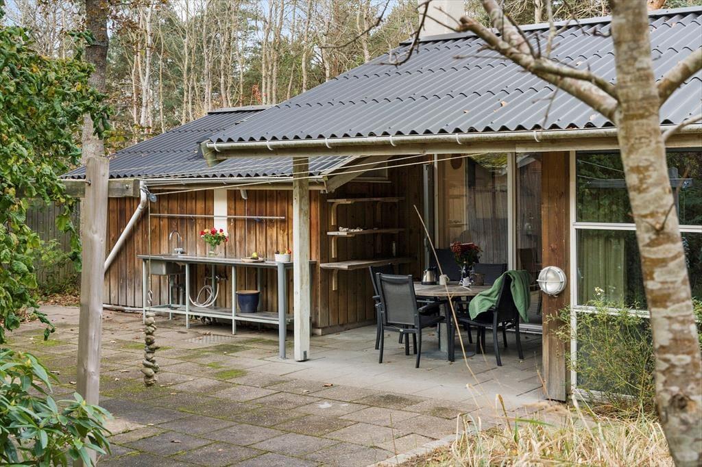 Terrassen foran sommerhuset indbyder til lange sommerdage i solen og aftener med grill og hygge. Den hyggelige terrasse er møbleret med komfortable siddepladser og omgivet af grønne træer, som skaber et afskærmet og roligt udeområde. Her kan du starte dagen med morgenkaffen, mens fuglene kvidrer i trætoppene, eller tage en stille stund om aftenen, når solen går ned over skovens træer.