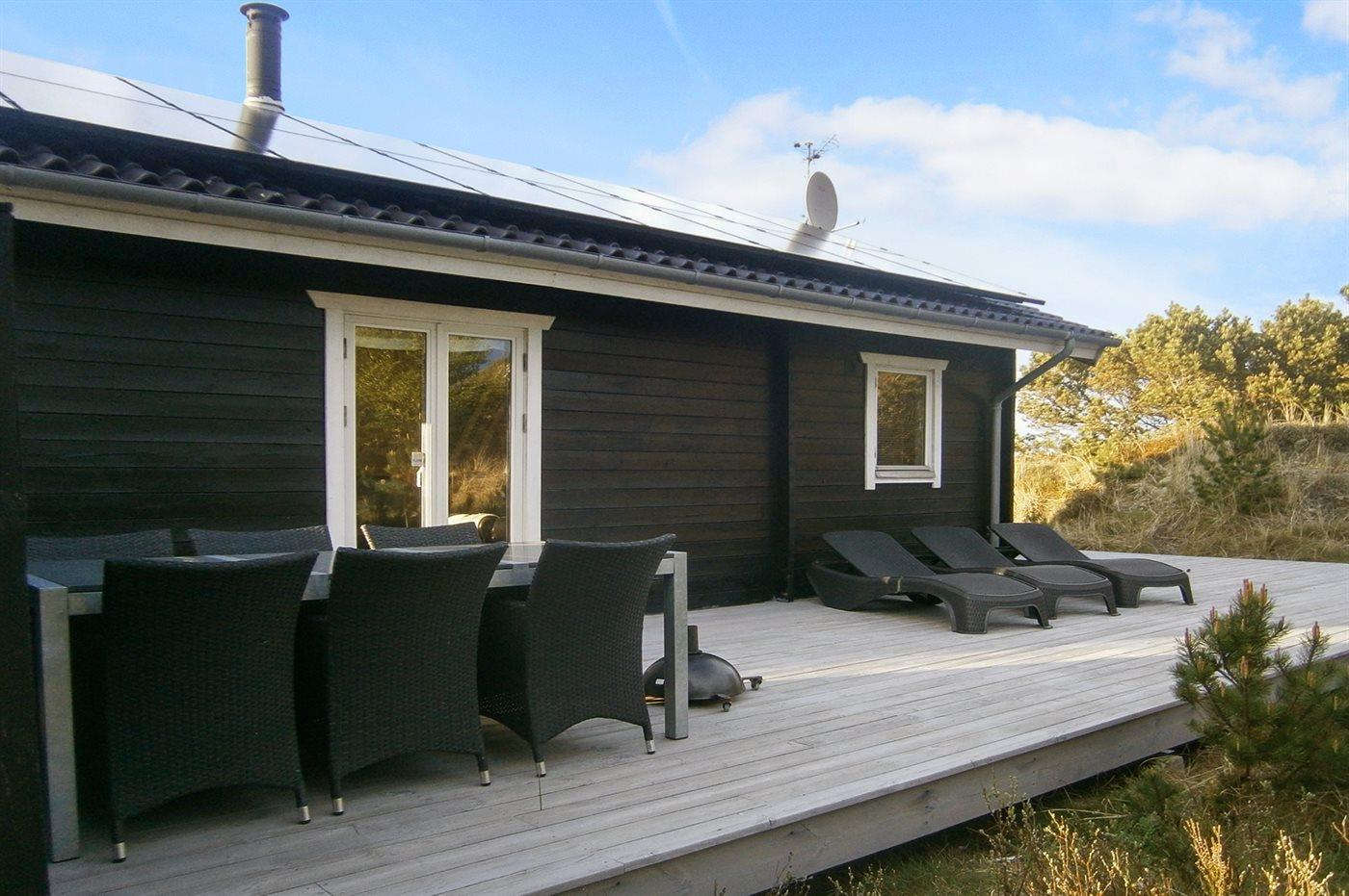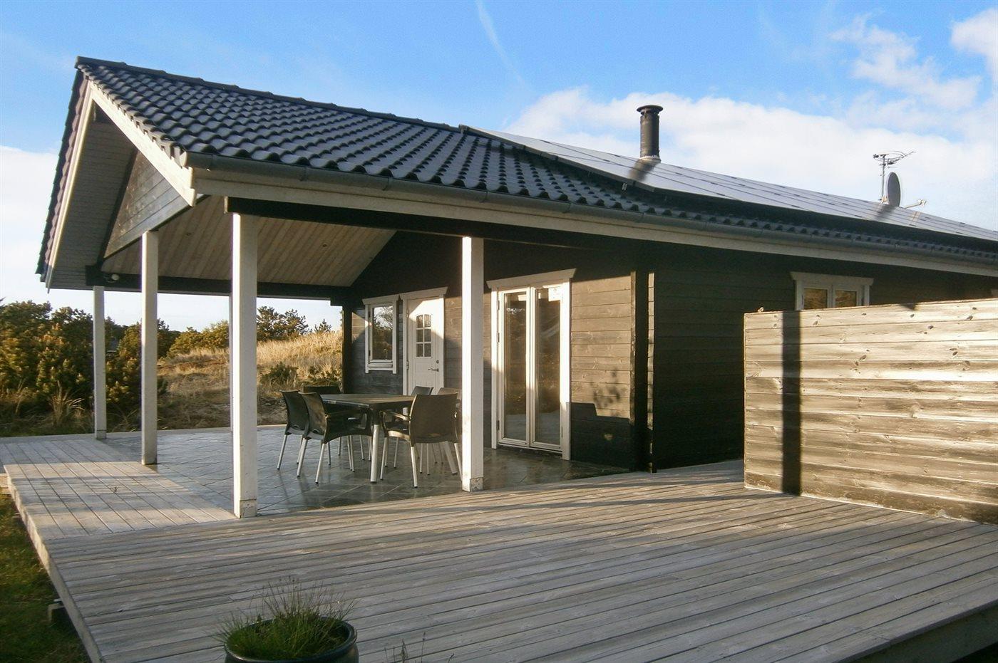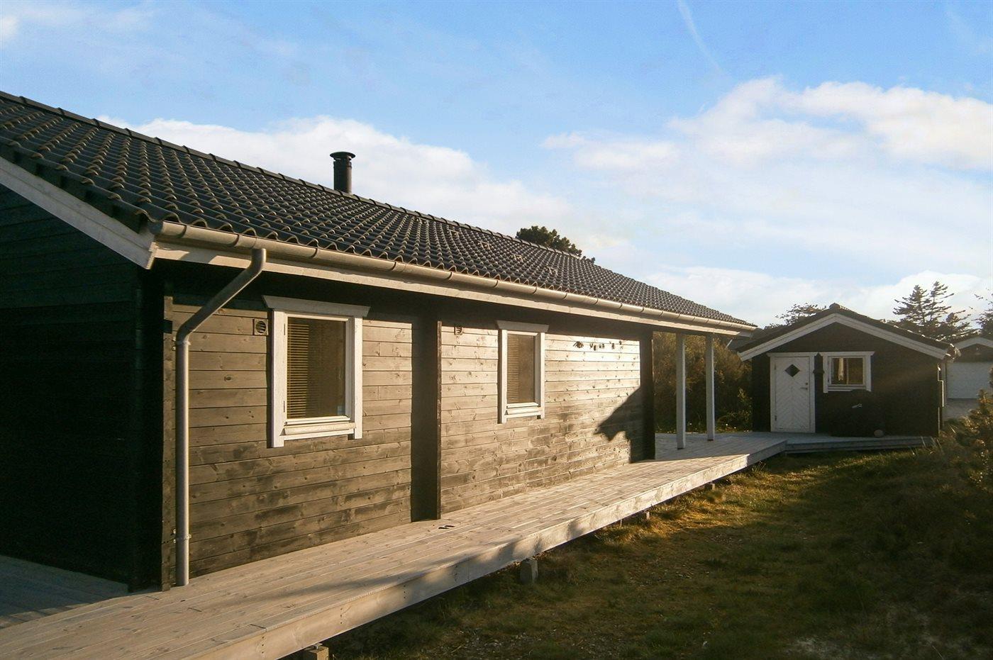 Dette bjælkesommerhus, bygget i 2005, er beliggende på en smuk, lyngbeklædt klitgrund nord for Aalbæk i et lille sommerhusområde 150 m fra strand og vand. Der er udsigt til klitterne samt direkte adgang til stranden over klitterne.