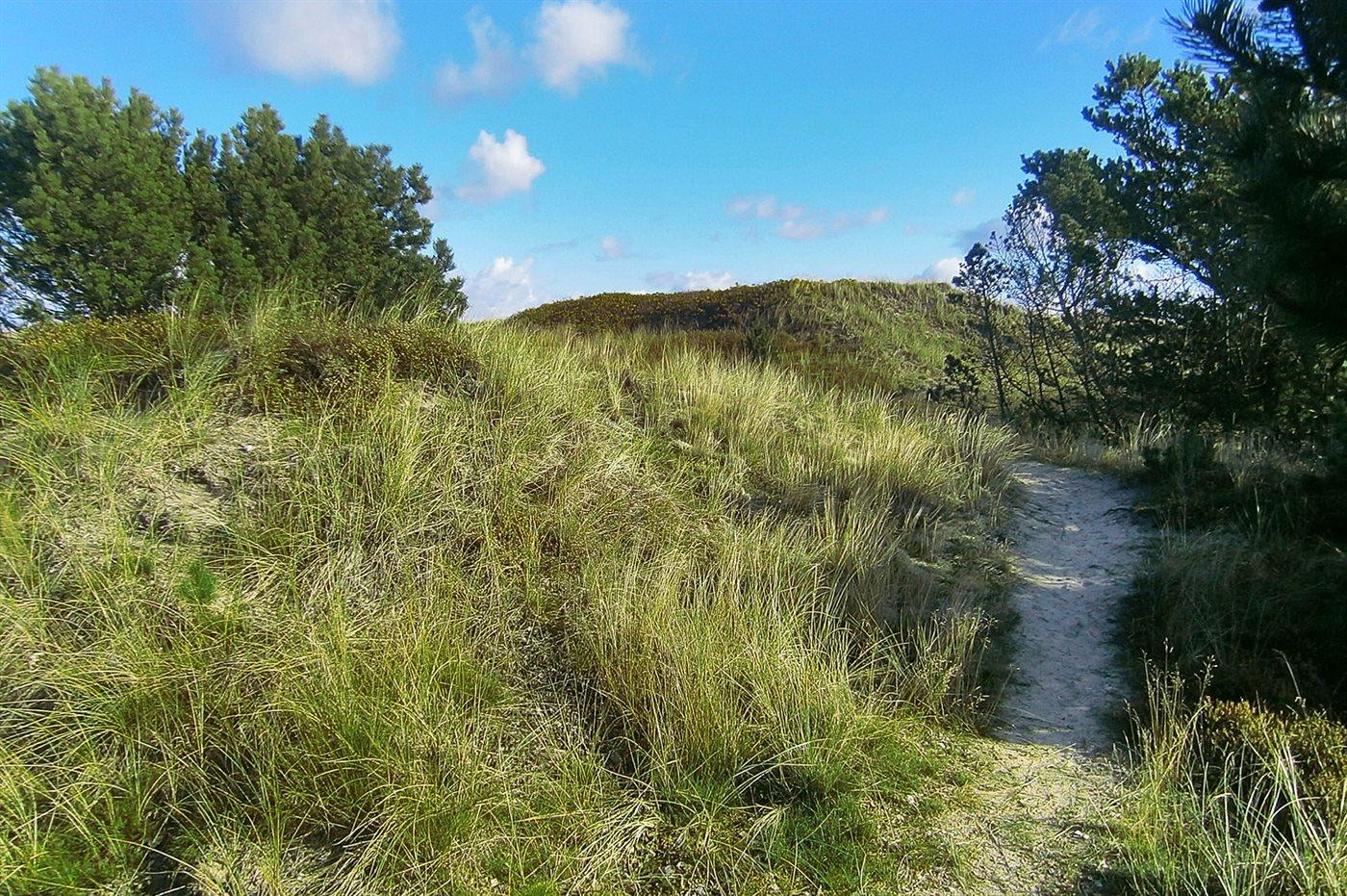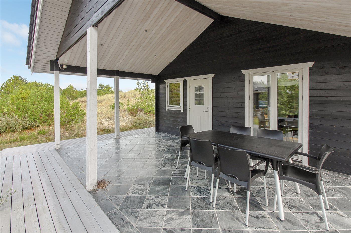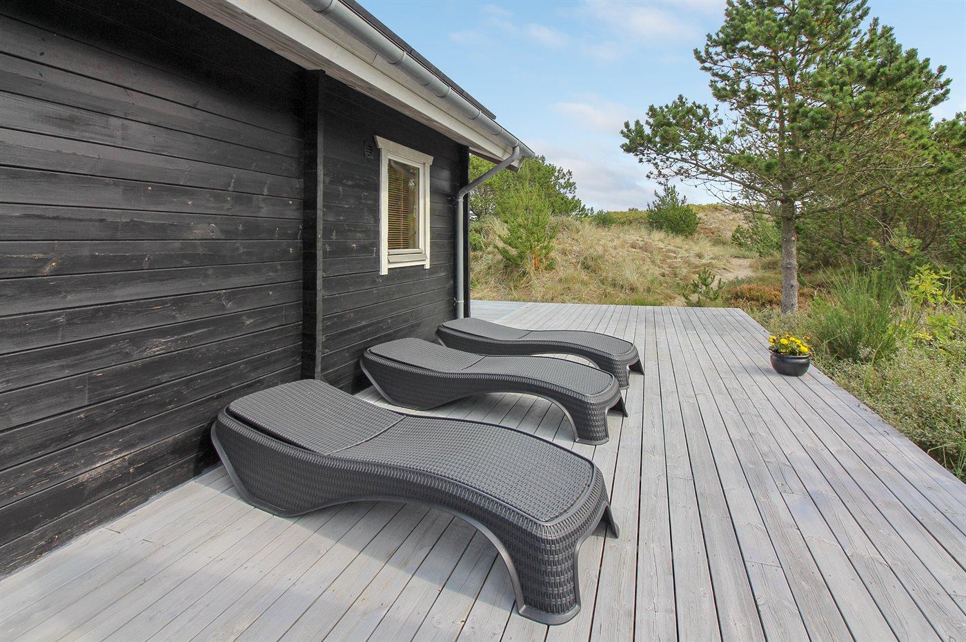 Dette bjælkesommerhus, bygget i 2005, er beliggende på en smuk, lyngbeklædt klitgrund nord for Aalbæk i et lille sommerhusområde 150 m fra strand og vand. Der er udsigt til klitterne samt direkte adgang til stranden over klitterne.