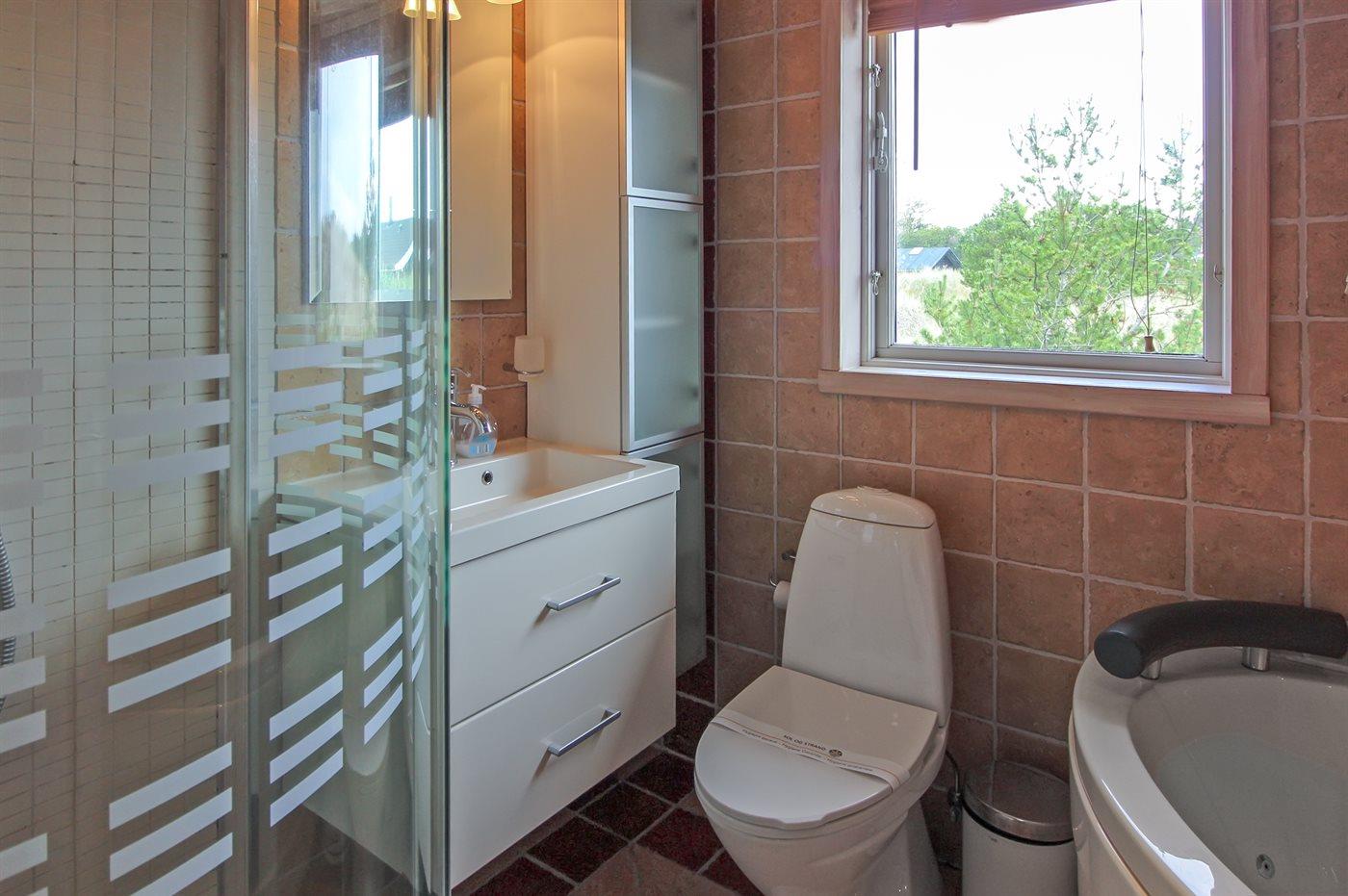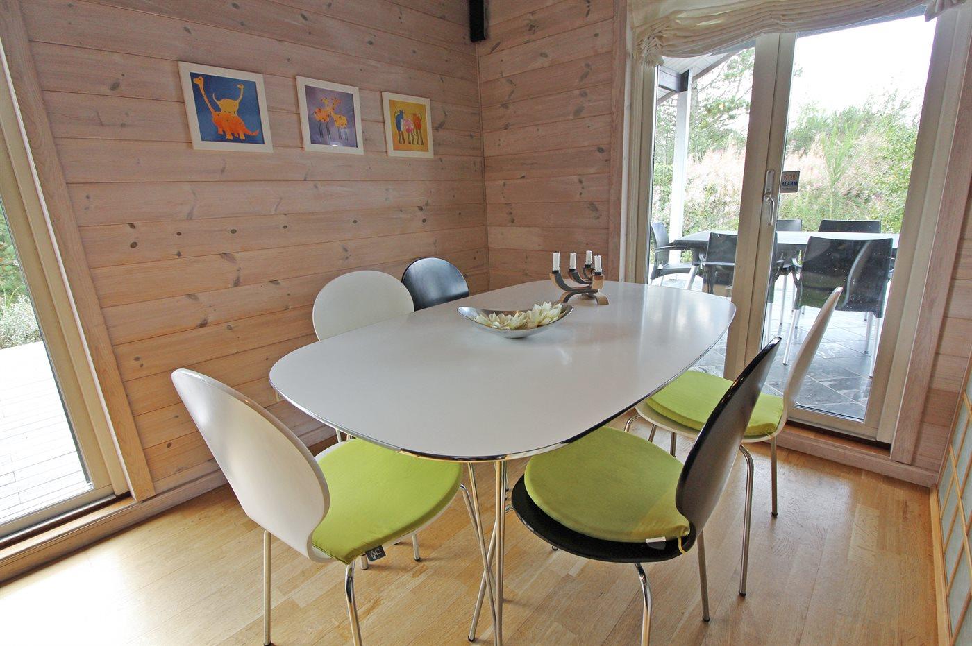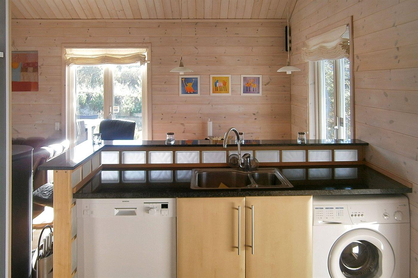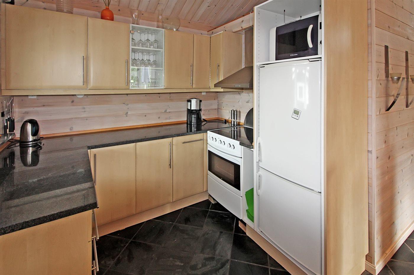 Til huset hører såvel overdækket terrasse som stort åbent terrasseareal med diverse havemøbler og grill. Trælofter og -vægge overalt. Trægulve, dog klinker i køkken og bad. Badeværelse med 2-pers. spa og bruseniche. Køkkenet er kombineret med stuen og er udstyret med opvaskemaskine, vaskemaskine, mikrobølgeovn, varmluftovn og komfur med keramiske kogeplader. Hyggelig stue med brændeovn, TV med parabol (digital), DVD-afspiller og stereoanlæg med CD-afspiller.