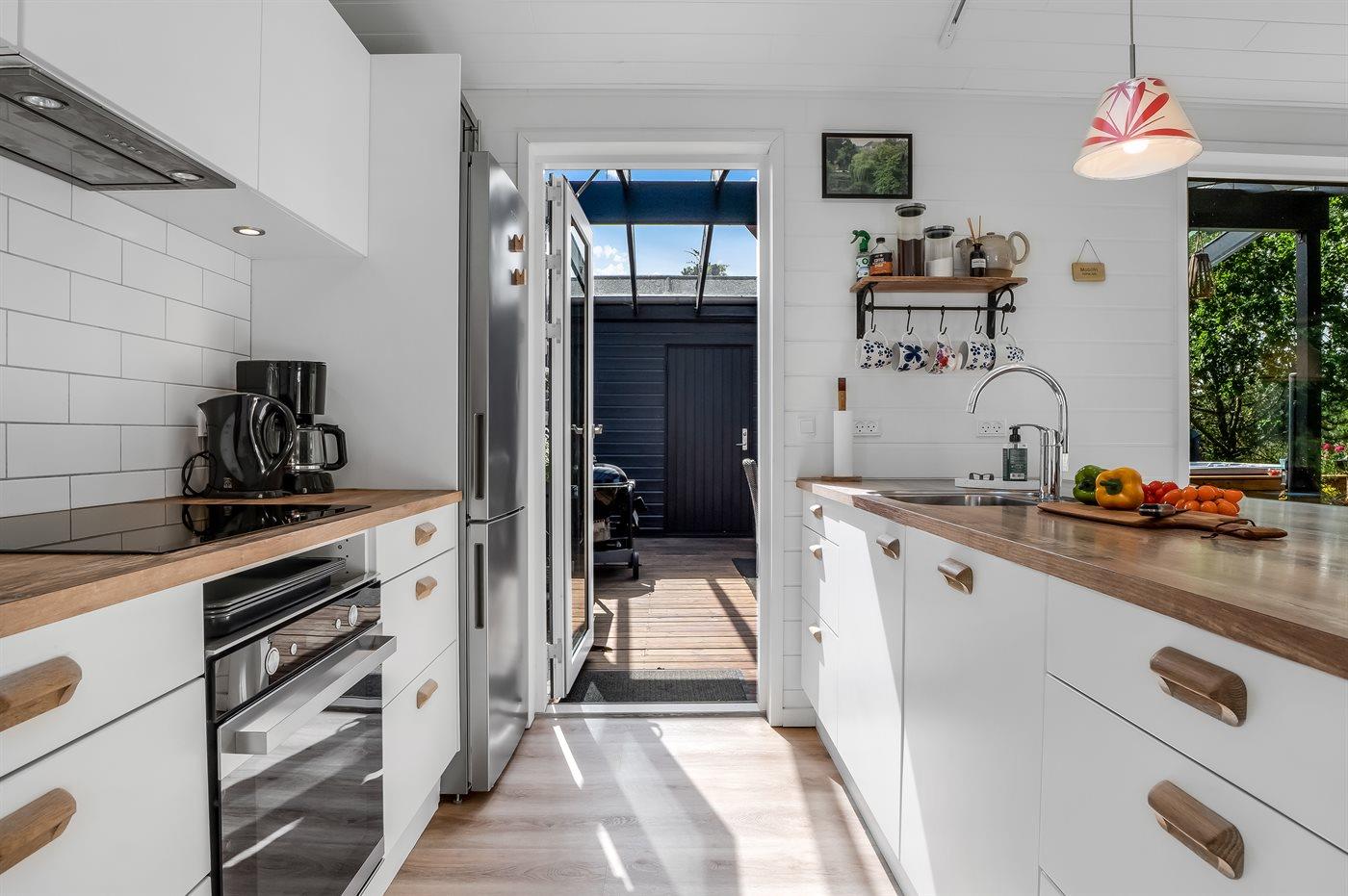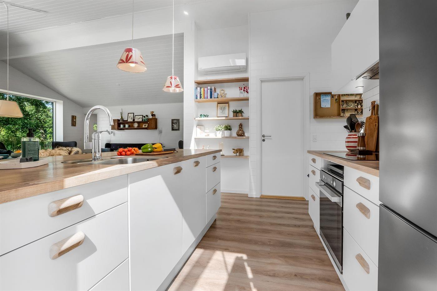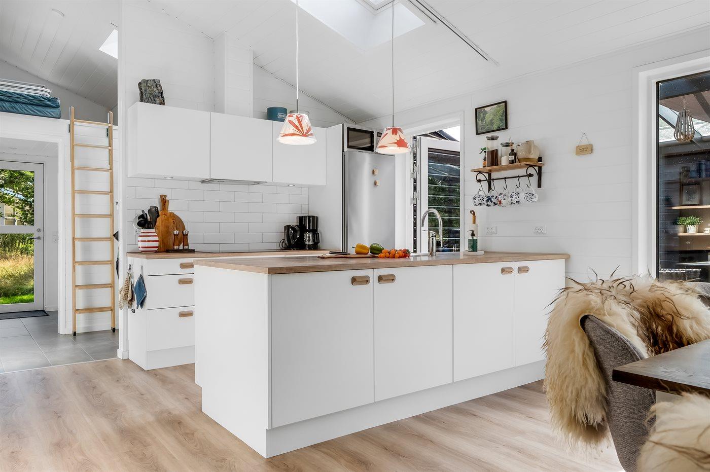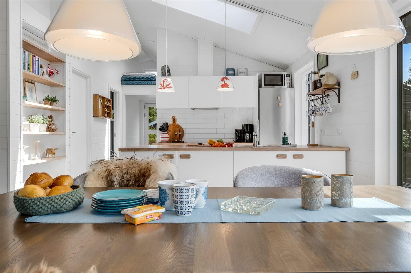 Køkkenet er udstyret med 1 køleskab. Der er 4 induktionskogeplader, varmluftovn, mikrobølgeovn samt opvaskemaskine.