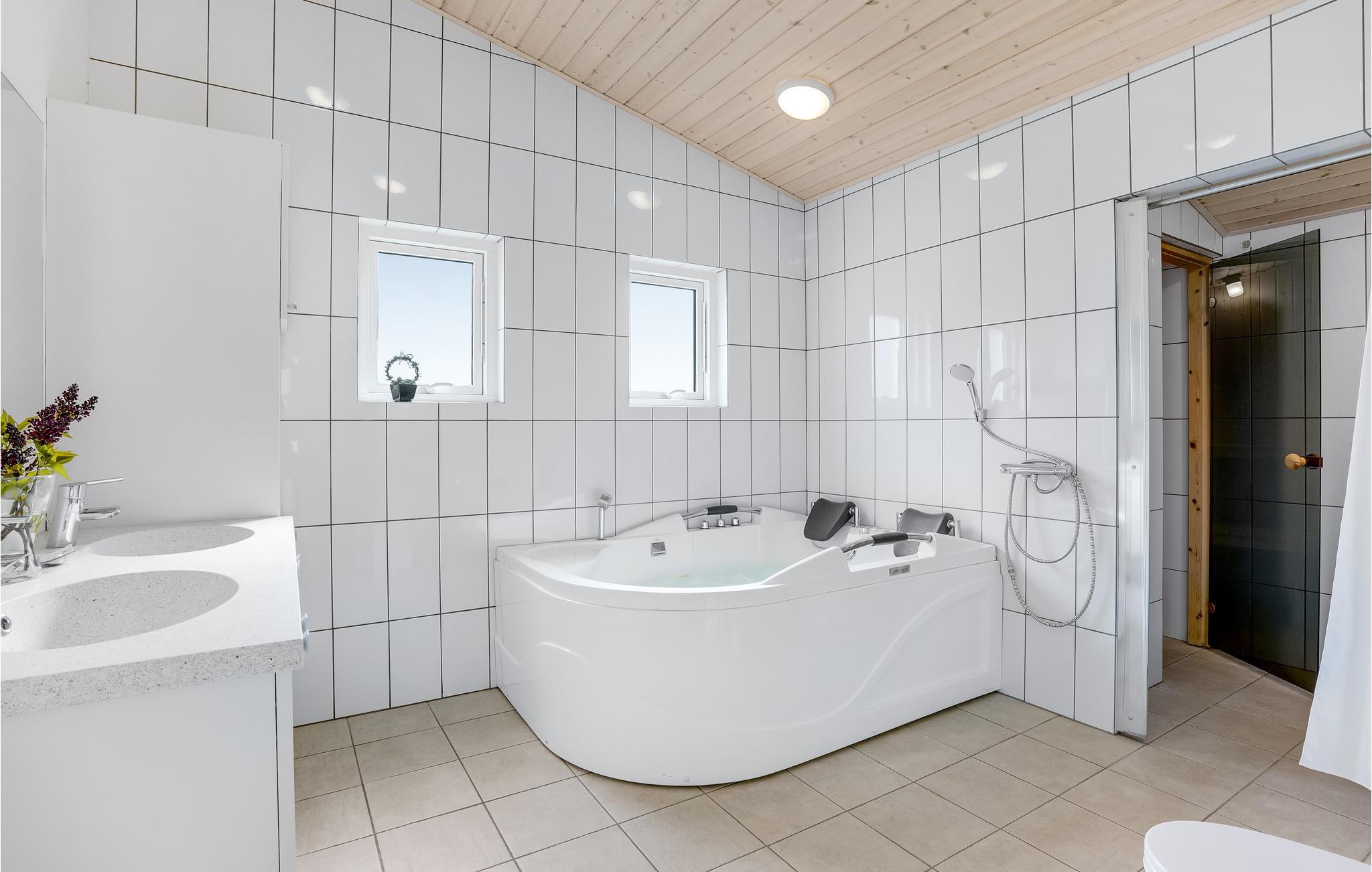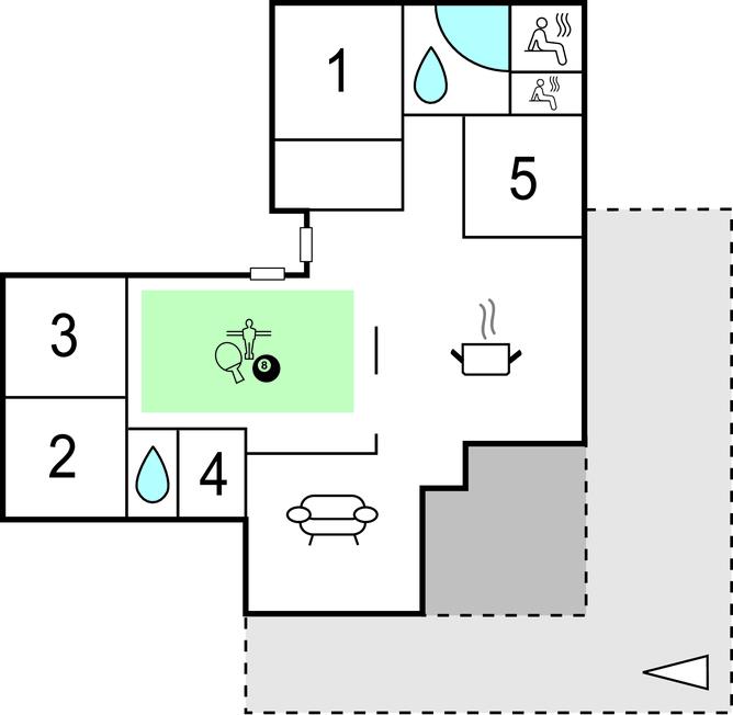 Huset er opført i gode materialer og er praktisk indrettet med flot udstyr og gode møbler. Husets store aktivitetsrum har både bordfodbold, bordtennis og poolbord, så her er mange timers underholdning for både børn og voksne. Det store badeværelse har foruden et velgørende spabad og sauna også en dampkabine.