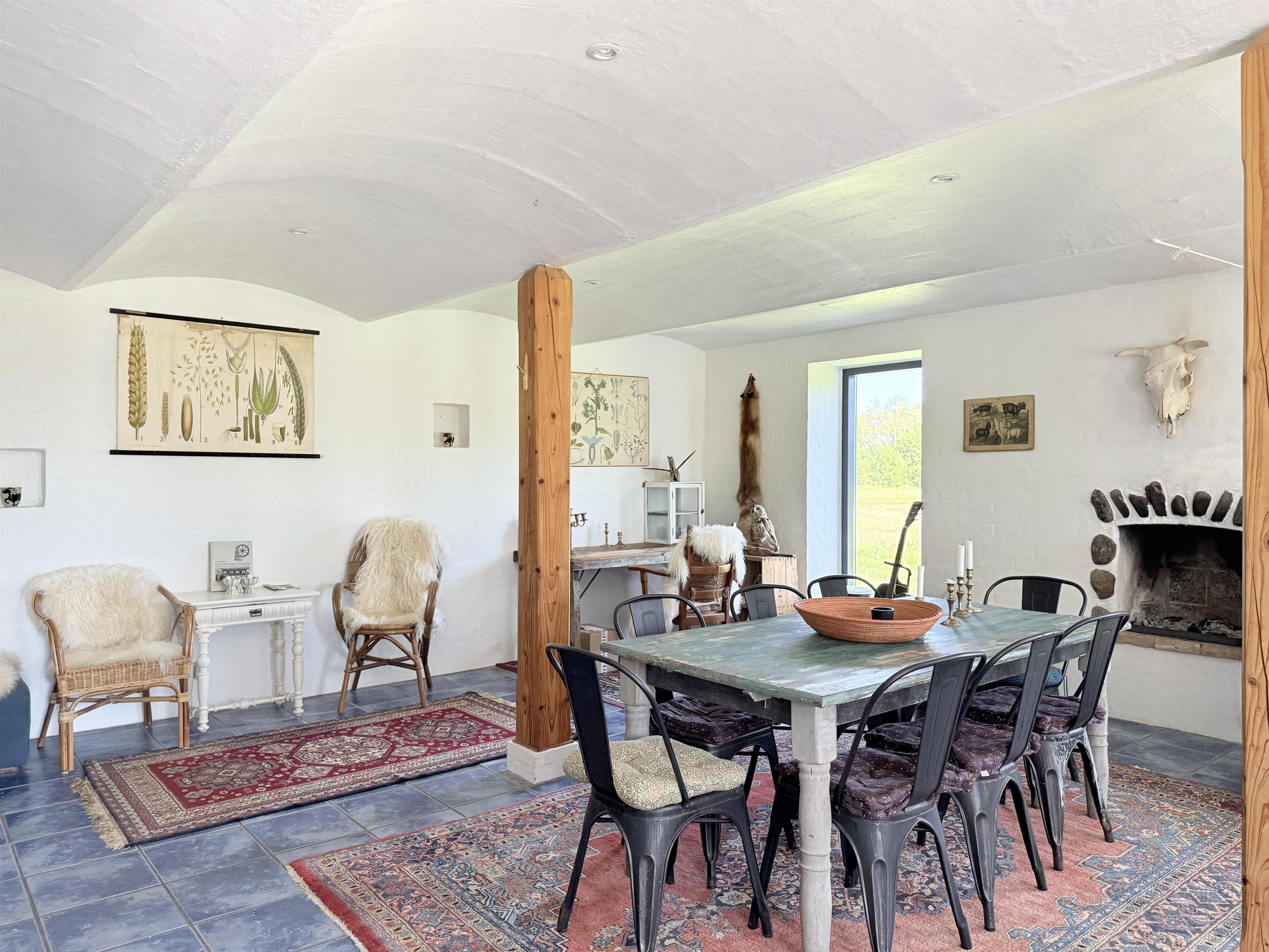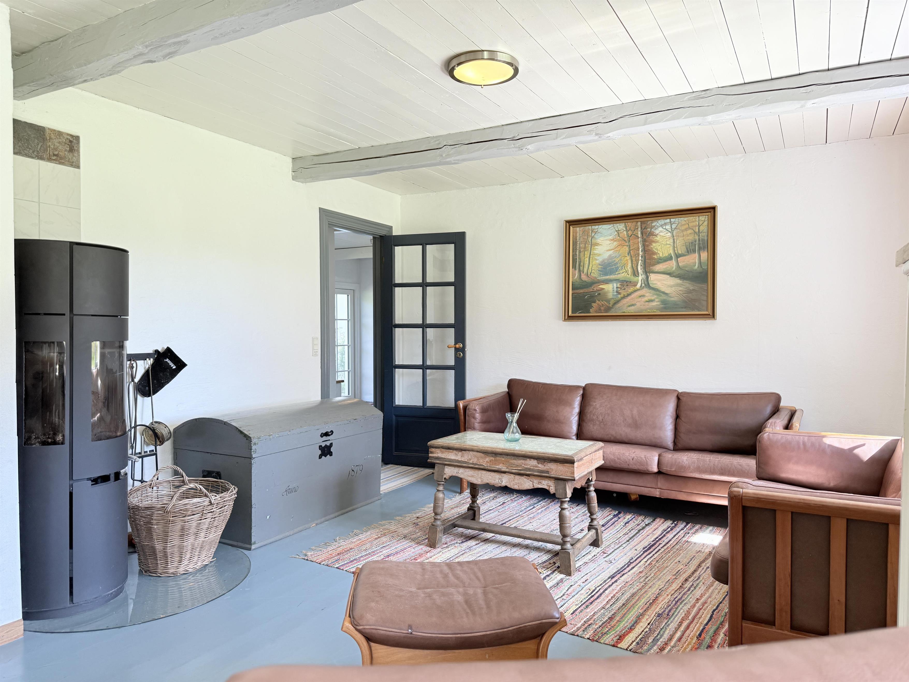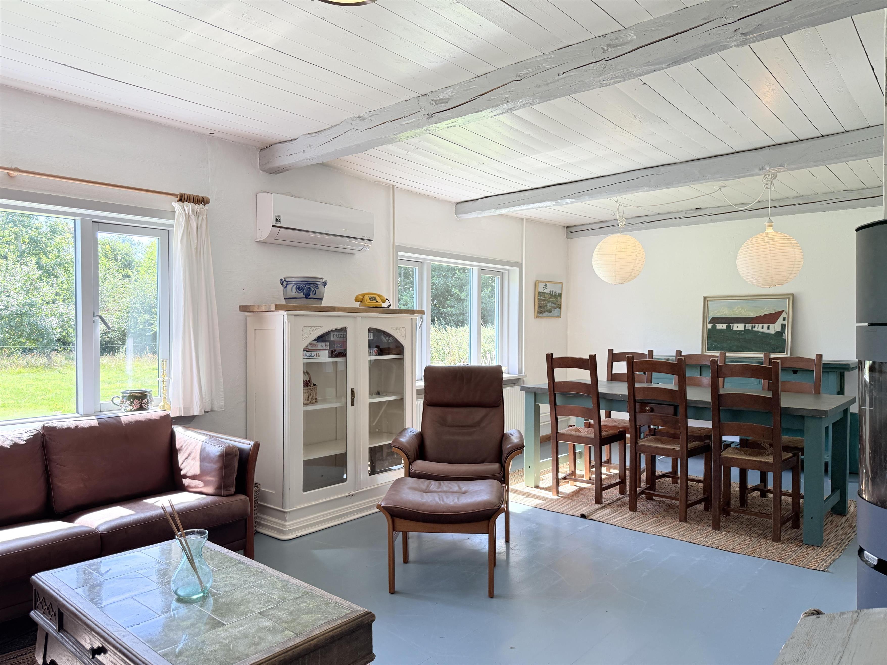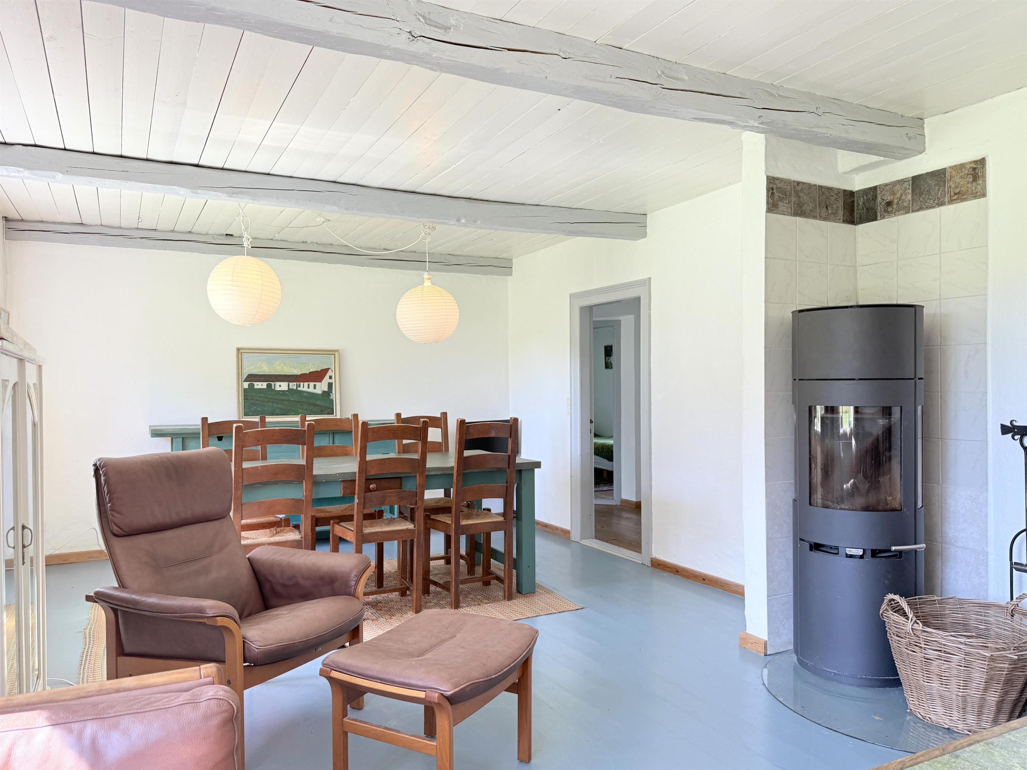 Gården har god plads til familien, og man kan fordele sig på de mange værelser, der er til rådighed. Husets samlingspunkt er den store, hyggelige spisestue med køkken. Her er der mange kroge med behagelige møbler, spiseplads og åbent køkken. Fra spisestuen er der udgang til ny, lækker terrasse med solkroge og dejlig stor have. Den anden længe af gården har tre soveværelser, endnu en spisestue samt et stort, fint badeværelse. Der er to soveværelser med to enkeltsenge, et soveværelse med dobbeltseng samt et ekstra værelse med en enkeltseng. Fra denne længe af gården kan man også gå ud i gårdhaven. Huset er udstyret med hele tre brændeovne, to i hver af stuerne samt i gangen.