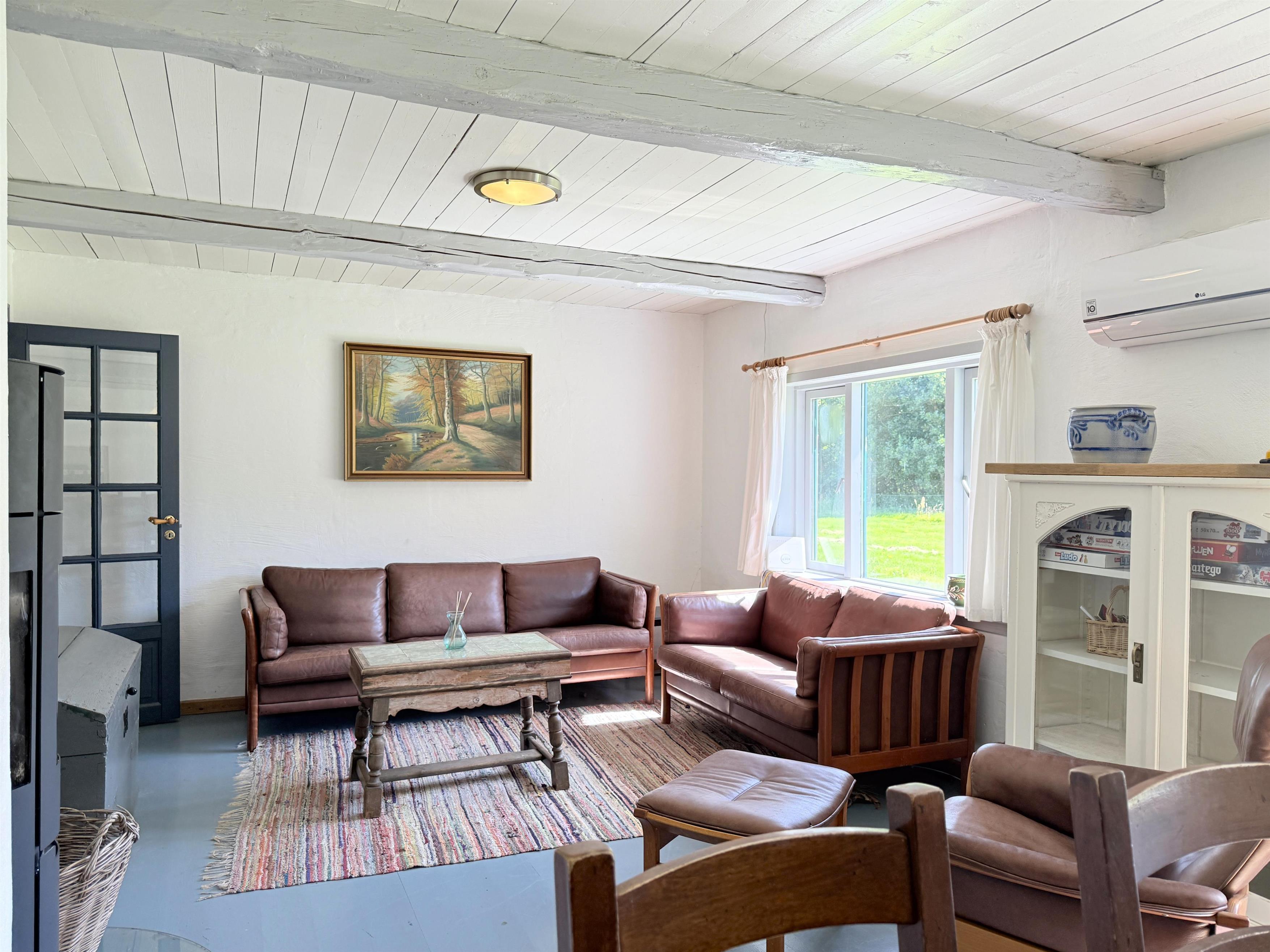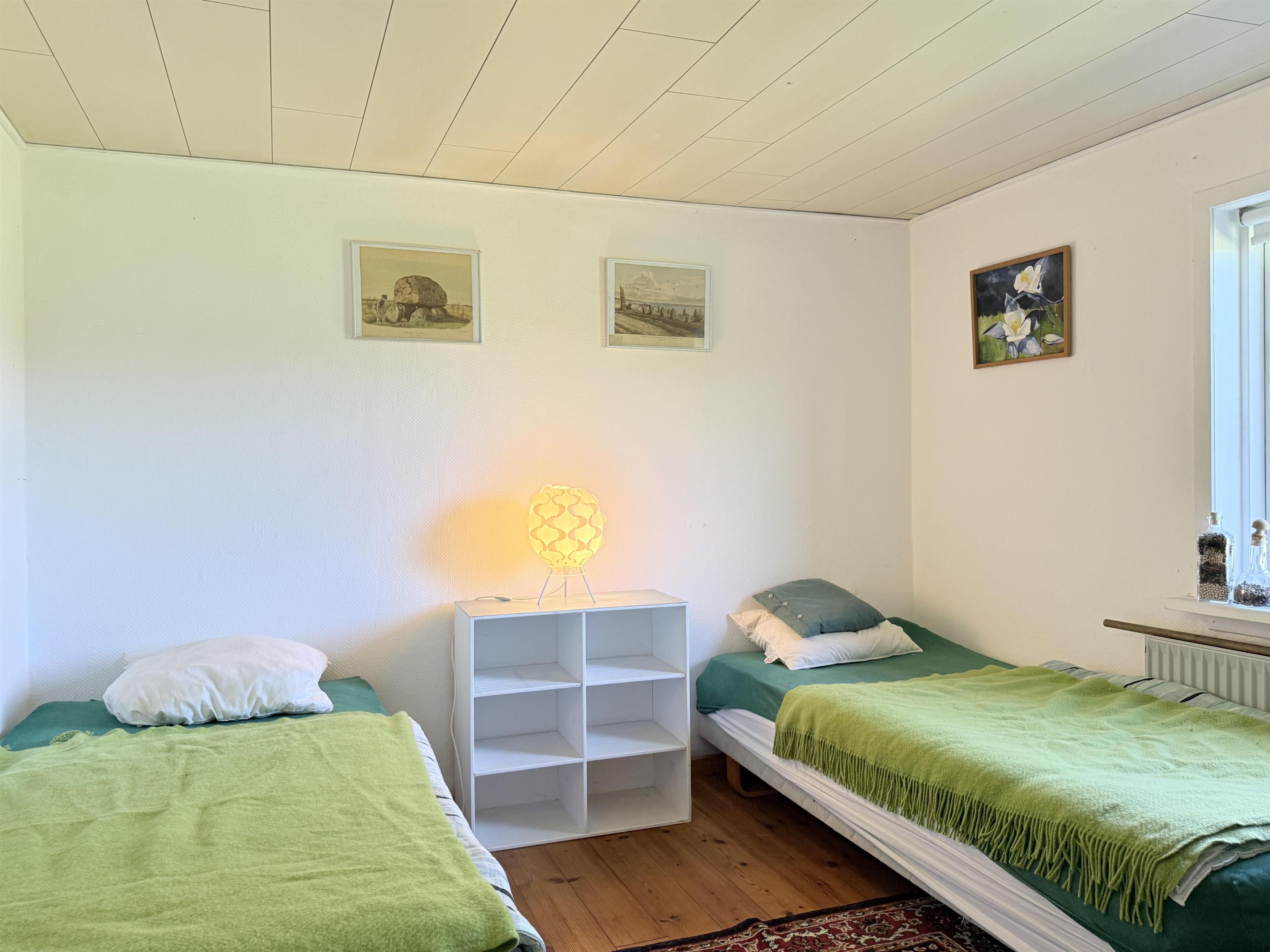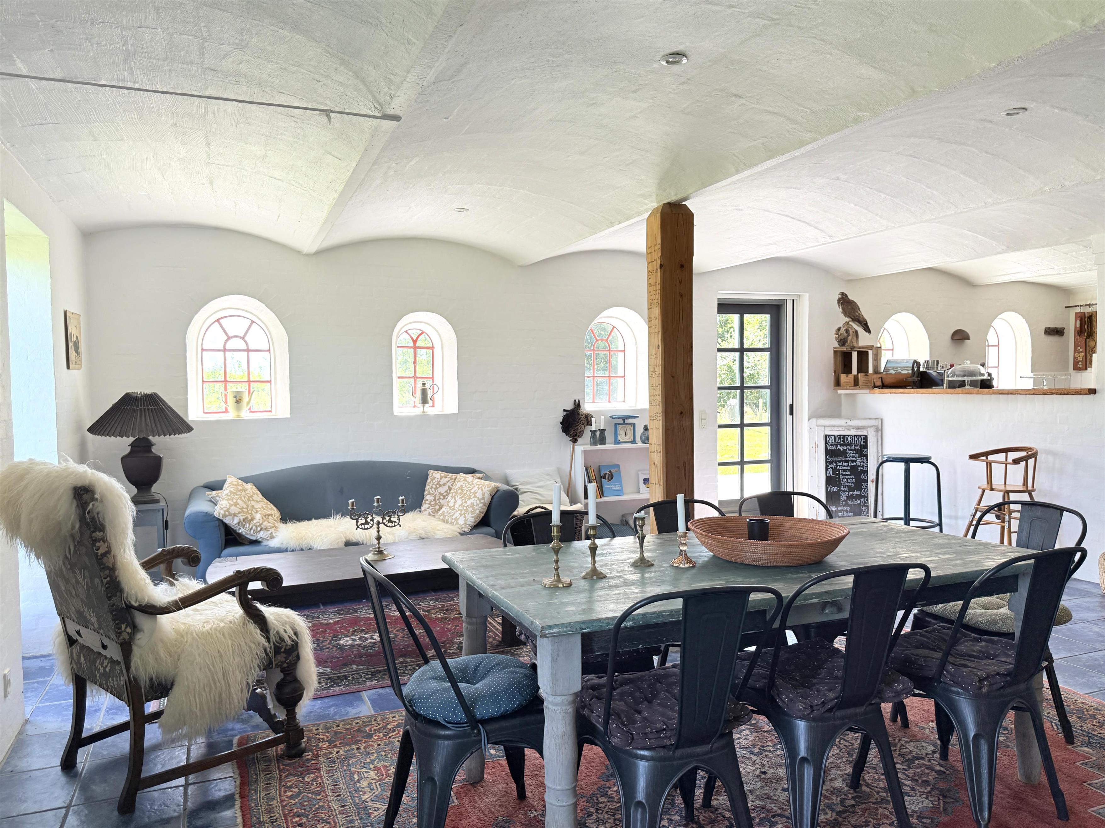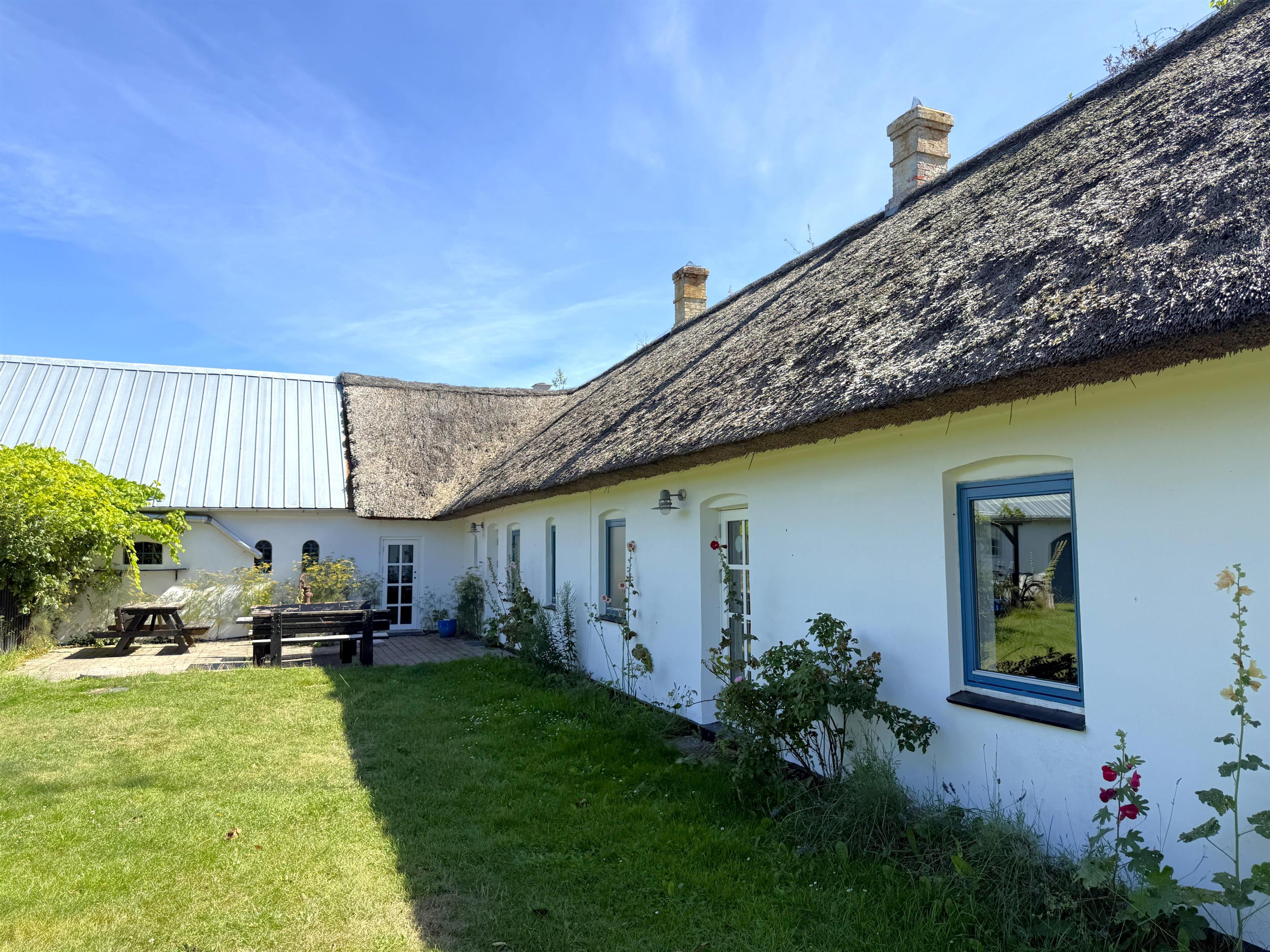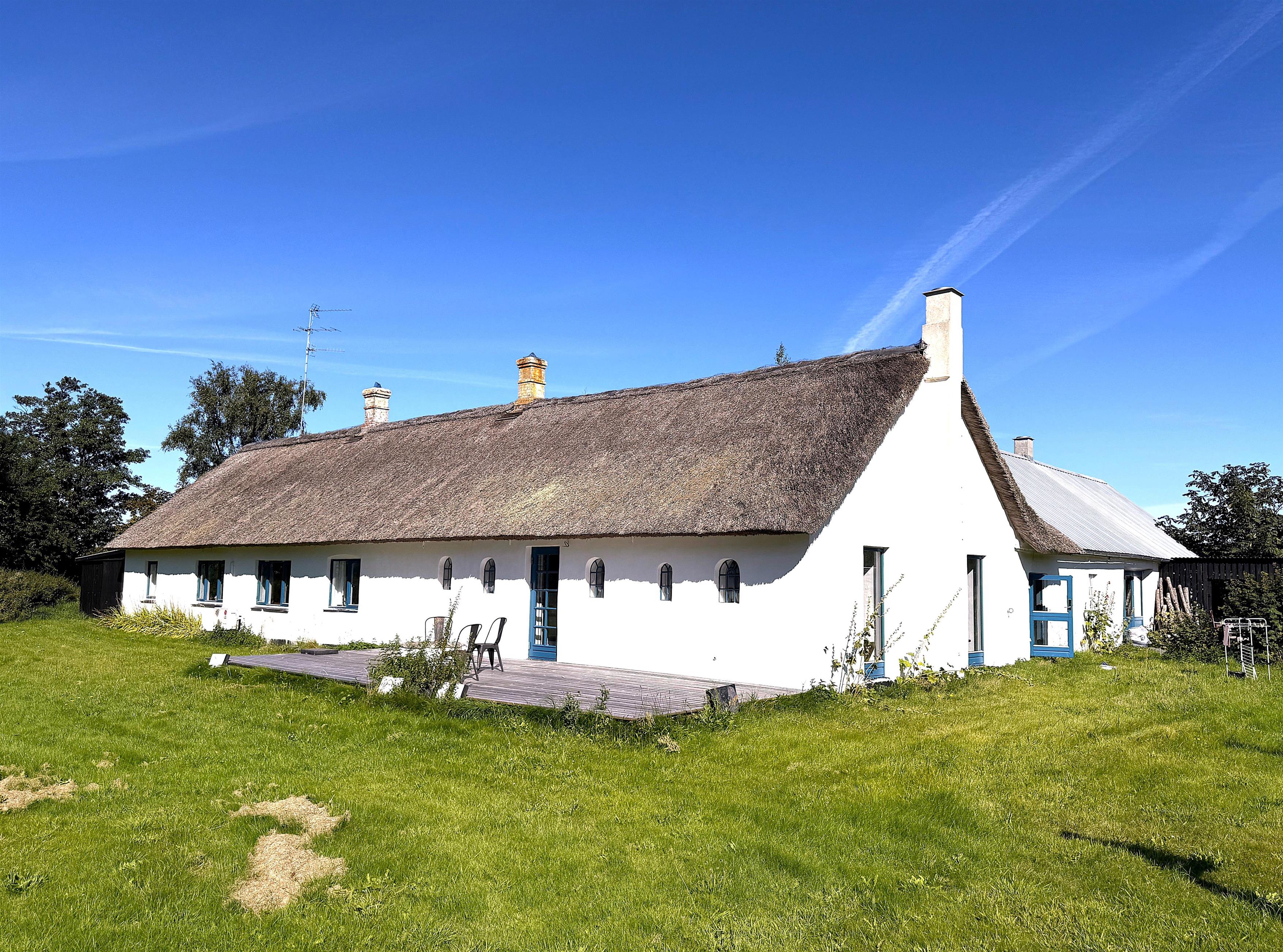Gården har god plads til familien, og man kan fordele sig på de mange værelser, der er til rådighed. Husets samlingspunkt er den store, hyggelige spisestue med køkken. Her er der mange kroge med behagelige møbler, spiseplads og åbent køkken. Fra spisestuen er der udgang til ny, lækker terrasse med solkroge og dejlig stor have. Den anden længe af gården har tre soveværelser, endnu en spisestue samt et stort, fint badeværelse. Der er to soveværelser med to enkeltsenge, et soveværelse med dobbeltseng samt et ekstra værelse med en enkeltseng. Fra denne længe af gården kan man også gå ud i gårdhaven. Huset er udstyret med hele tre brændeovne, to i hver af stuerne samt i gangen.