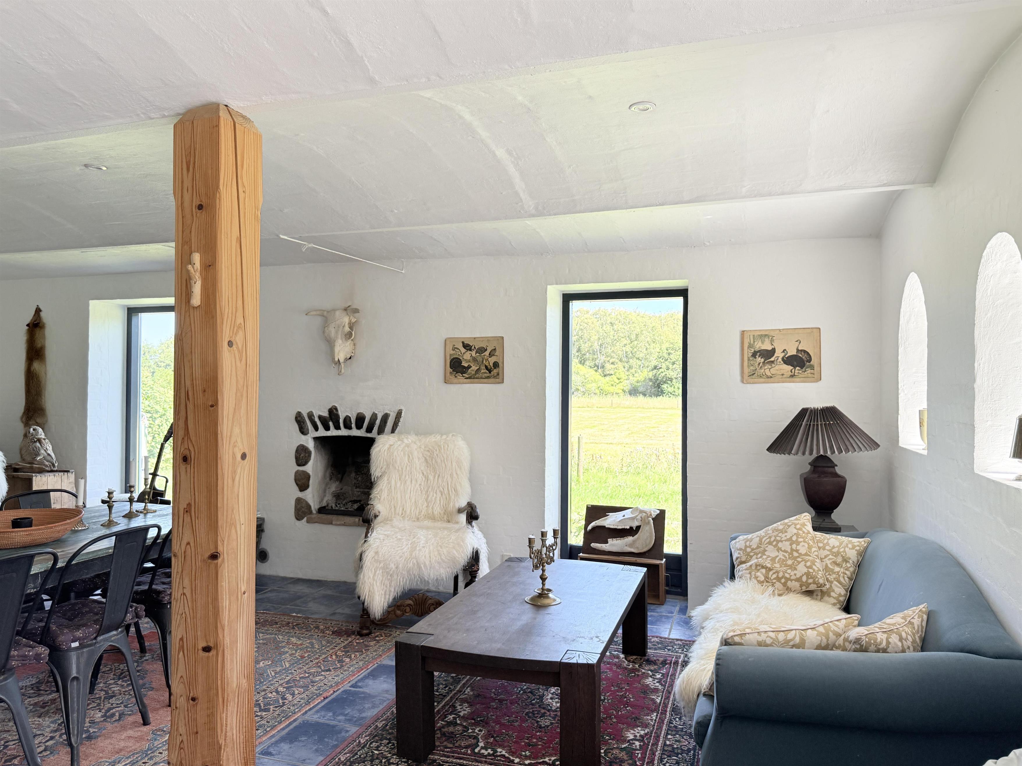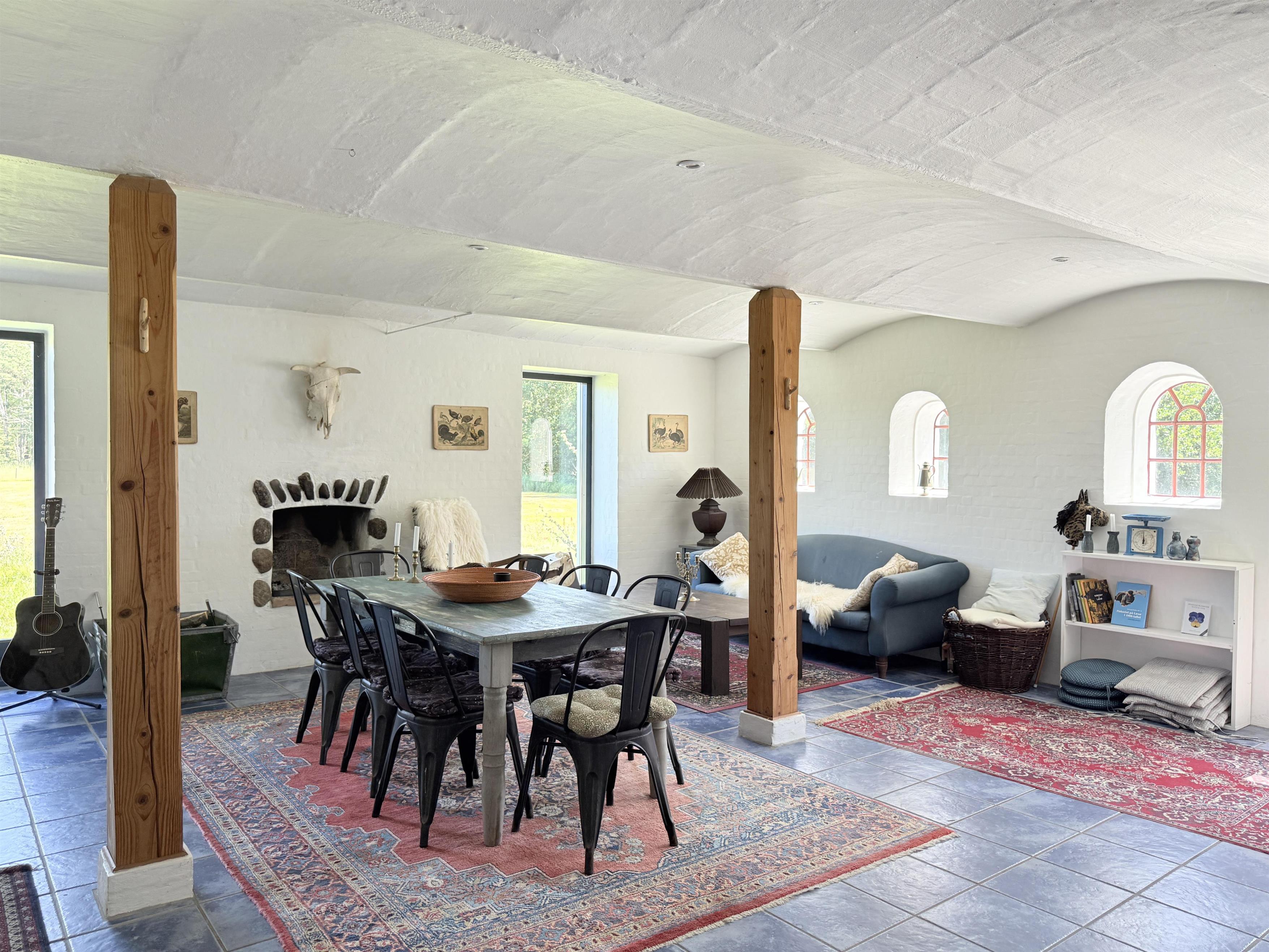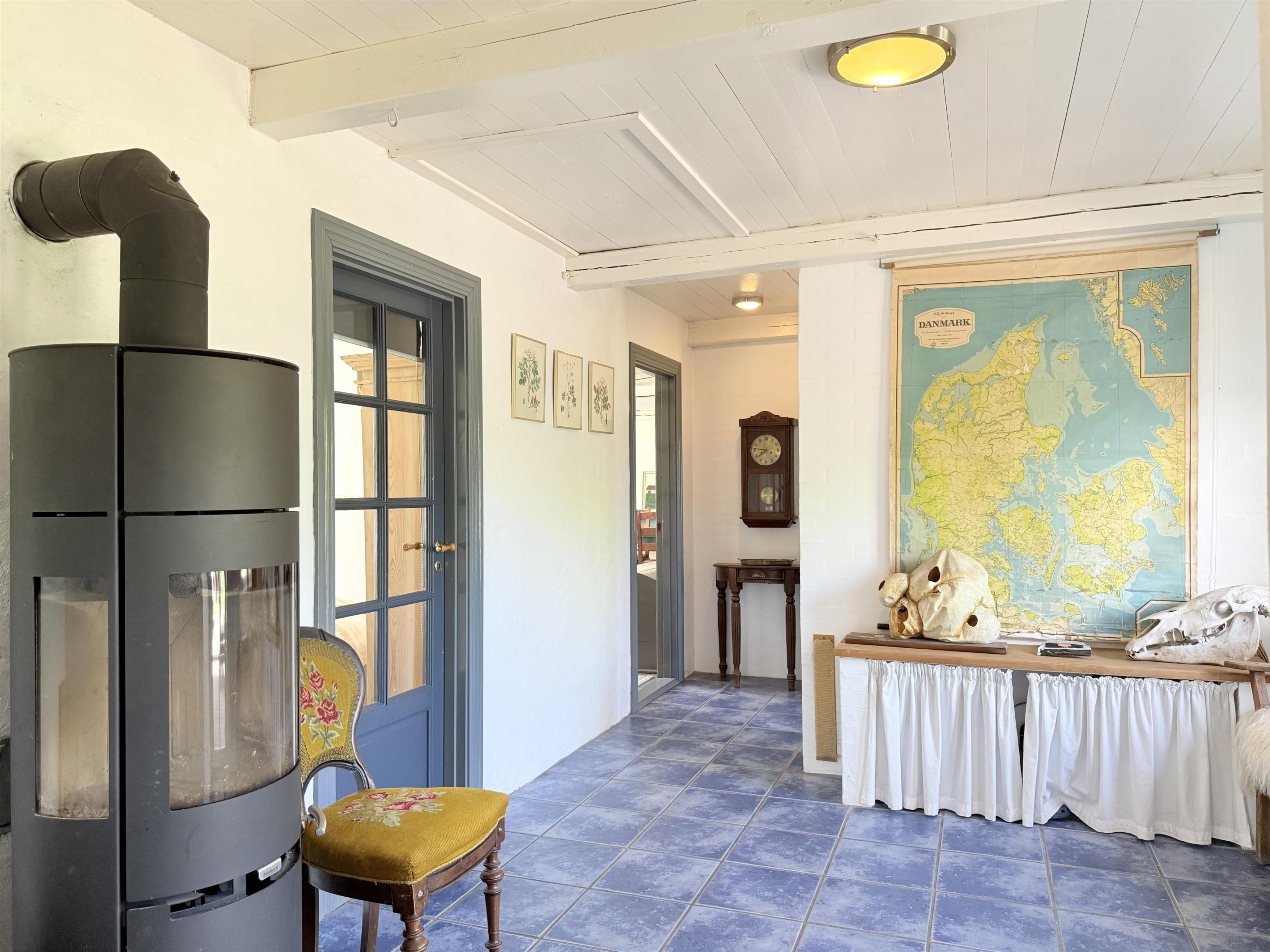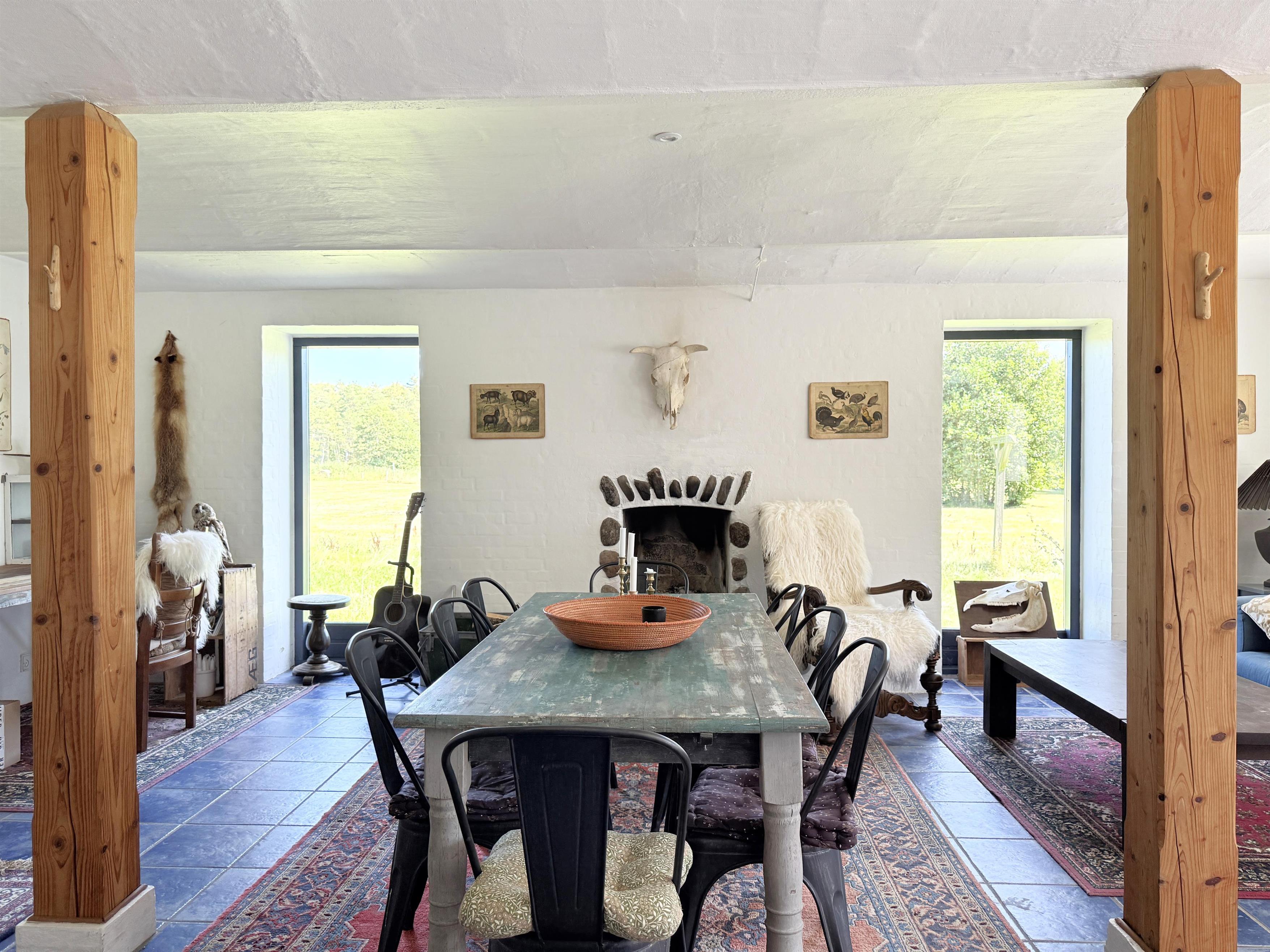 Gården har god plads til familien, og man kan fordele sig på de mange værelser, der er til rådighed. Husets samlingspunkt er den store, hyggelige spisestue med køkken. Her er der mange kroge med behagelige møbler, spiseplads og åbent køkken. Fra spisestuen er der udgang til ny, lækker terrasse med solkroge og dejlig stor have. Den anden længe af gården har tre soveværelser, endnu en spisestue samt et stort, fint badeværelse. Der er to soveværelser med to enkeltsenge, et soveværelse med dobbeltseng samt et ekstra værelse med en enkeltseng. Fra denne længe af gården kan man også gå ud i gårdhaven. Huset er udstyret med hele tre brændeovne, to i hver af stuerne samt i gangen.