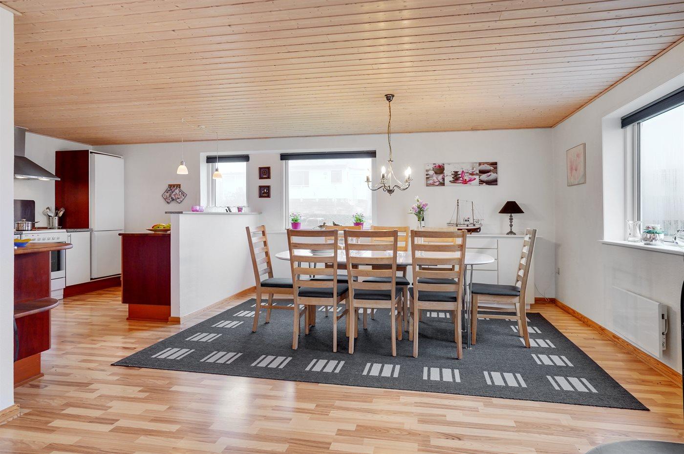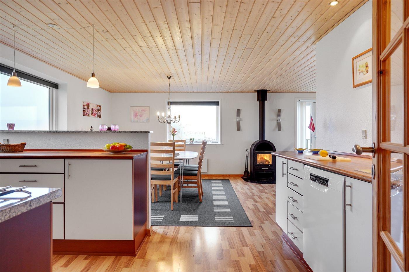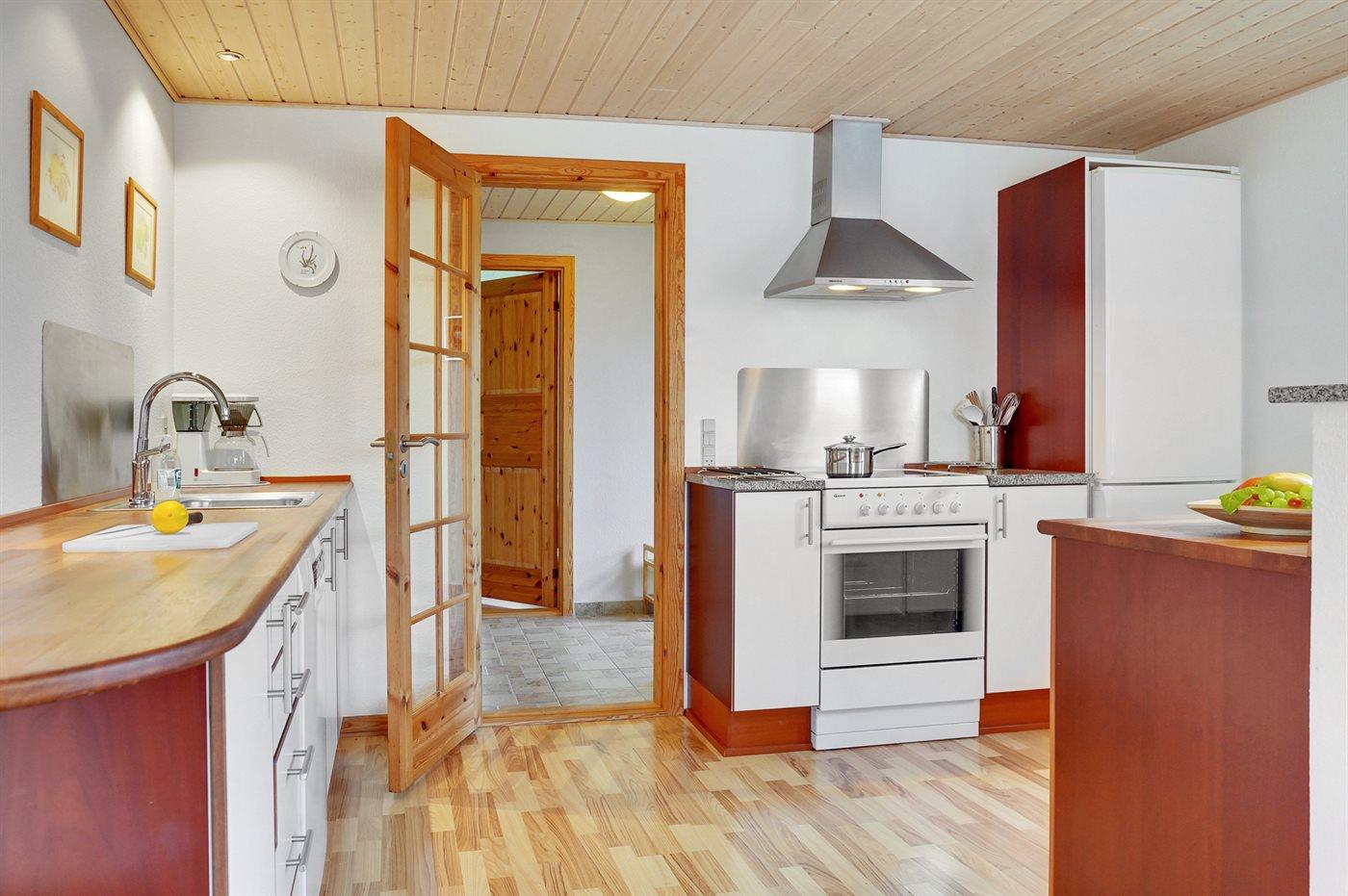 Køkkenet er udstyret med 1 køleskab. Der er 4 keramiske kogeplader, varmluftovn samt opvaskemaskine.