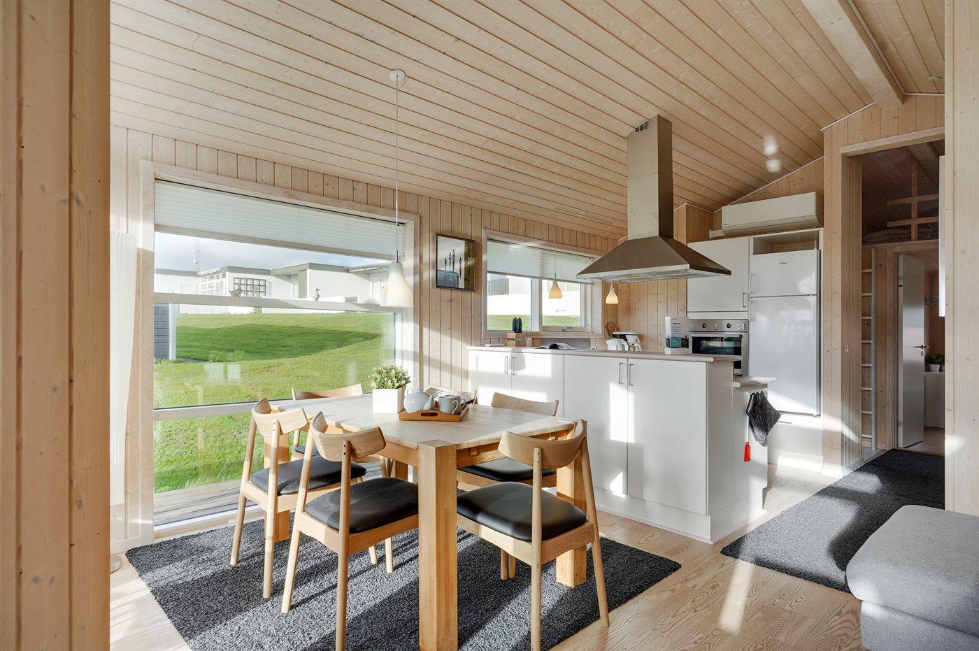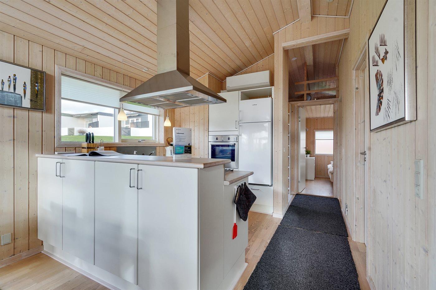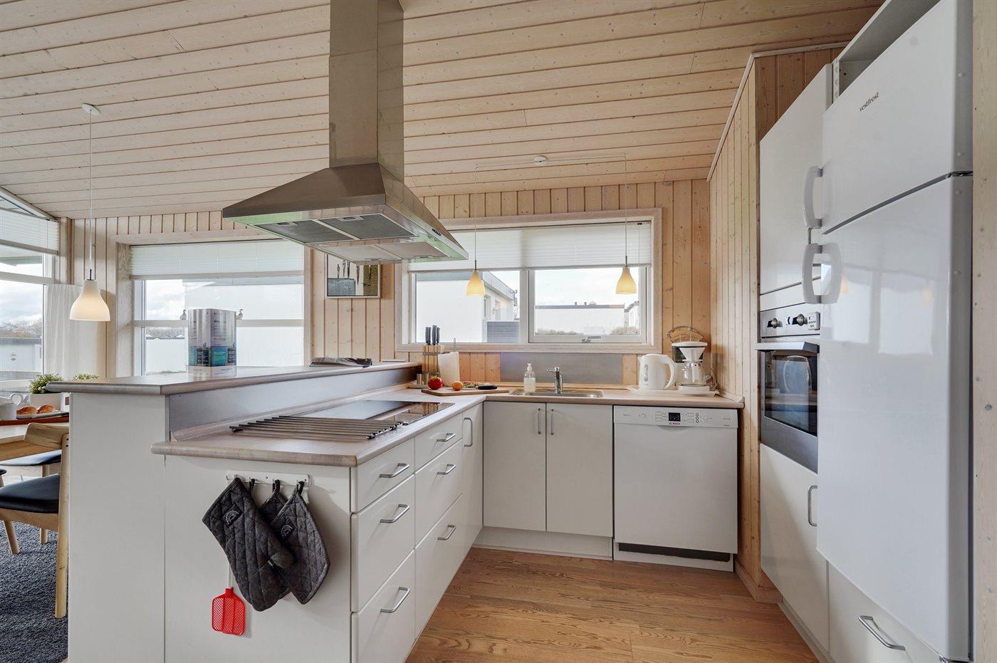 Køkkenet er udstyret med 1 køleskab. Der er 4 keramiske kogeplader, varmluftovn, mikrobølgeovn samt opvaskemaskine.