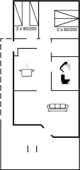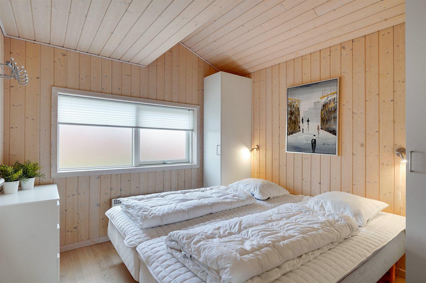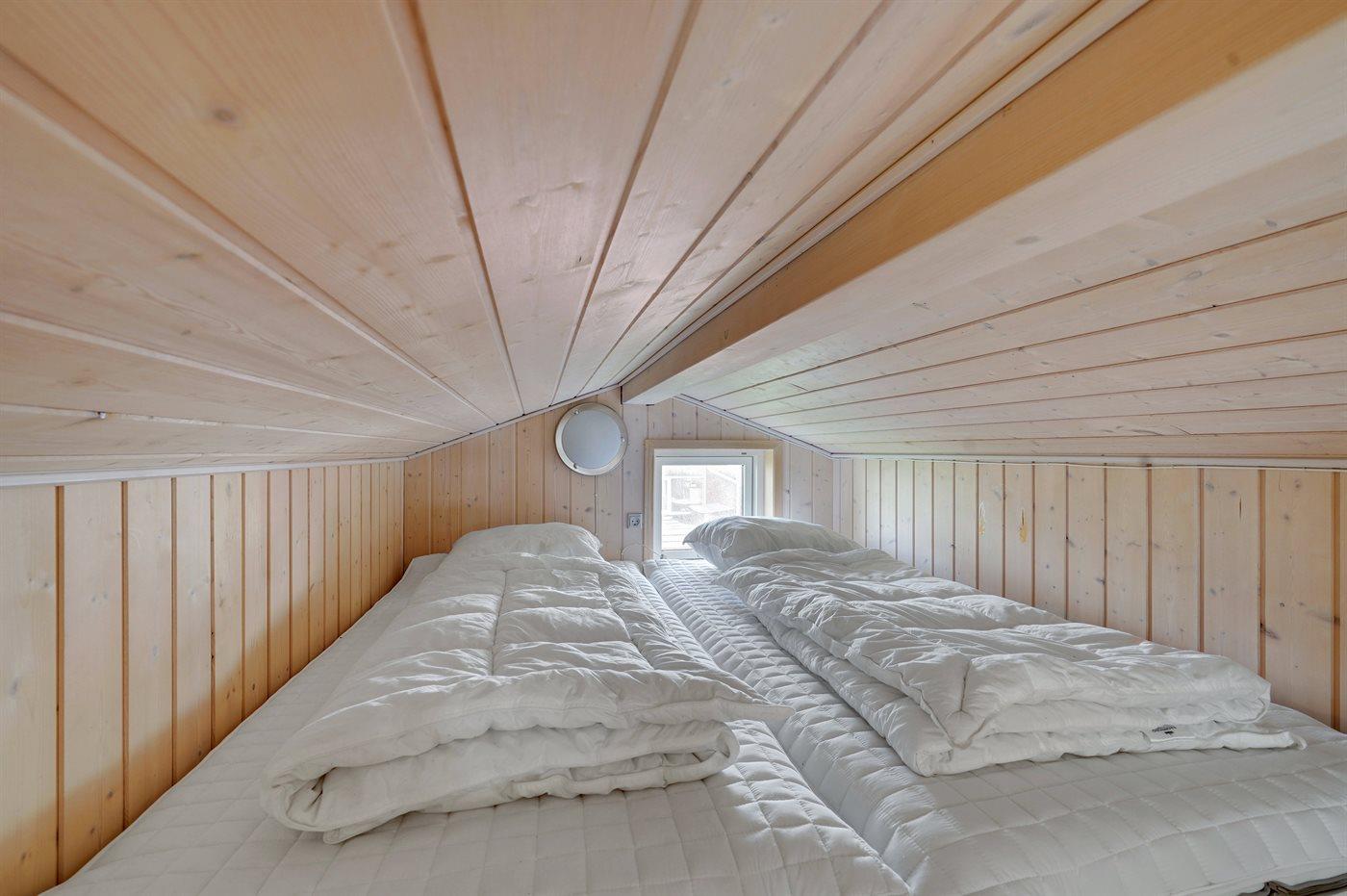 Der er i alt 2 soveværelser. Sovepladserne fordeler sig på: 2 sovepladser i dobbeltseng. 2 sovepladser i enkeltsenge. 2 sovepladser på madrasser. 2 af disse sovepladser befinder sig på husets hems. Derudover er der 1 stk. barneseng.